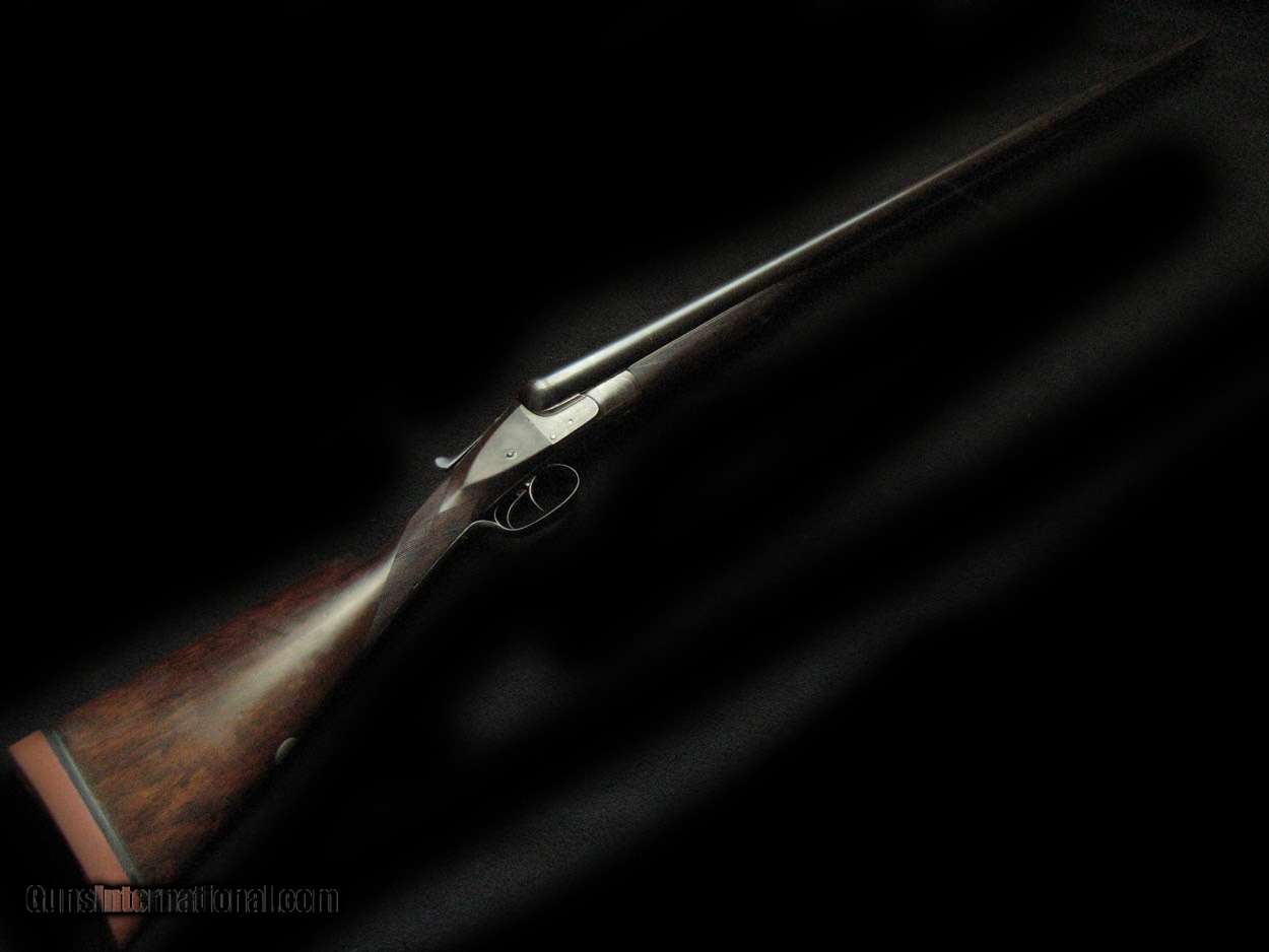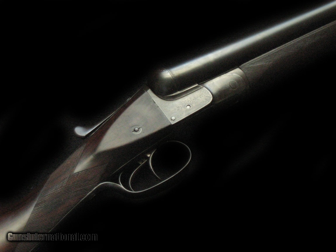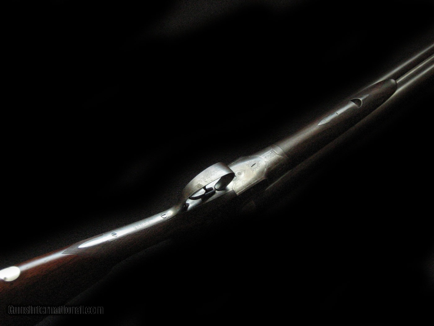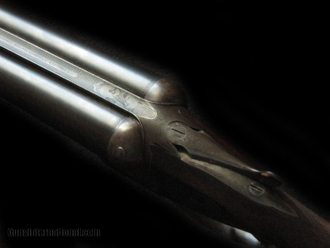 Description: Rare early (1897) mid-grade facile princeps extractor gun with nice stout "Wrought Steel" 30"x 2 3/4" barrels, bores bright both 740/795 (XF), pigeon depiction on rib, twin beads, and strong blacking. Cast off stock (RH moderate) with 14.5" pull thru new Silvers pad, drops 1 1/2" and 2", buttstock w fresh finish and checkering. Tight as rejointed, min walls 045 and 046, 7lb. In 25 years of collecting Greeners, I have seen only 5 Pigeon guns and 2 were later "Empire" guns. The third one was an "Emperor". This and a 10ga were the only FP I have seen. SOLD |