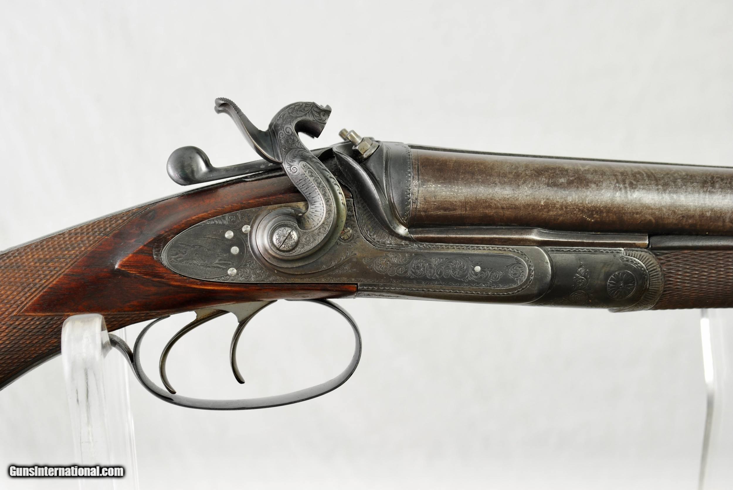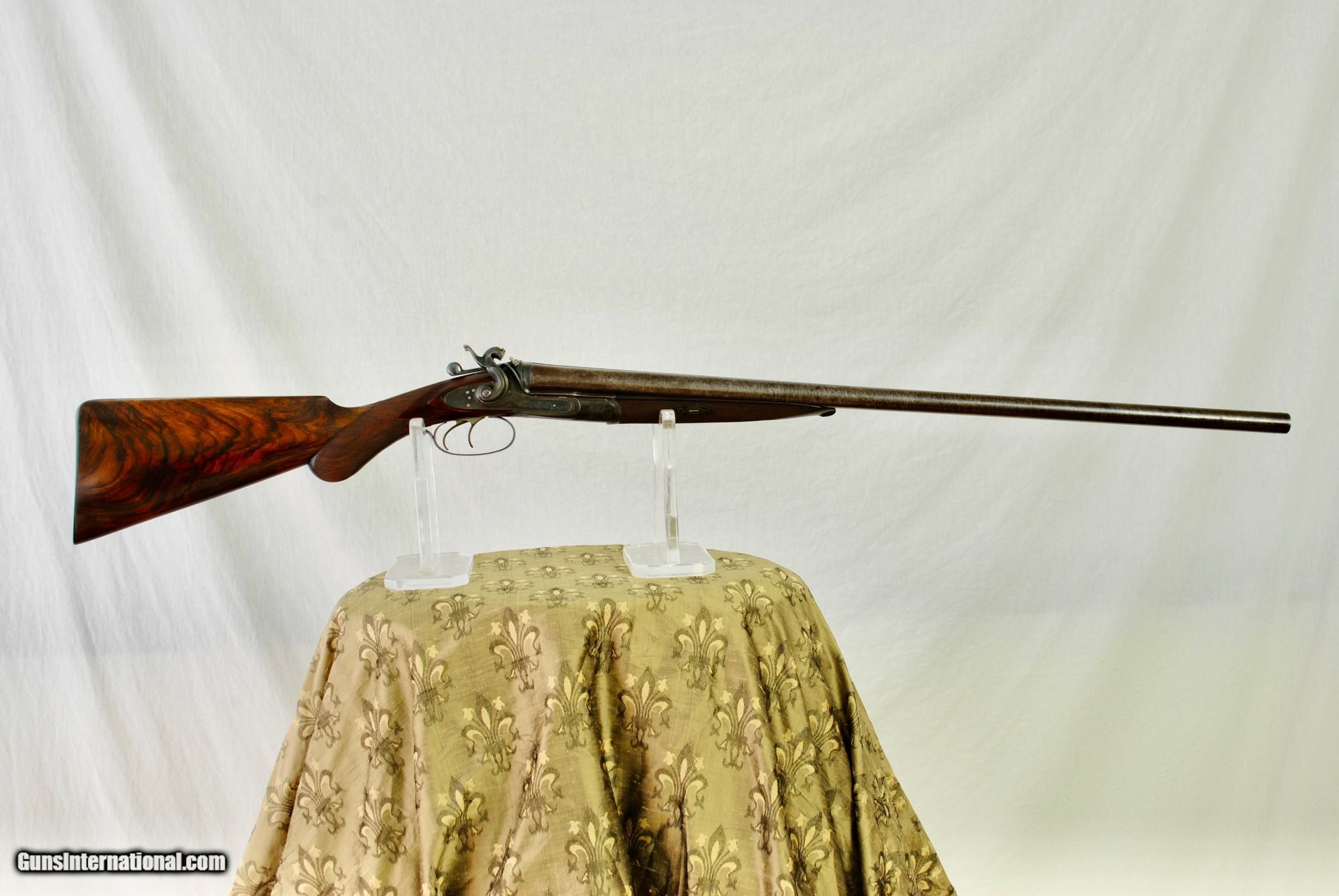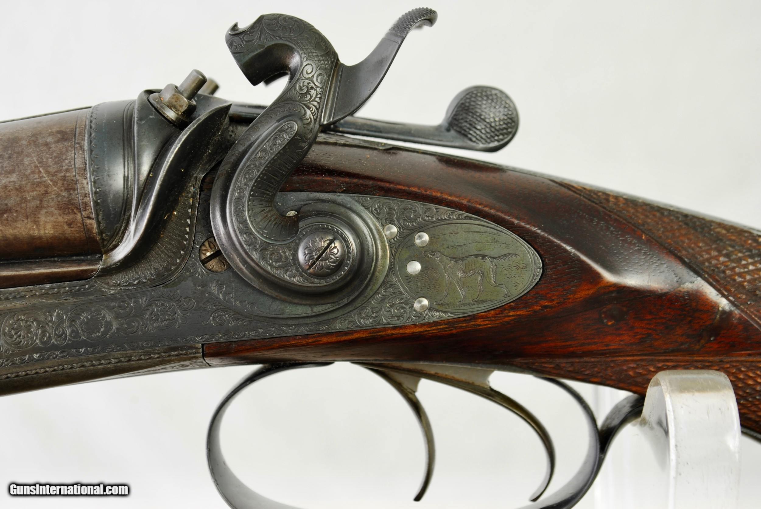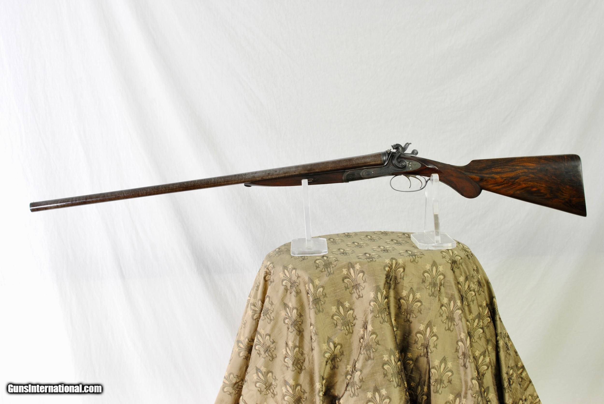 Description: William Greener was the founder of WW Greener and this gun was hand made by him in the early 1850's. Highly engraved with scroll and game scenes. Rebated locks with high sloping hammers that are non-rebounding. Mirror bores. Highly figured wood. Sharp checkering. Original barrel brown. Top rib is engraved - "William Greener - London - Laminated Steel Indestructable by Gunpowder". Barrels are 28 1/2" in length. Right bore measures .739 while left is .738. Cylinder chokes in both barrels. Minimum wall thickness is 28/1000. Chambers as original at 2 1/2". Fully functional. Serial number of 5516. As an antique this gun can be shipped directly as local allows. Shipping is $50. SOLD Antique: Yes Shotgun Gauge: 12 Gauge |