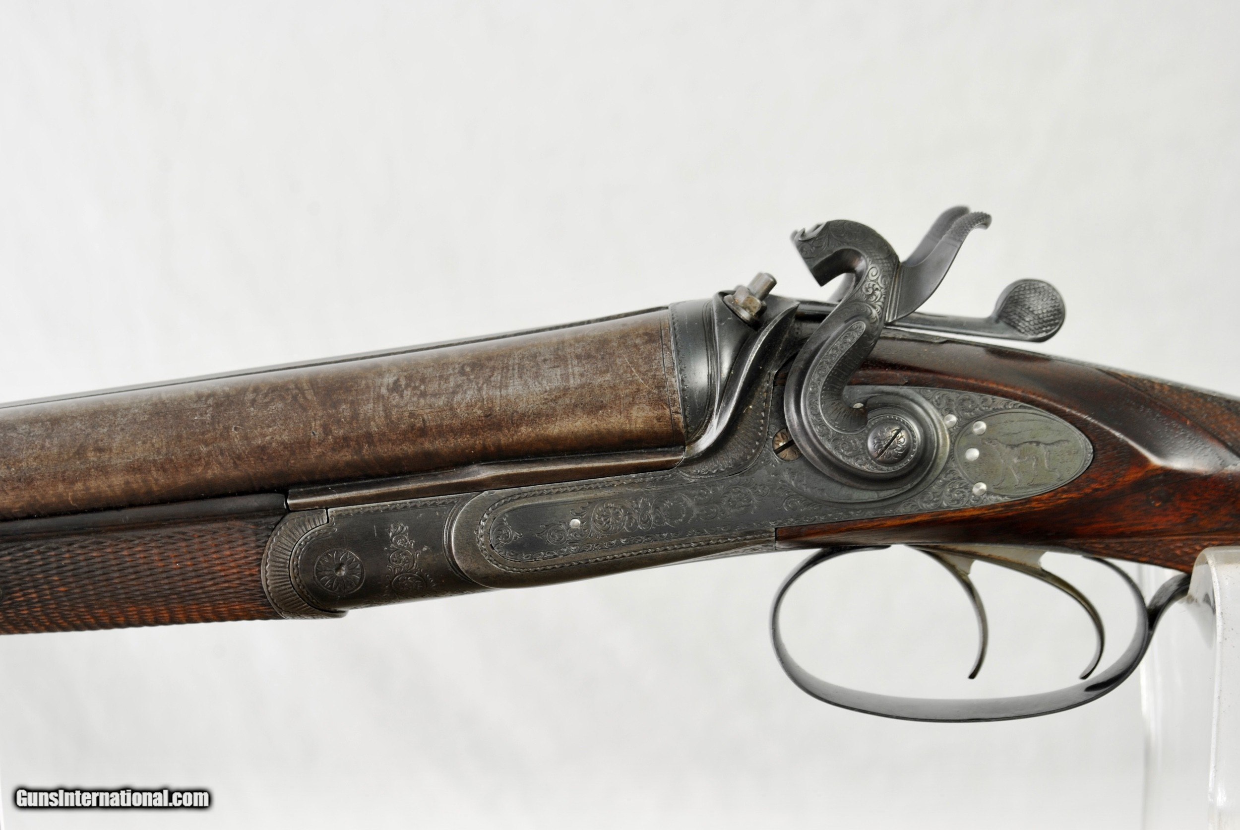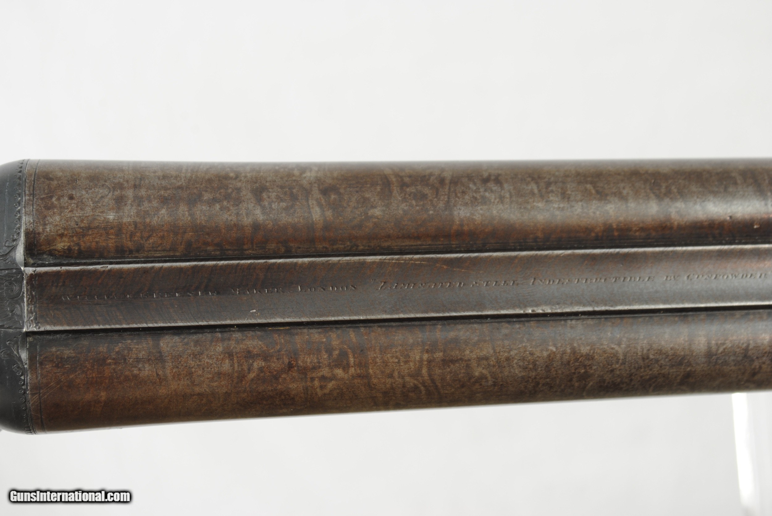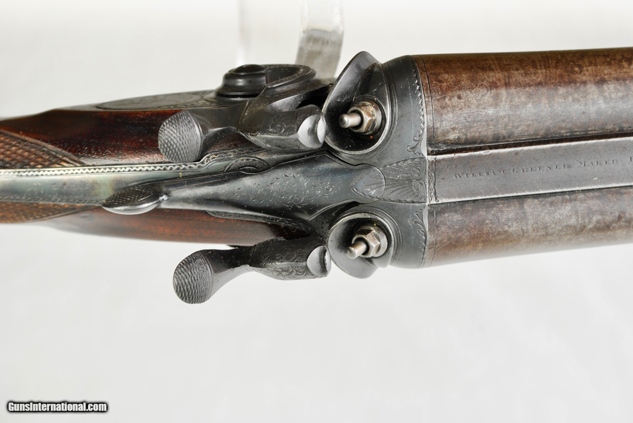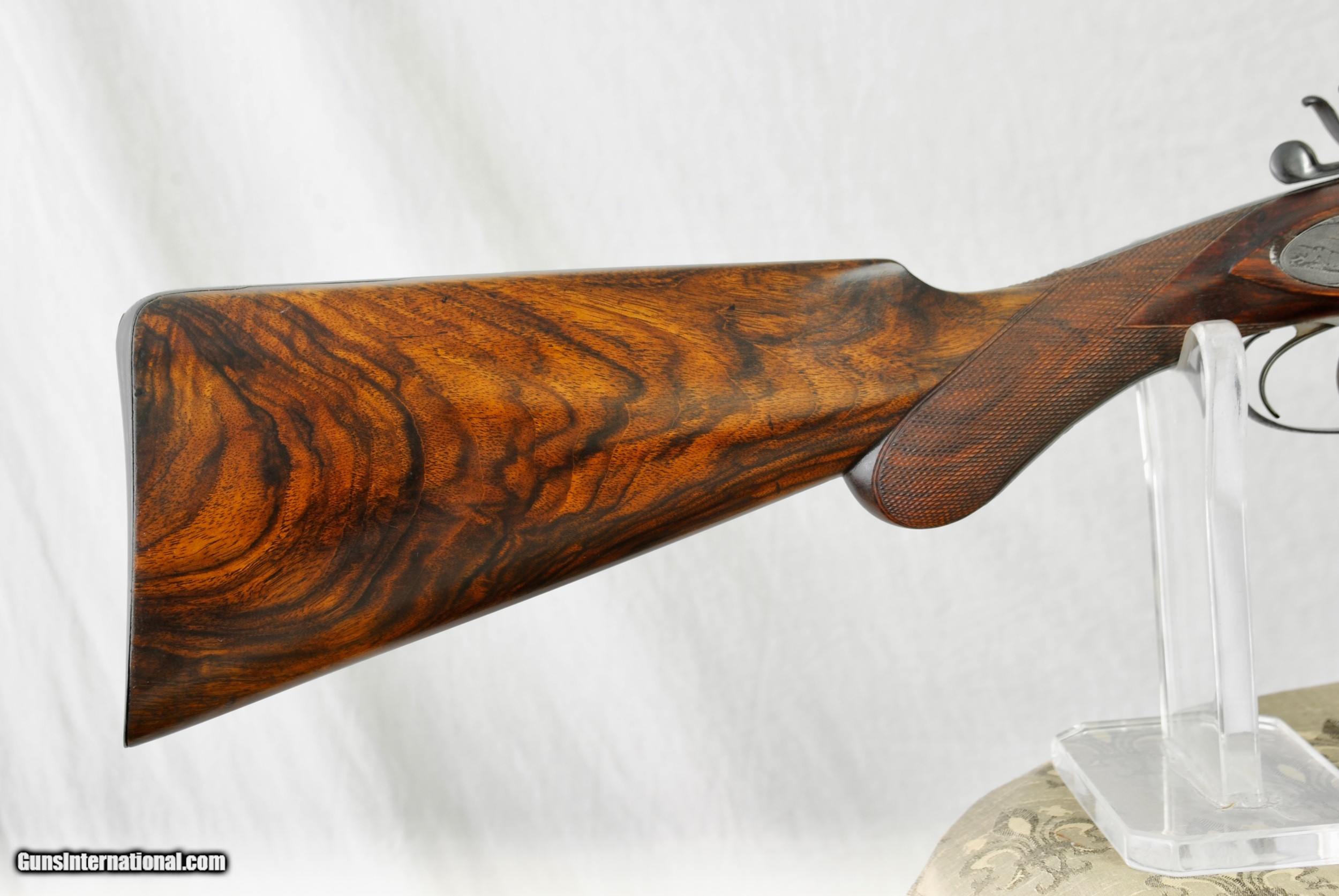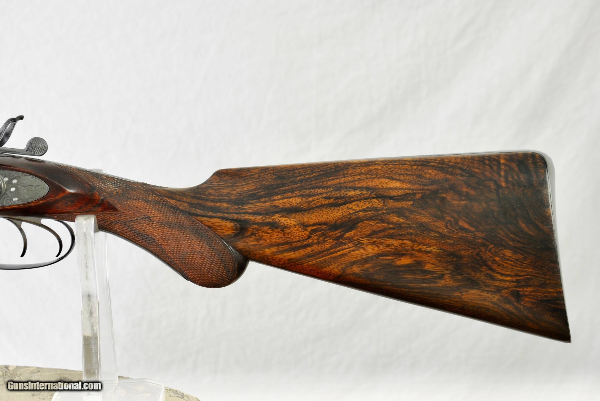 Description: William Greener was the founder of WW Greener and this gun was hand made by him in the early 1850's. Highly engraved with scroll and game scenes. Rebated locks with high sloping hammers that are non-rebounding. Mirror bores. Highly figured wood. Sharp checkering. Original barrel brown. Top rib is engraved - "William Greener - London - Laminated Steel Indestructable by Gunpowder". Barrels are 28 1/2" in length. Right bore measures .739 while left is .738. Cylinder chokes in both barrels. Minimum wall thickness is 28/1000. Chambers as original at 2 1/2". Fully functional. Serial number of 5516. As an antique this gun can be shipped directly as local allows. Shipping is $50. SOLD Antique: Yes Shotgun Gauge: 12 Gauge |