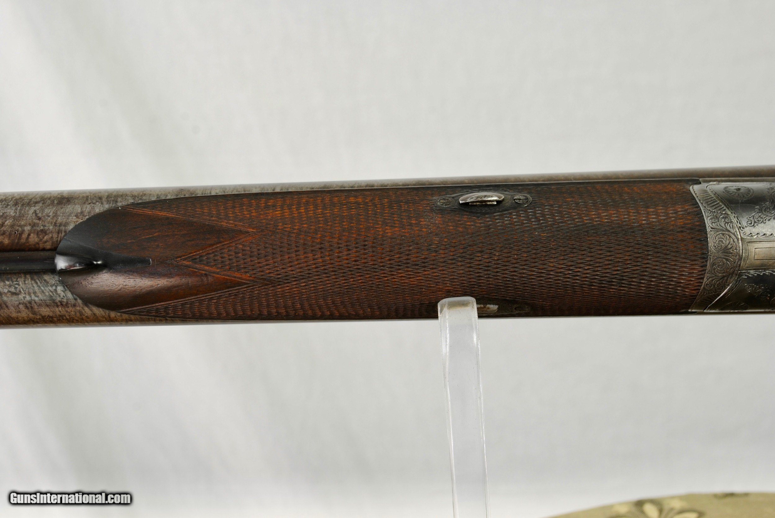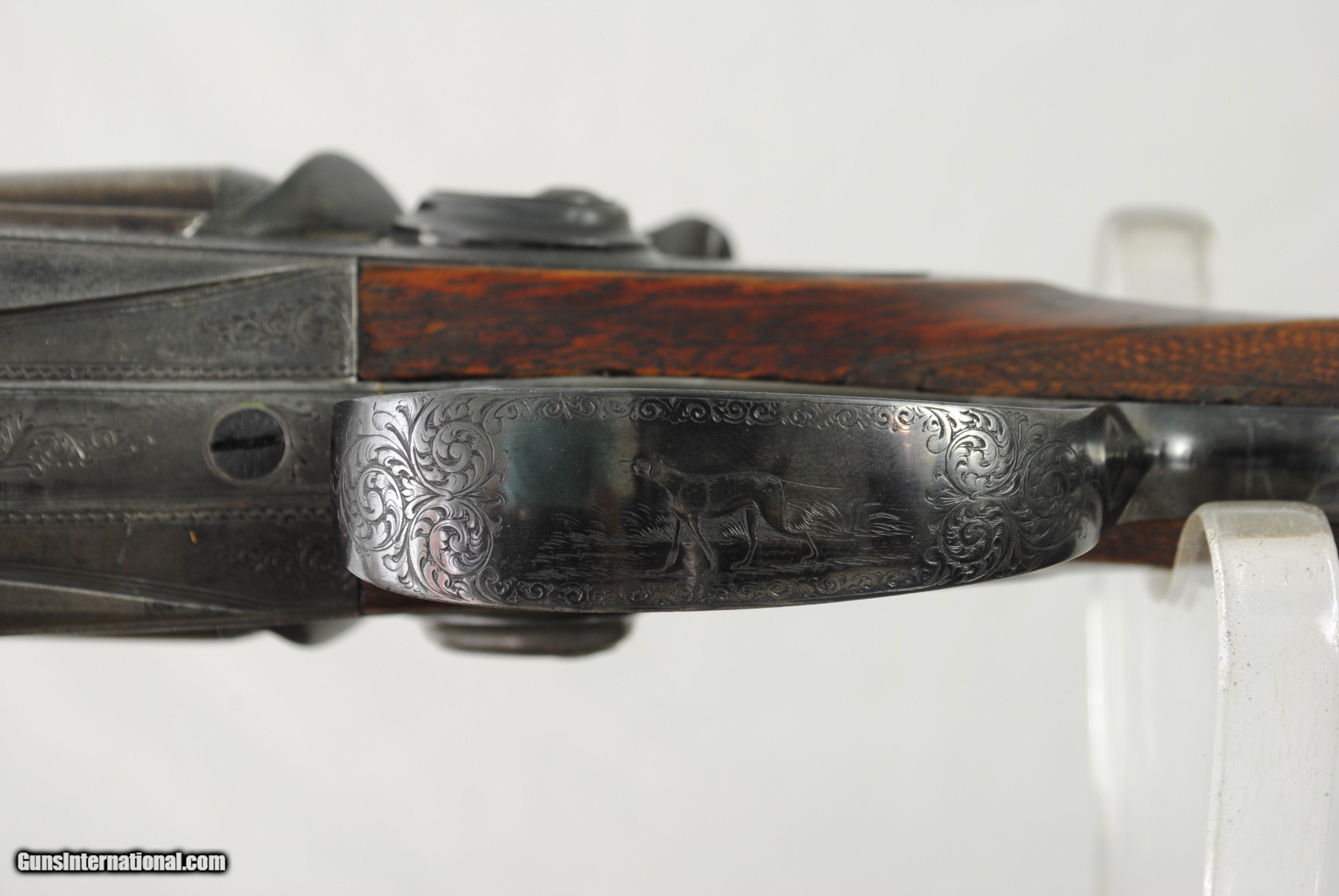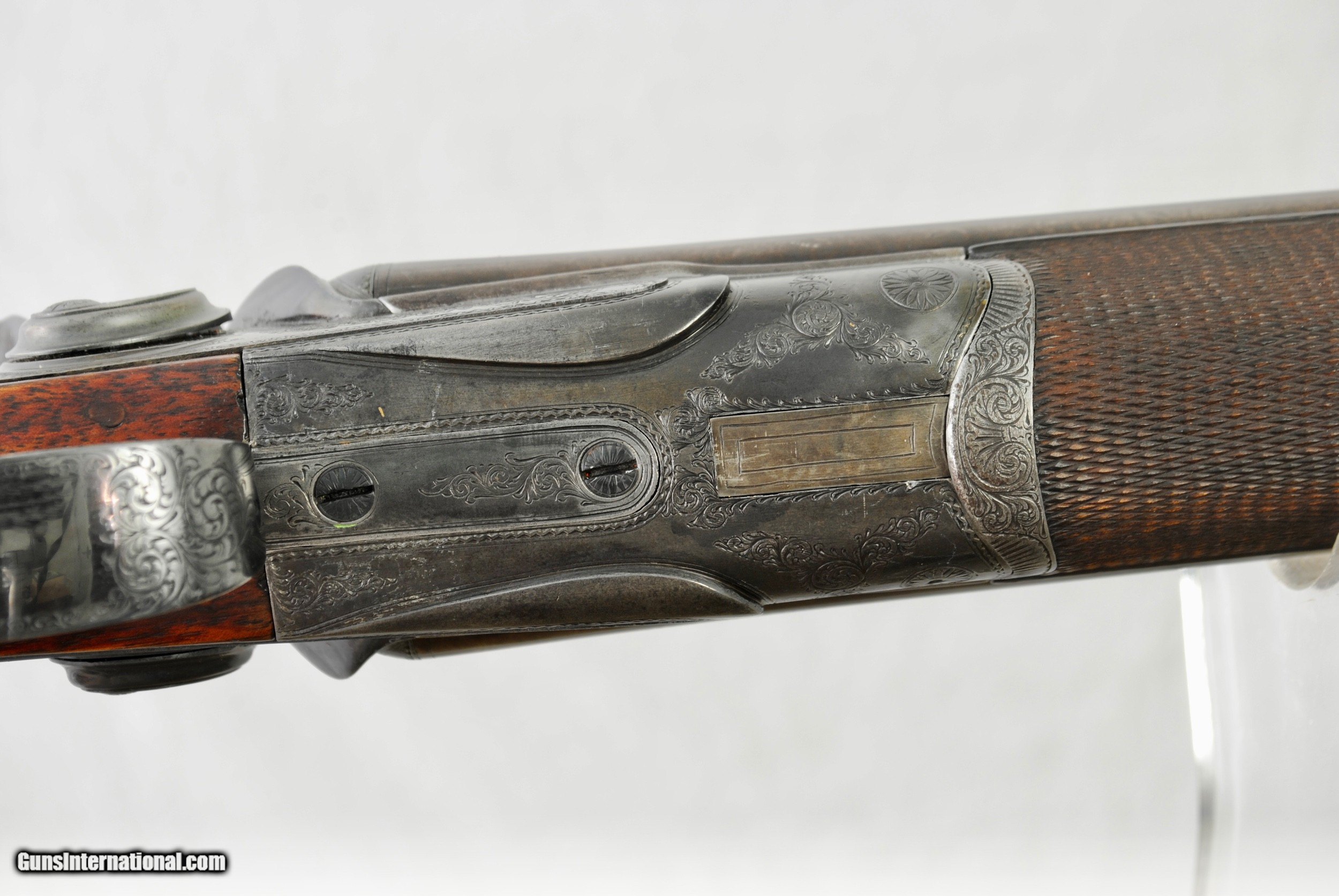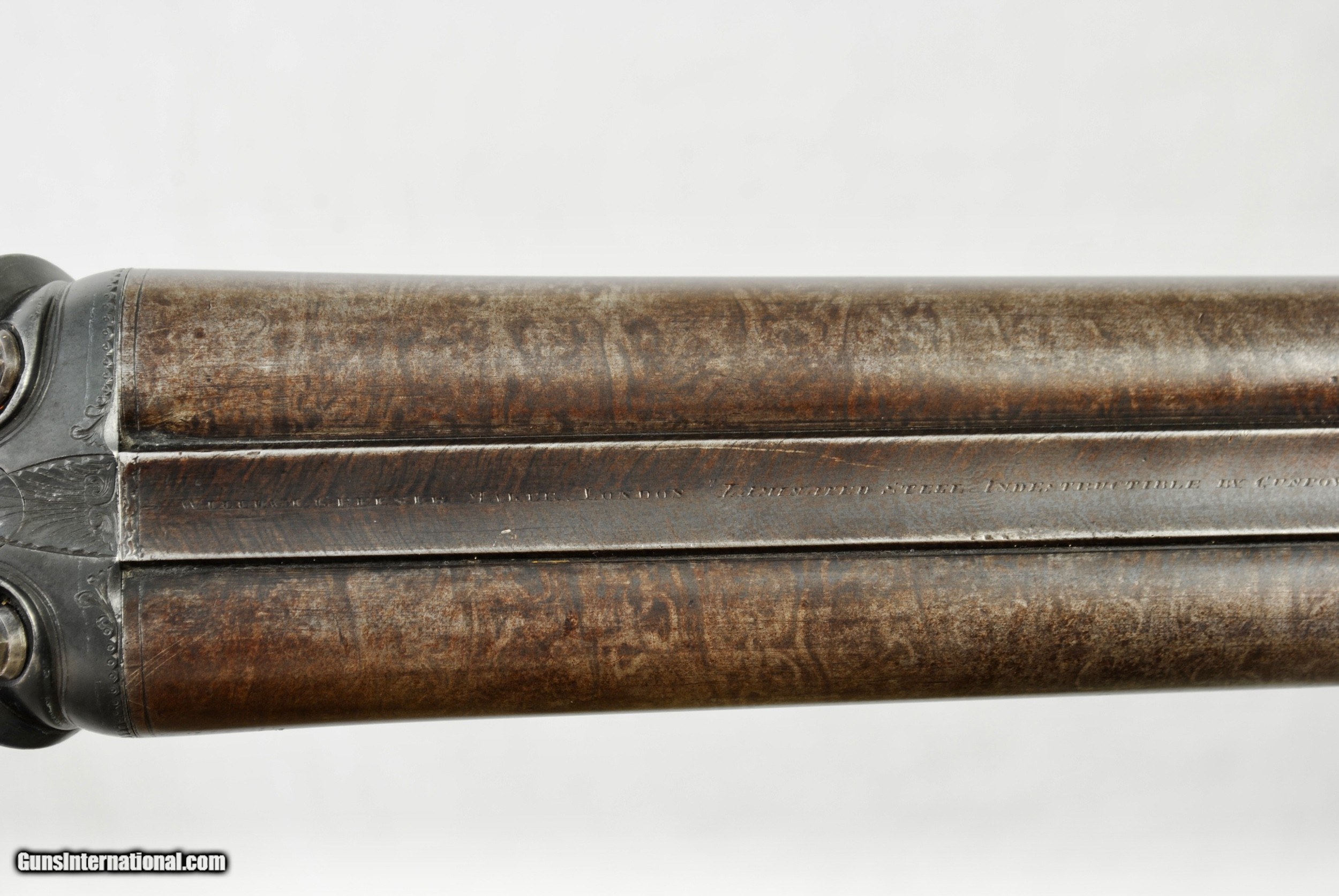 Description: William Greener was the founder of WW Greener and this gun was hand made by him in the early 1850's. Highly engraved with scroll and game scenes. Rebated locks with high sloping hammers that are non-rebounding. Mirror bores. Highly figured wood. Sharp checkering. Original barrel brown. Top rib is engraved - "William Greener - London - Laminated Steel Indestructable by Gunpowder". Barrels are 28 1/2" in length. Right bore measures .739 while left is .738. Cylinder chokes in both barrels. Minimum wall thickness is 28/1000. Chambers as original at 2 1/2". Fully functional. Serial number of 5516. As an antique this gun can be shipped directly as local allows. Shipping is $50. SOLD Antique: Yes Shotgun Gauge: 12 Gauge |