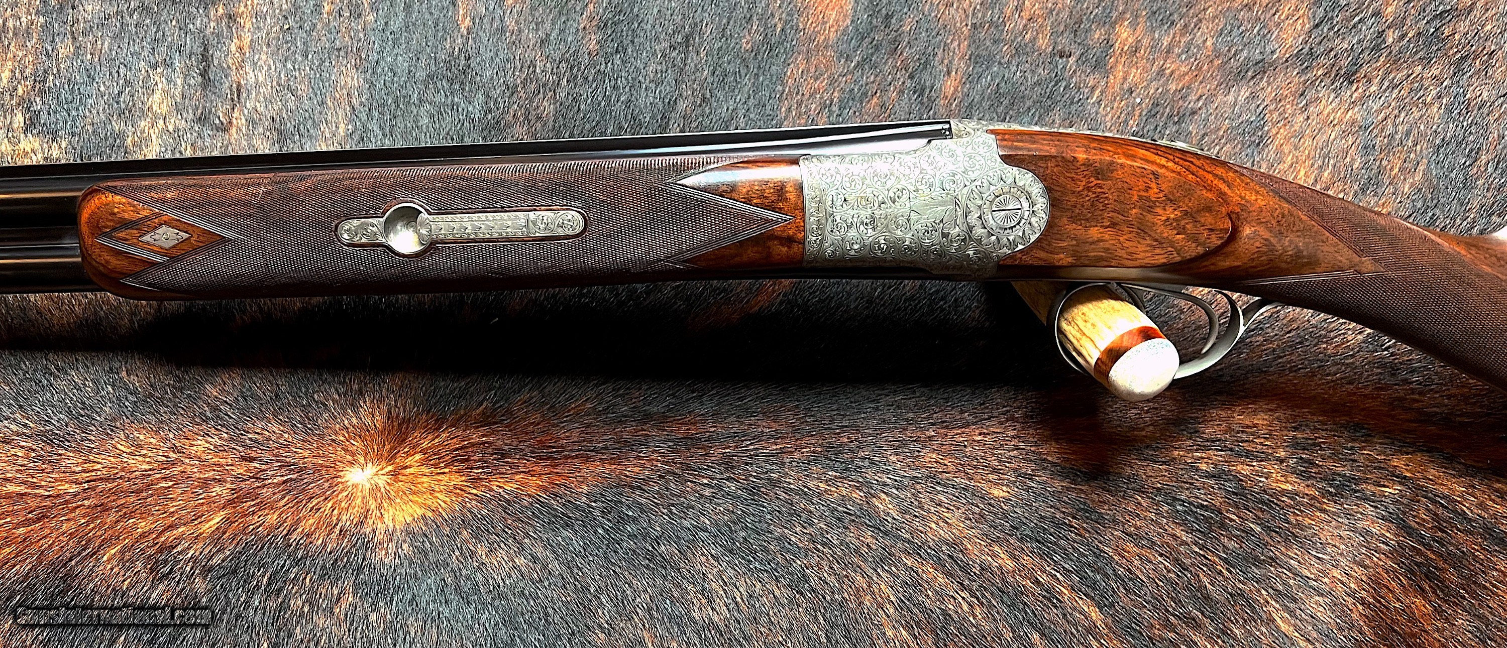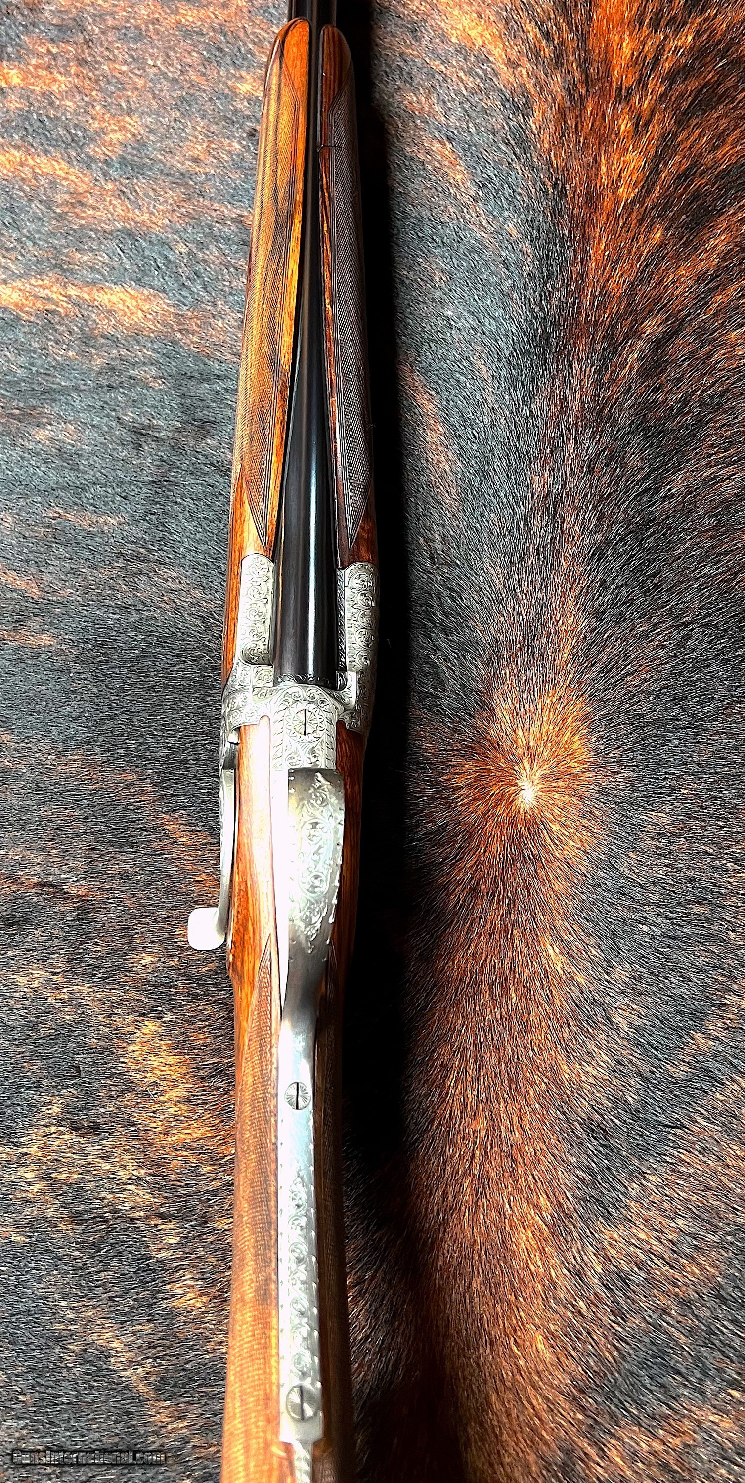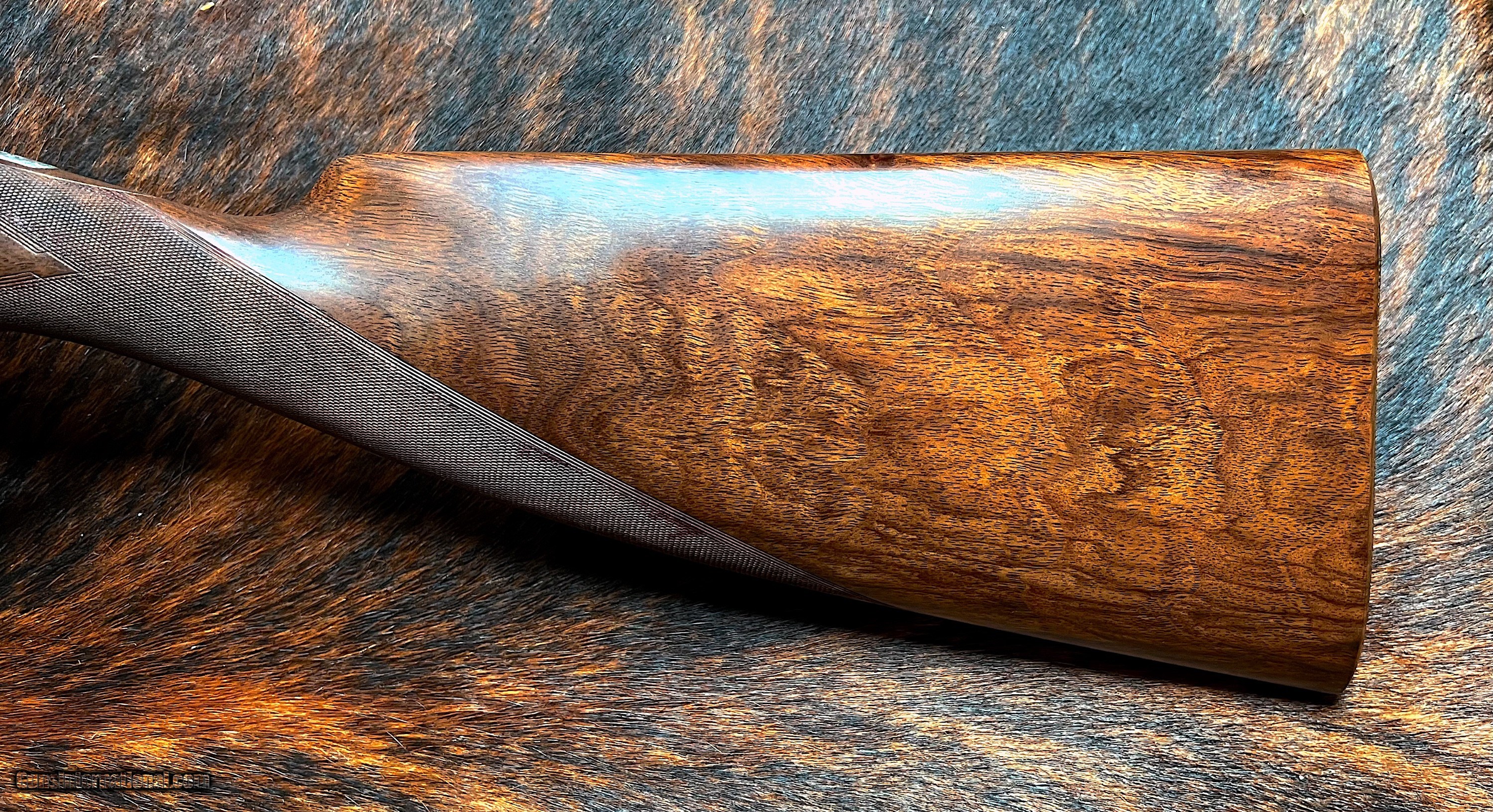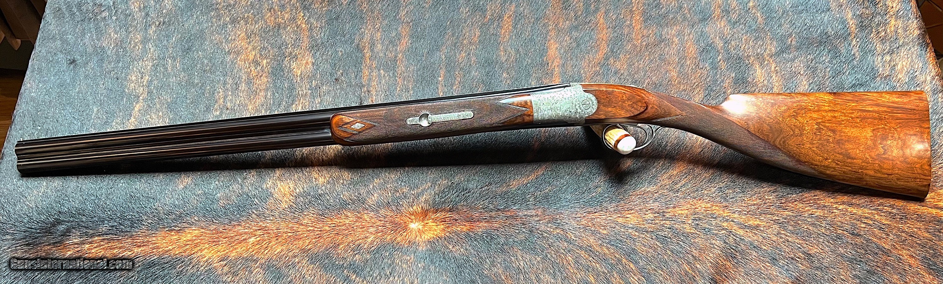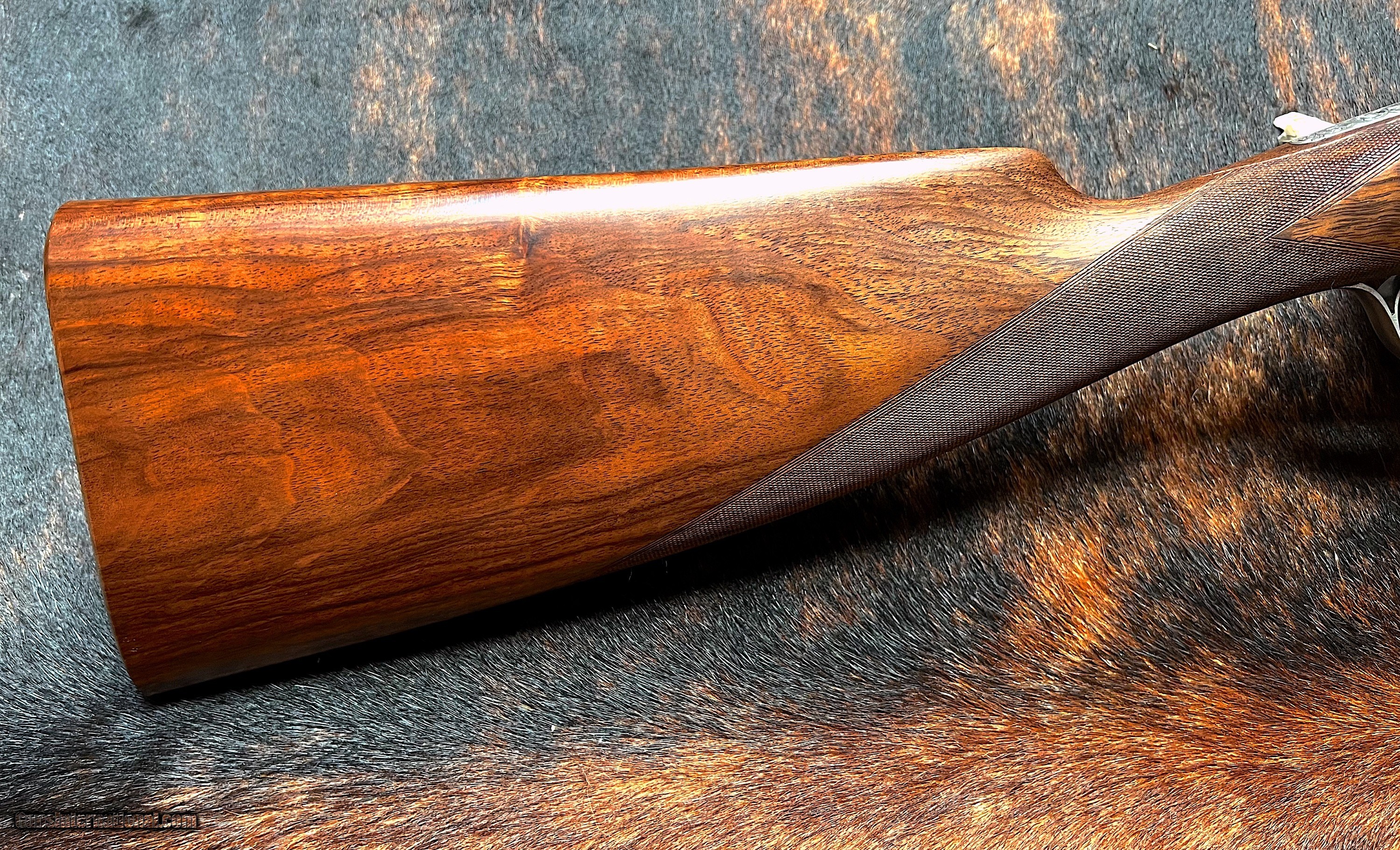 Description: The Britte gunmaking company built SuperBrittes from 1932 to 1936. Only 250 of them were completed. Sometime in the 1990s, Griffin & Howe acquired a small collection of finished SuperBritte OUs plus several 12-gauge SuperBritte action/barrel sets. SOLD Shotgun Gauge: 16 Gauge Manufacturer: Griffen & Howe Model: Super Britte Serial Number: 191 Barrel Length: 27 1/2 Chambers: 2 3/4 Ejectors: Yes Condition: Outstanding Metal Condition: 98% Wood Condition: 98% Bore Condition: Barely Fired Triggers: Double Stock: Perch Belly Stock Comb: 1 1/4 Stock Heel: 1 3/4 LOP: 14 1/4 Engraving: Scroll |