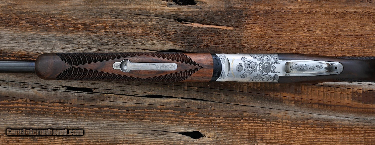 Description: Griffin & Howe - Silver Ram Sporting - 20 ga - Item Number: GRI235814 Shotgun type: O&U Action: Boxlock Ejectors: Yes Trigger: single selective, detachable Grip: Pistol Grip Forend: Checkered Lop: 14 1/4 " Pad thickness: 0.75 " Type of butt: Factory Pad Drop comb: 1 3/8 " Drop heel: 2 " Cast amount: 1/8 " Cast: Off Weight: 7 lbs, 4 oz Manufactured in: Italy Manufacture Year: 2006Finish: bright brush Overall condition: Very Good Stock condition: Very Good Metal condition: Very Good Stock: Original finish Metal: Original finish Type of Case: Maker's Lockable Hard Plastic Case Extra barrels: 0 Barrel info: Gauge: 20 ga Chamber: 3 " Length: 30 " Chokes: 5 Factory Chokes Proof: 6800 BAR " Rib type: matted vent rib Comments : Beautiful lines provide dynamic handling. Removable Trigger Group, Proofed to 6800 BAR. Some light handling marks. SG-89 C3 SOLD |