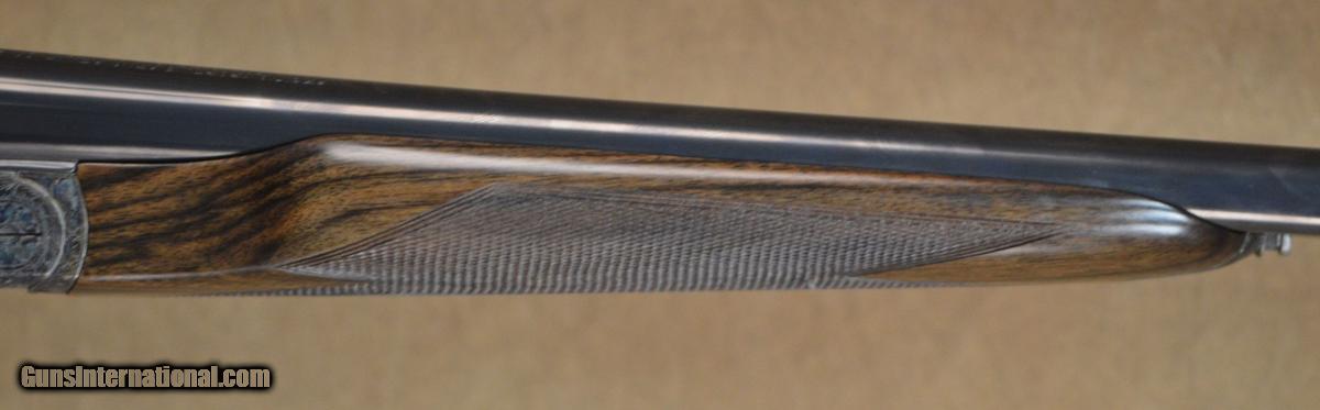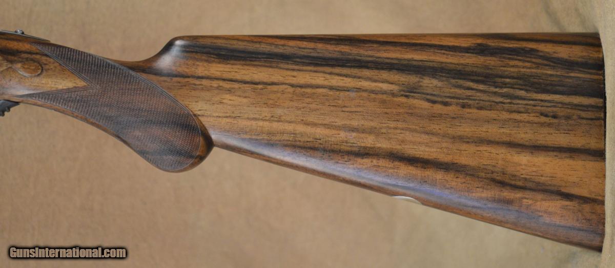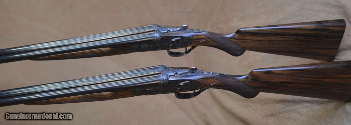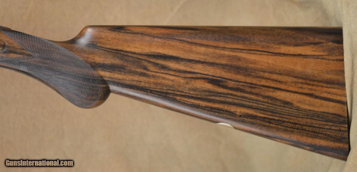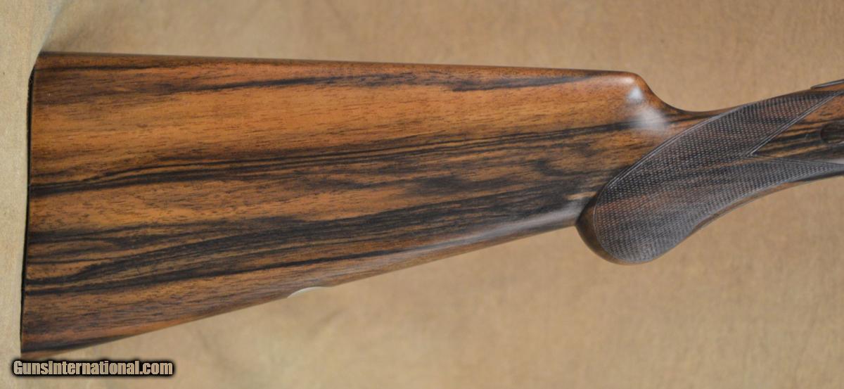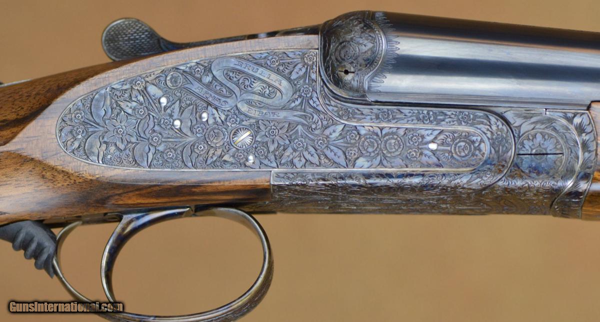 Description: New Matched Pair of Grulla 215 Game Guns, 20 Bore with 30" fixed choke (IC/M) barrels. Each gun features a single trigger, case-color hardened Square actions with hand-detachable side-locks, English Rose & Scroll engraving. Outstanding factory Prince-of-Wales pistol grip stocks to checkered butts and full beavertail forearms. Imported and configured by Pacific Sporting Arms. Includes factory leather motorcase. SOLD |
