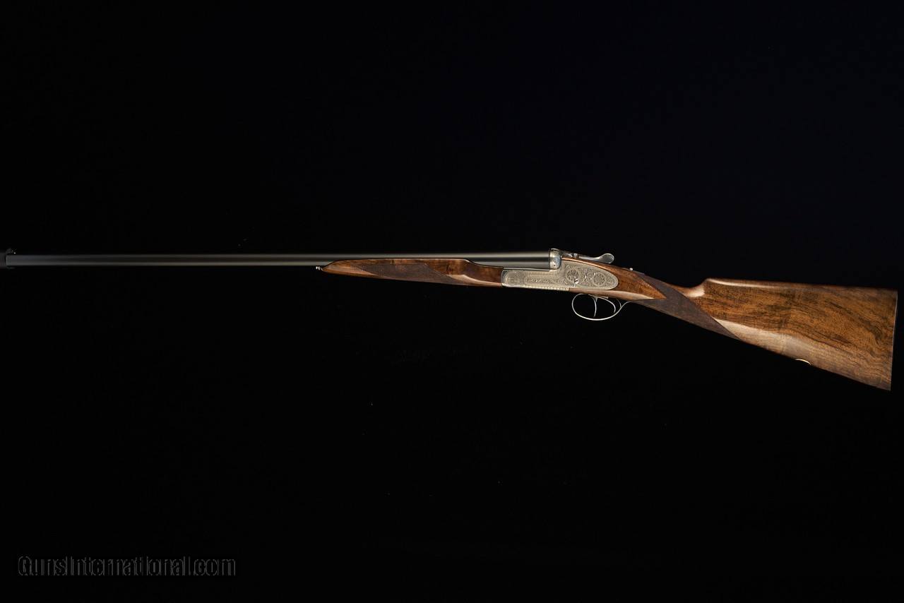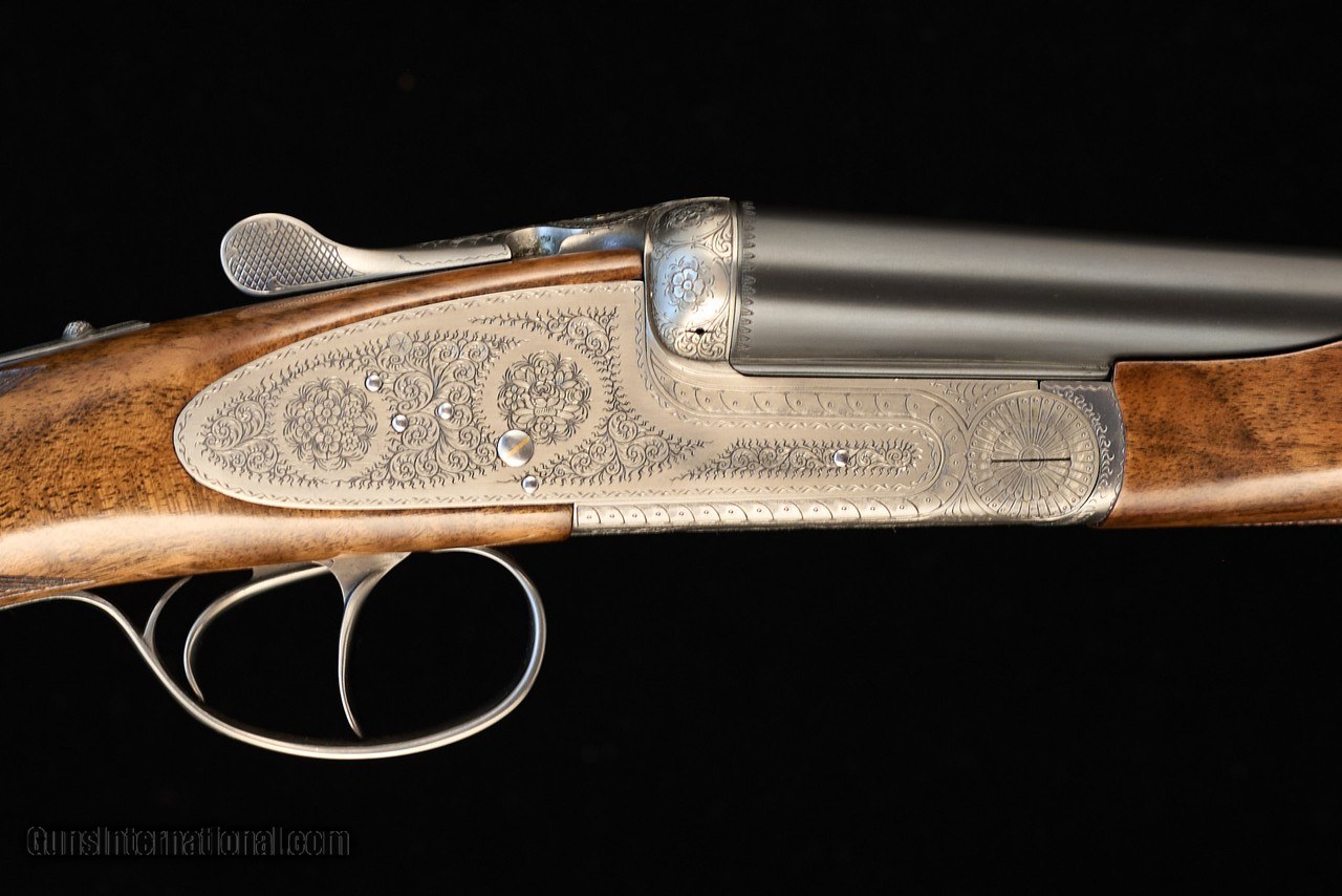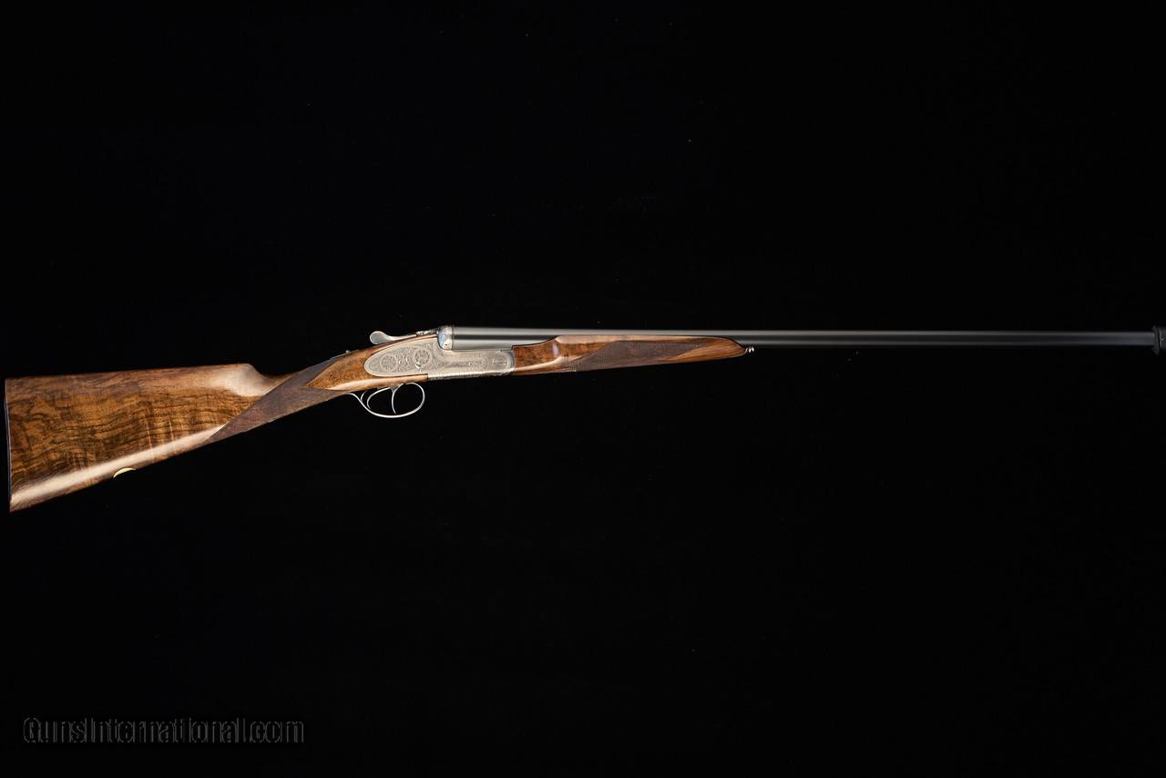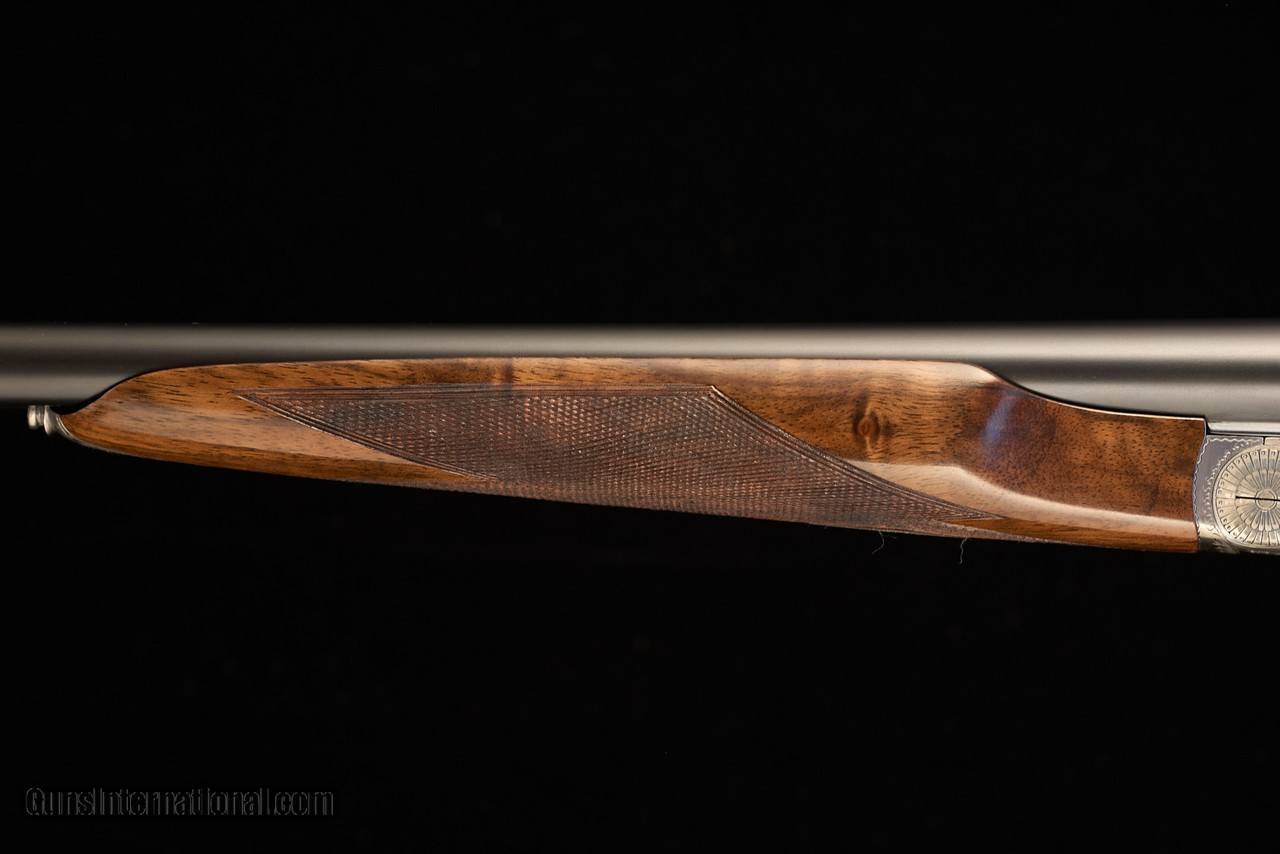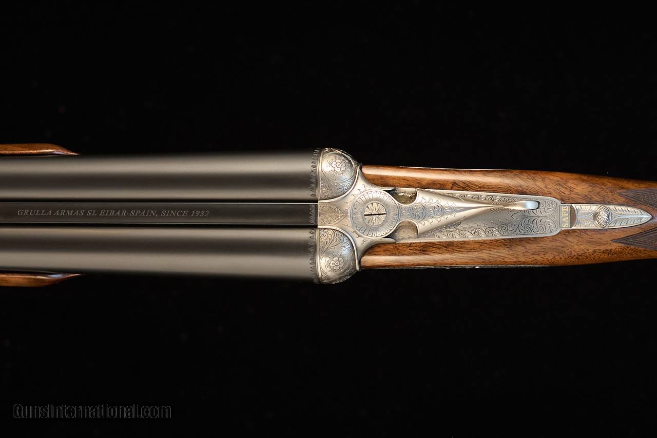 Brand new Grulla 216 20ga/28” with traditional square bar action and five-pin sidelocks. Metal finish is a very well executed satin coin style. Engraving pattern is in the Purdey rose and scroll style, hand cut. Demiblock barrels are light and lively, choked M/IC (fixed), with swamped game rib and brass front bead. Stock and forearm are of well-figured Turkish walnut with semigloss oil finish over a brass stock oval and checkered butt.