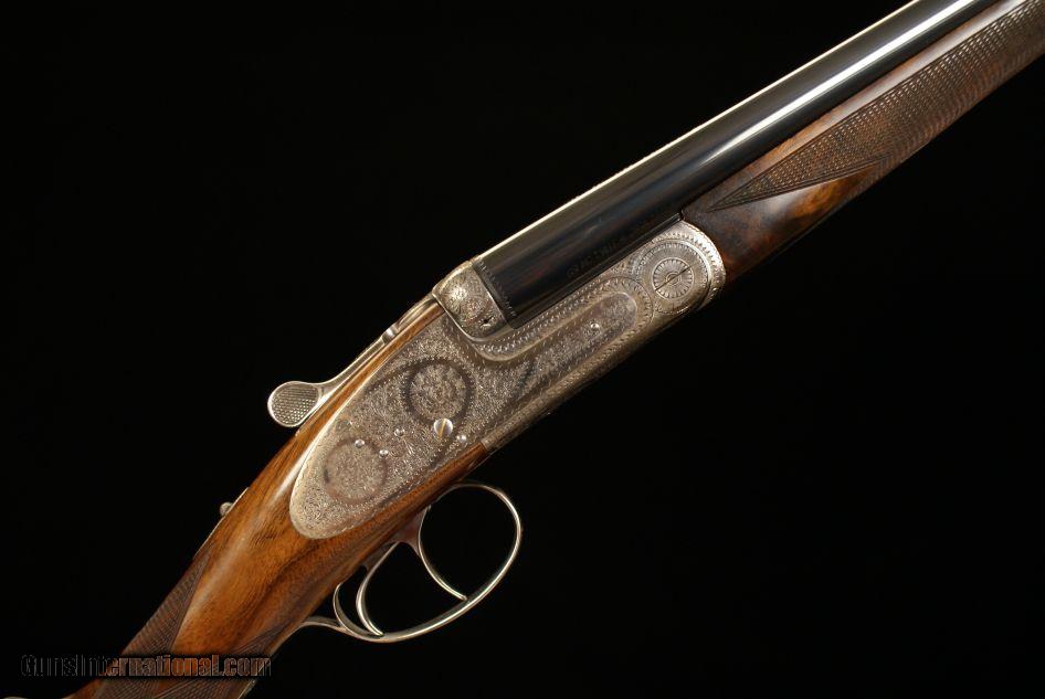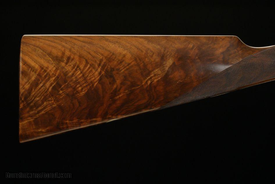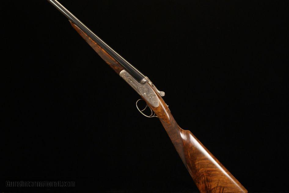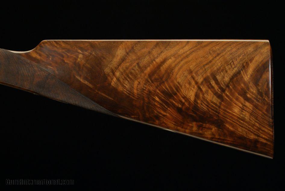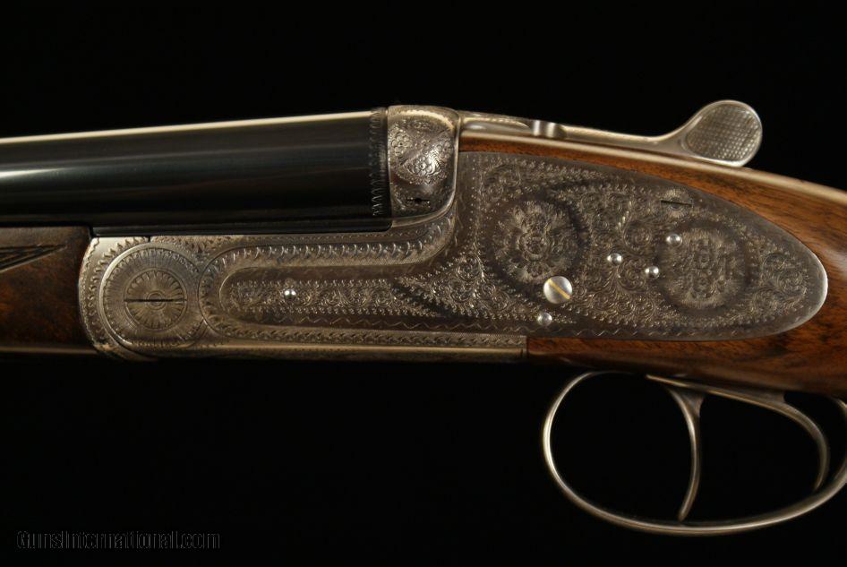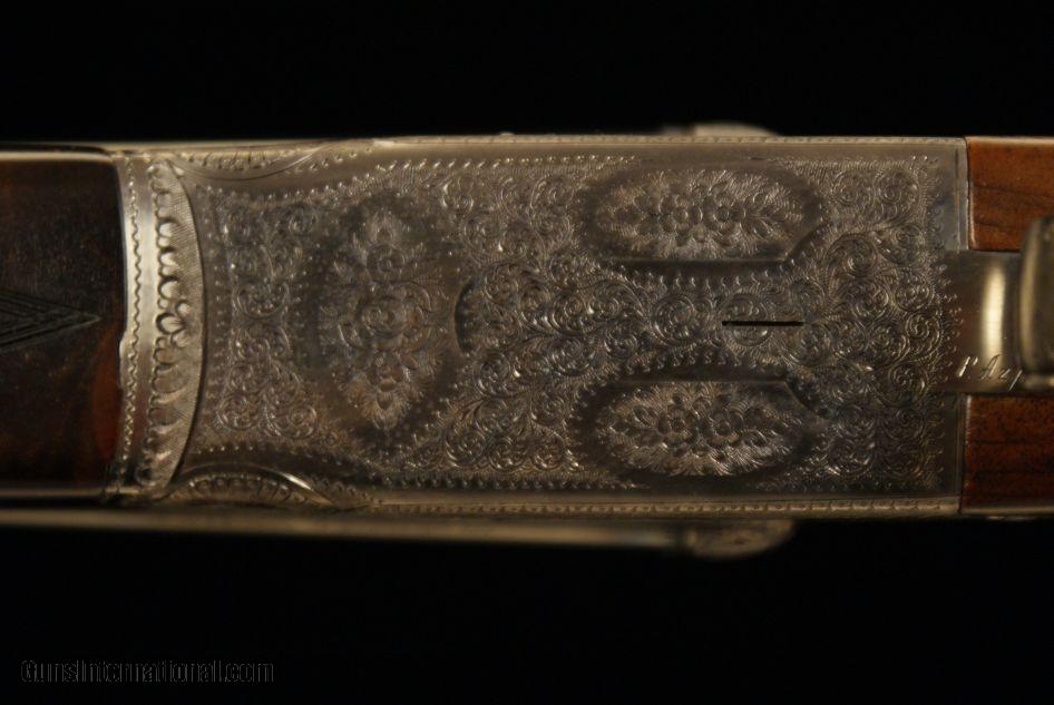 Description: Grulla 216RL Sidelock Ejector 28 bore, 2 3/4" chambers, ejectors, 28" barrels choked .005 IC and .012 Mod., 5 lbs. 15 oz., 14 7/8" LOP to a checkered butt, 1 1/2" DAC, 2 1/4" DAH, 1/8" cast off, double triggers, straight grip, splinter forend, old silver finish, round action, hand engraved with a Purdey rose and scroll pattern, articulated front trigger, disc-set strikers, cocking indicators, gas relief valves, gold oval, highly figured stock, a fantastic hand made gun from one of the premier Spanish makers. This gun was made in 2004 and remains in as new, unused condition. It does not have a box but does come with a nice leather trunk case. SOLD |