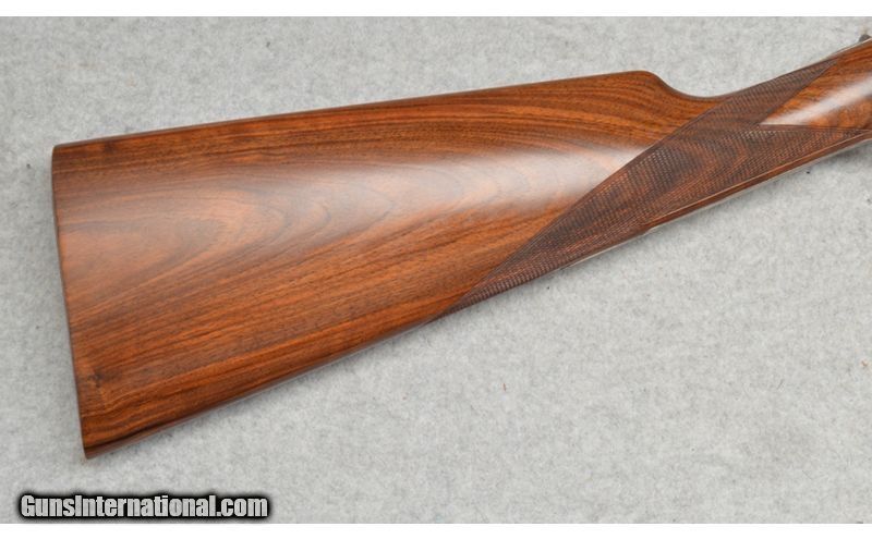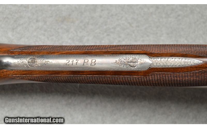 Description: Beautiful Grulla 217 Round Body shotgun in excellent condition. Features full sidelock/hand detachable, cocking indicators, a file cut rib, and Masterful Rose Scroll engraving and coin finish. Minor markings on left side of the stock and has Ejectors. 16 Gauge SOLD Metal Condition: Excellent Wood Condition: Excellent Bore Condition: Clean Barrels: 28 3/8 Triggers: Articulated Front Trigger Stock Dimensions: 14" LOP Butt Pad: Checkered wood Weight: 6 lb 8 oz Sights: Single Bead Chokes: IC, MOD Item Location: Fort Worth, TX |