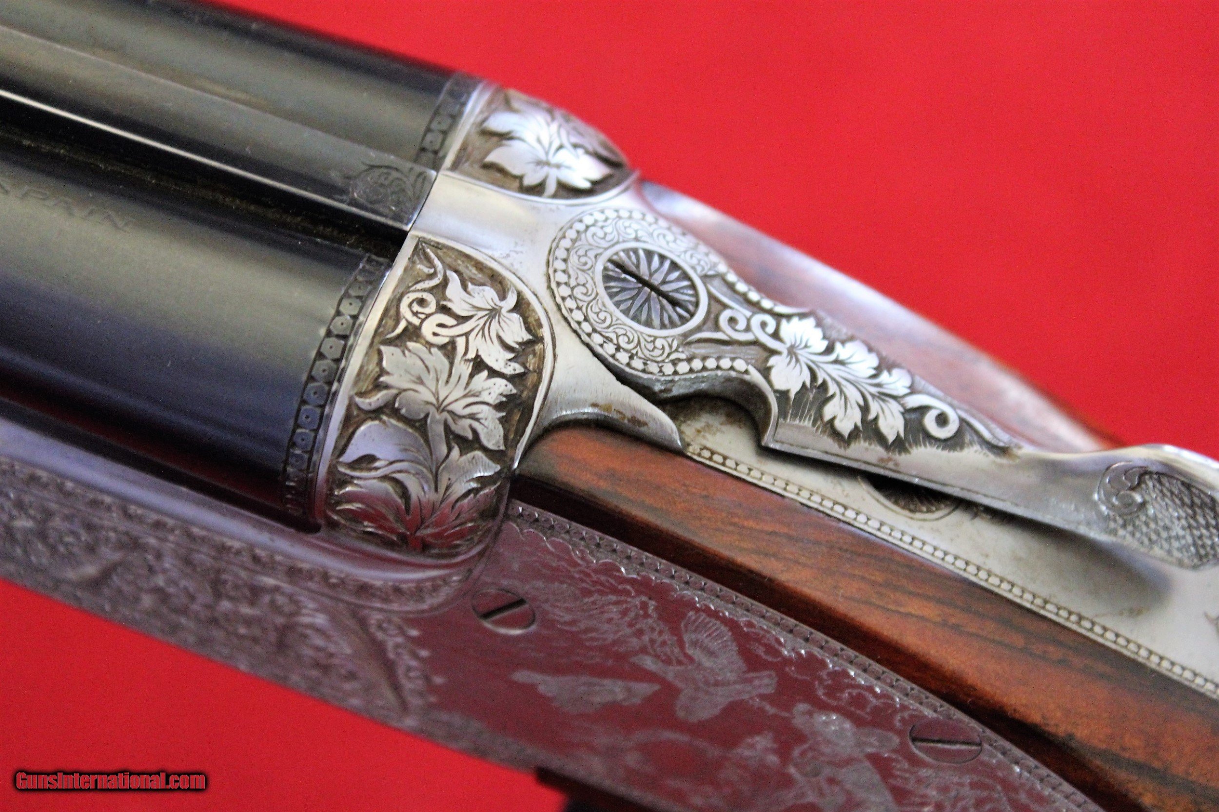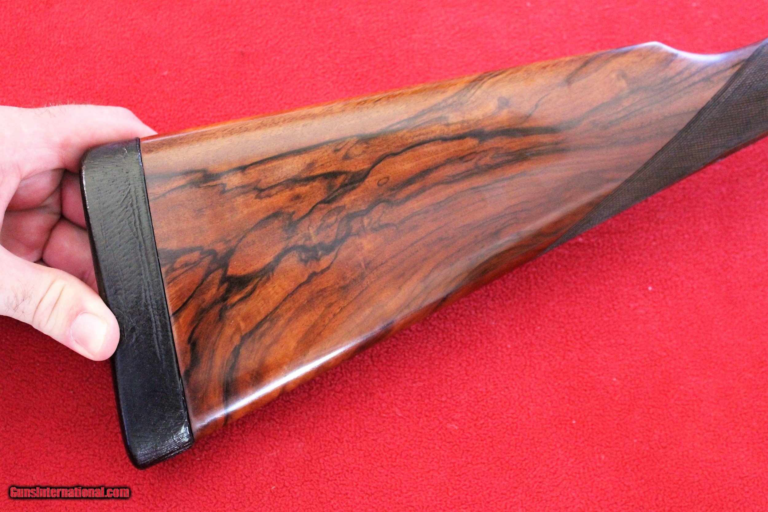 Description: Larry Baer bought a Grulla Royal Barreled Action in the white in 1999. Mr. Baer custom engraved the gun in Holland & holland game scene style with deep carved fences. Mr. Baer stocked the gun with extraordinary wood then checkered and finished it to perfection! SN 28718 .28Ga. 26 3/4" Barrels, 2 3/4" chambers, Chokes: Mod/Imp. Mod. Full length game rib with synthetic ivory front bead, double triggers with front trigger articulated, Automatic ejectors, non-auto safety, Straight grip stock checkered in2-pt pattern with tear drop behind lockplate. Splinter forearm with Curtis push button release checkered in 3-pt pattern. Lockplates are beautifully engraved by Larry Baer with spaniel leaping for quail surrounded by scroll on left and large pointer flushingquail on right, surrounded by scroll and bead work. Bottom of frame with flying quail and scroll on trigger plate. Trigger guard and top lever are nicely scroll and floral engraved. Fences are deeply chiseled in floral pattern. Weight: 5 lbs. 11oz. Exl. condition, 98% original finish, Small chip on forearm on right side at muzzel end. Mechanics are crisp. Case is very good. SOLD Manufacturer: Grulla Model: Royal Bore: 28 Chambers: 2 3/4 Ejectors: yes |