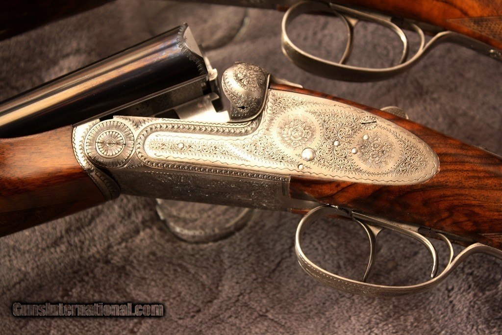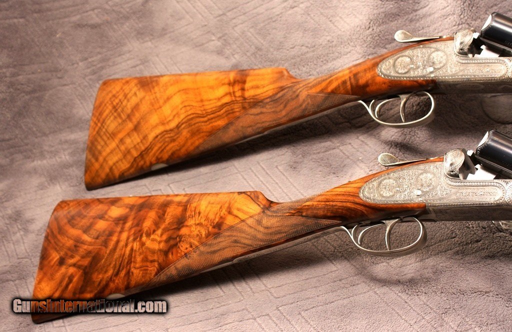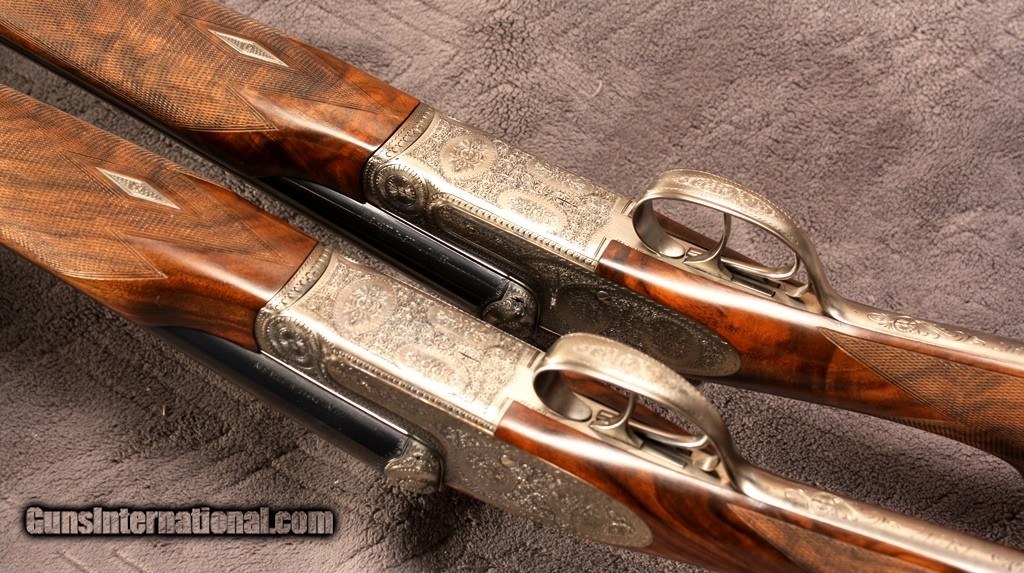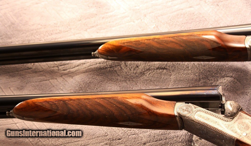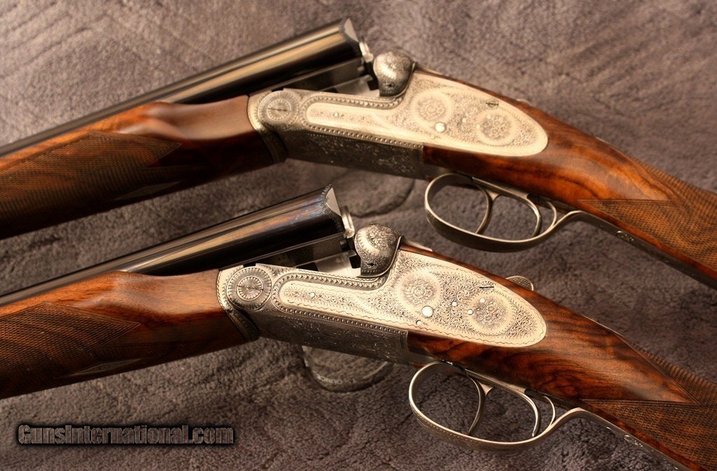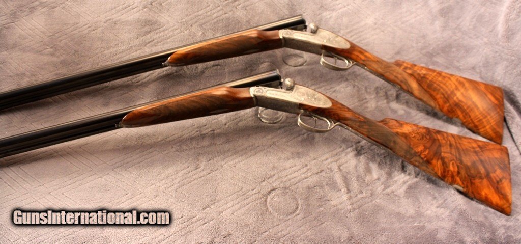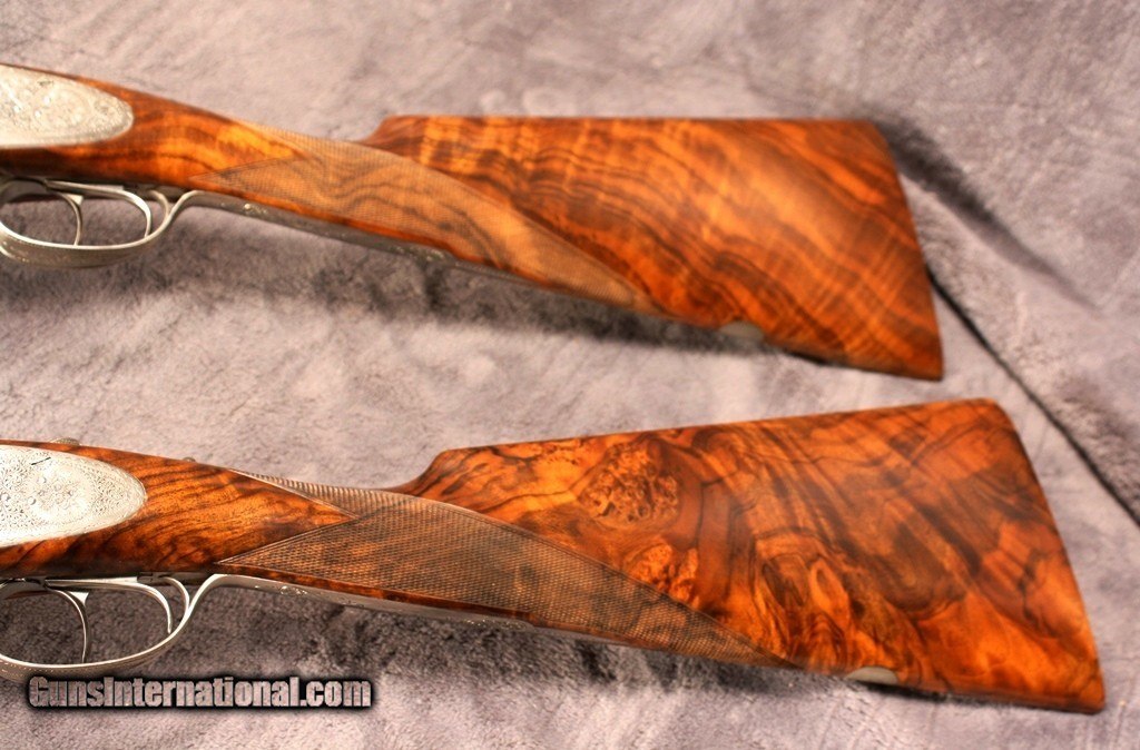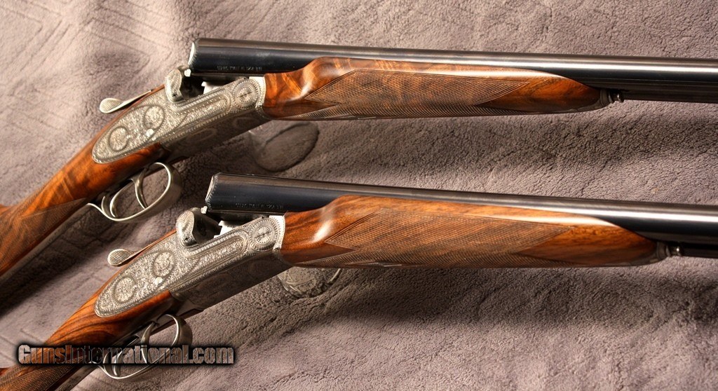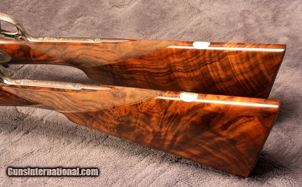 Description: This is a truly spectacular pair of handmade true sidelock action SXS's. Grulla 216 RL 12ga shotguns, 28" barrels, Consecutive Serial numbered pair, Marked #1 & #2 in Gold Inlay on Forends, Ribs, and Top Levers. Gold Inlaid Cocking Indicators, with action featuring costly Sideclips. Sideclips are the beveled flanges extending forward from the sides of the standing breech used to reinforce heavy pigeon loads and are very expensive to add to a SXS shotgun. I have not seen another 216 RL with this custom option. The grade of wood used on this pair is absolutely incredible and have silver initial badges inlaid that remain un-engraved. These had to have been a very custom order. Each gun weighs a perfect 6.7lbs, bores show perfect mirror interiors, #1 is choked at Skeet & IC while #2 is choked Mod & I-Mod. 14 1/8" LOP to a beautifully checkered wood buttplate. Both guns are incredibly tight, still tight to even put together. No markings or damage on metal and bluing, only the most mninor of handling marks on wood, no wood finish wear, its clear these guns have seen little to no use. The detail of the hand engraving on these really must be seen in the hand to be appreciated, work that is rapidly disappearing both from cost and expertise. To order these would run well intot the mid $20k's and are priced to sell here at a fantastic value. WHY CHOOSE ME? A TRULY DIFFERENT BUYING EXPERIENCE We are not open to the public so your gun has not been handled, unlike retailers where guns are endlessly handled, slammed shut and clacked back on a rack countless times often scratched, marked and arriving as was less than a new gun. I used to run a large retail and knew there was a better way. When you receive a gun from me its been packed with care and arrives as your BRAND NEW GUN. ACTUAL pictures of the gun you are getting- YOU get to select your wood and NO OTHER dealer has the wood grades I offer-none. It is because I select every one. When a gun is sold it gets packed THAT DAY, with over 90% shipped same day with FEDEX tracking sent immediately. Trust- I HOPE you look at my feedback, do a google search or read my bio as a Caesar Guerini Pro Staff member. RETURNS: Please inspect your new gun immediately upon arrival when you are at the receiving dealer. If there is a problem with the gun when you receive it at your dealer such as any damage, mistake in the order, anything, simply CALL ME and I’ll handle its return immediately. New Guns do not go out on a 3 day approval, that only applies only to USED guns, as clearly stated. I insure everyone I send a gun to is getting an unhandled brand new gun and the one they have seen actual photos of so you cannot return a gun simply because you changed your mind. If you have any questions before purchase call me. I want discuss your goals and application and make sure you are getting exactly what you want and need. I want you to love your new gun and tell your friends where it came from. This is the personal way my business has always been run. Thank you As a master class level competitor, stock fitter and gunsmith I want to hear your application and discuss your needs before purchasing your next shotgun. THIS IS WHY I ASK THAT YOU CALL. I want to make sure you are getting the right gun for YOUR GOALS. Maybe you have had recoil issues, guns that didn’t fit, struggles with eye dominance, a gun that YOU had to adjust to, let’s change that. Please feel free to call or write with any questions or to discuss how we can improve your game together. August M Crocker's direct line 512-567-PULL (7855) SOLD |