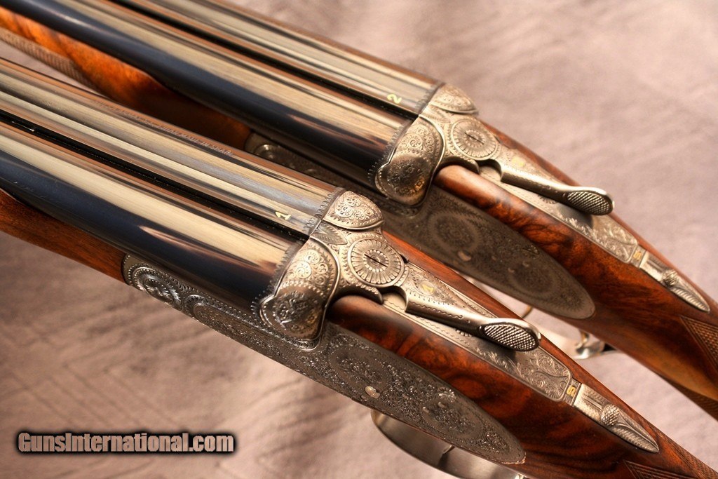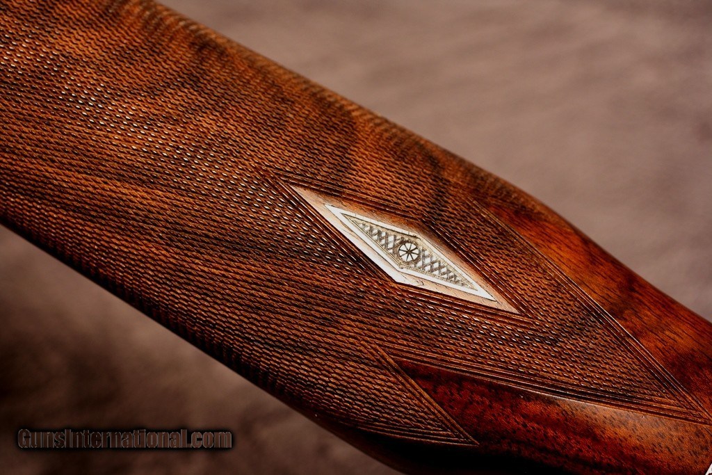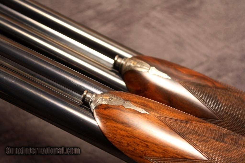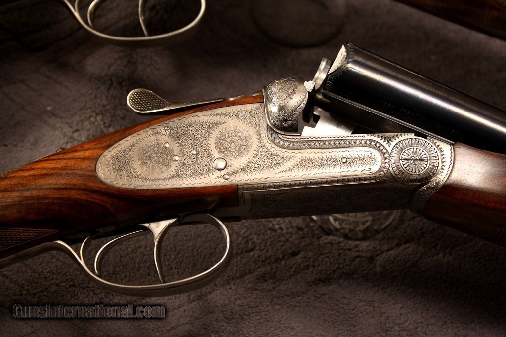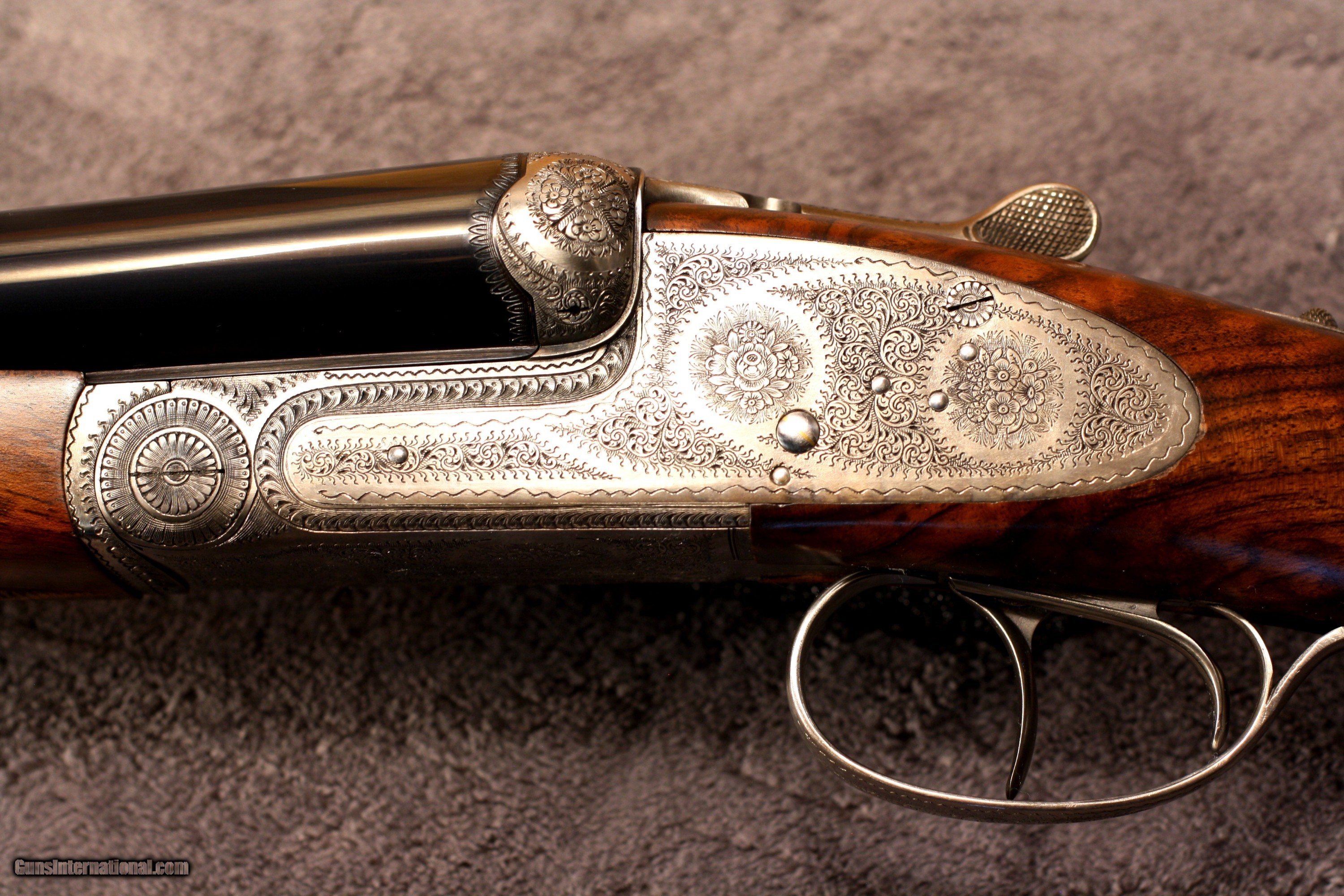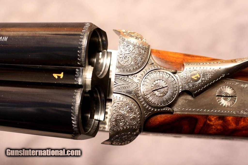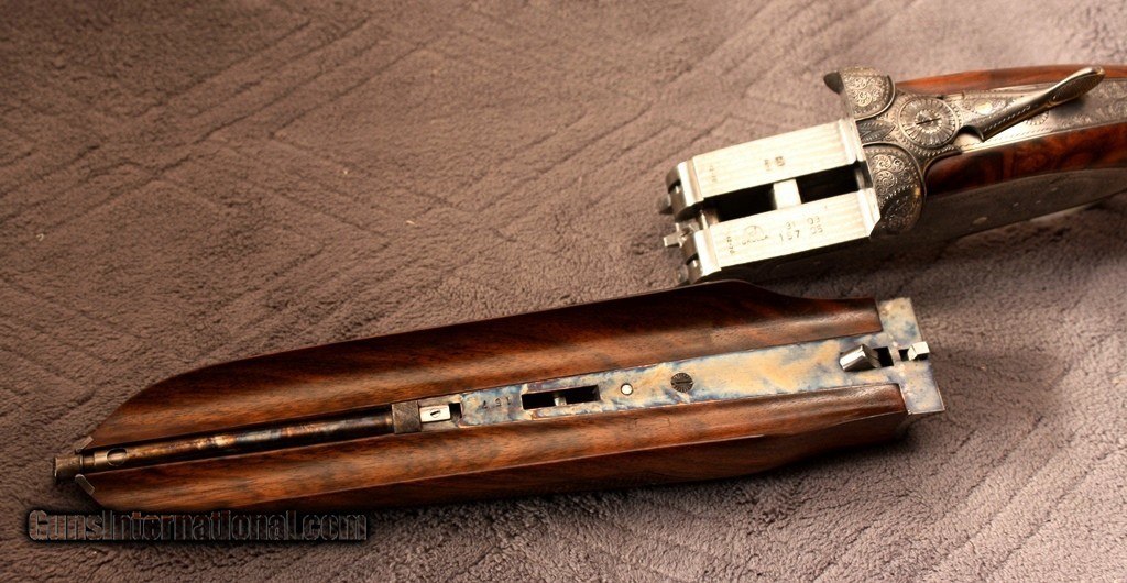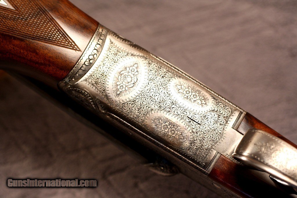 Description: This is a truly spectacular pair of handmade true sidelock action SXS's. Grulla 216 RL 12ga shotguns, 28" barrels, Consecutive Serial numbered pair, Marked #1 & #2 in Gold Inlay on Forends, Ribs, and Top Levers. Gold Inlaid Cocking Indicators, with action featuring costly Sideclips. Sideclips are the beveled flanges extending forward from the sides of the standing breech used to reinforce heavy pigeon loads and are very expensive to add to a SXS shotgun. I have not seen another 216 RL with this custom option. The grade of wood used on this pair is absolutely incredible and have silver initial badges inlaid that remain un-engraved. These had to have been a very custom order. Each gun weighs a perfect 6.7lbs, bores show perfect mirror interiors, #1 is choked at Skeet & IC while #2 is choked Mod & I-Mod. 14 1/8" LOP to a beautifully checkered wood buttplate. Both guns are incredibly tight, still tight to even put together. No markings or damage on metal and bluing, only the most mninor of handling marks on wood, no wood finish wear, its clear these guns have seen little to no use. The detail of the hand engraving on these really must be seen in the hand to be appreciated, work that is rapidly disappearing both from cost and expertise. To order these would run well intot the mid $20k's and are priced to sell here at a fantastic value. WHY CHOOSE ME? A TRULY DIFFERENT BUYING EXPERIENCE We are not open to the public so your gun has not been handled, unlike retailers where guns are endlessly handled, slammed shut and clacked back on a rack countless times often scratched, marked and arriving as was less than a new gun. I used to run a large retail and knew there was a better way. When you receive a gun from me its been packed with care and arrives as your BRAND NEW GUN. ACTUAL pictures of the gun you are getting- YOU get to select your wood and NO OTHER dealer has the wood grades I offer-none. It is because I select every one. When a gun is sold it gets packed THAT DAY, with over 90% shipped same day with FEDEX tracking sent immediately. Trust- I HOPE you look at my feedback, do a google search or read my bio as a Caesar Guerini Pro Staff member. RETURNS: Please inspect your new gun immediately upon arrival when you are at the receiving dealer. If there is a problem with the gun when you receive it at your dealer such as any damage, mistake in the order, anything, simply CALL ME and I’ll handle its return immediately. New Guns do not go out on a 3 day approval, that only applies only to USED guns, as clearly stated. I insure everyone I send a gun to is getting an unhandled brand new gun and the one they have seen actual photos of so you cannot return a gun simply because you changed your mind. If you have any questions before purchase call me. I want discuss your goals and application and make sure you are getting exactly what you want and need. I want you to love your new gun and tell your friends where it came from. This is the personal way my business has always been run. Thank you As a master class level competitor, stock fitter and gunsmith I want to hear your application and discuss your needs before purchasing your next shotgun. THIS IS WHY I ASK THAT YOU CALL. I want to make sure you are getting the right gun for YOUR GOALS. Maybe you have had recoil issues, guns that didn’t fit, struggles with eye dominance, a gun that YOU had to adjust to, let’s change that. Please feel free to call or write with any questions or to discuss how we can improve your game together. August M Crocker's direct line 512-567-PULL (7855) SOLD |