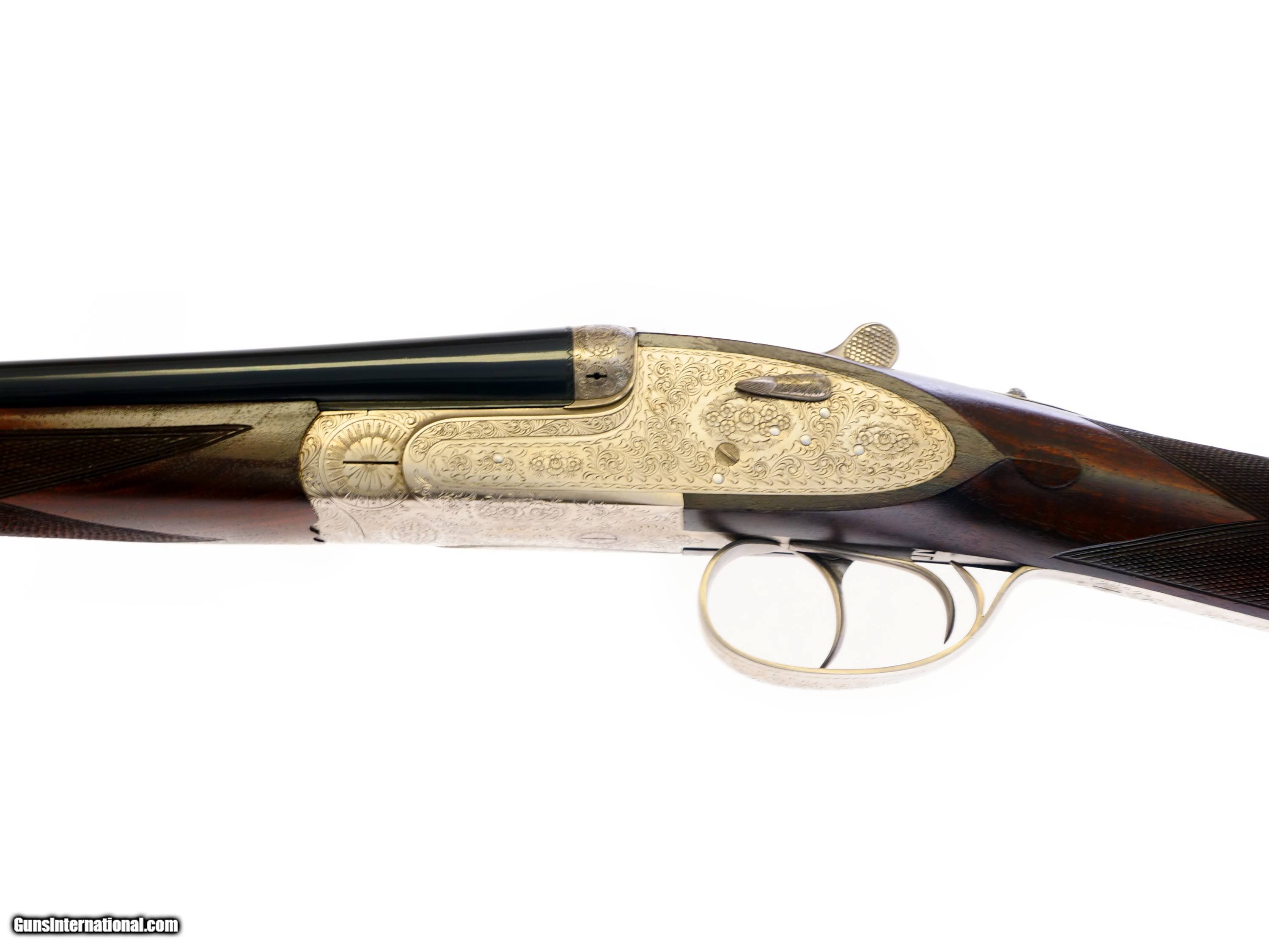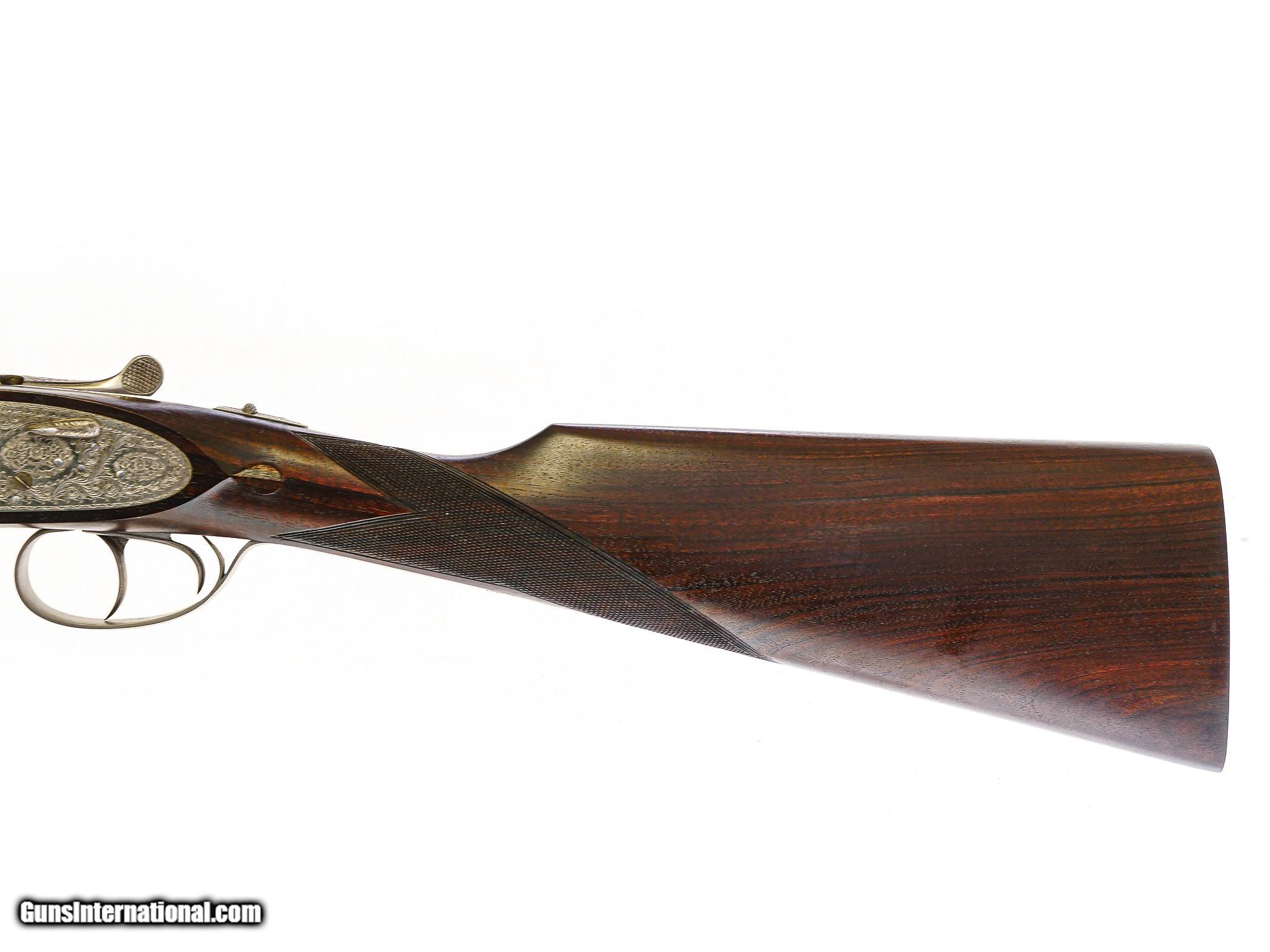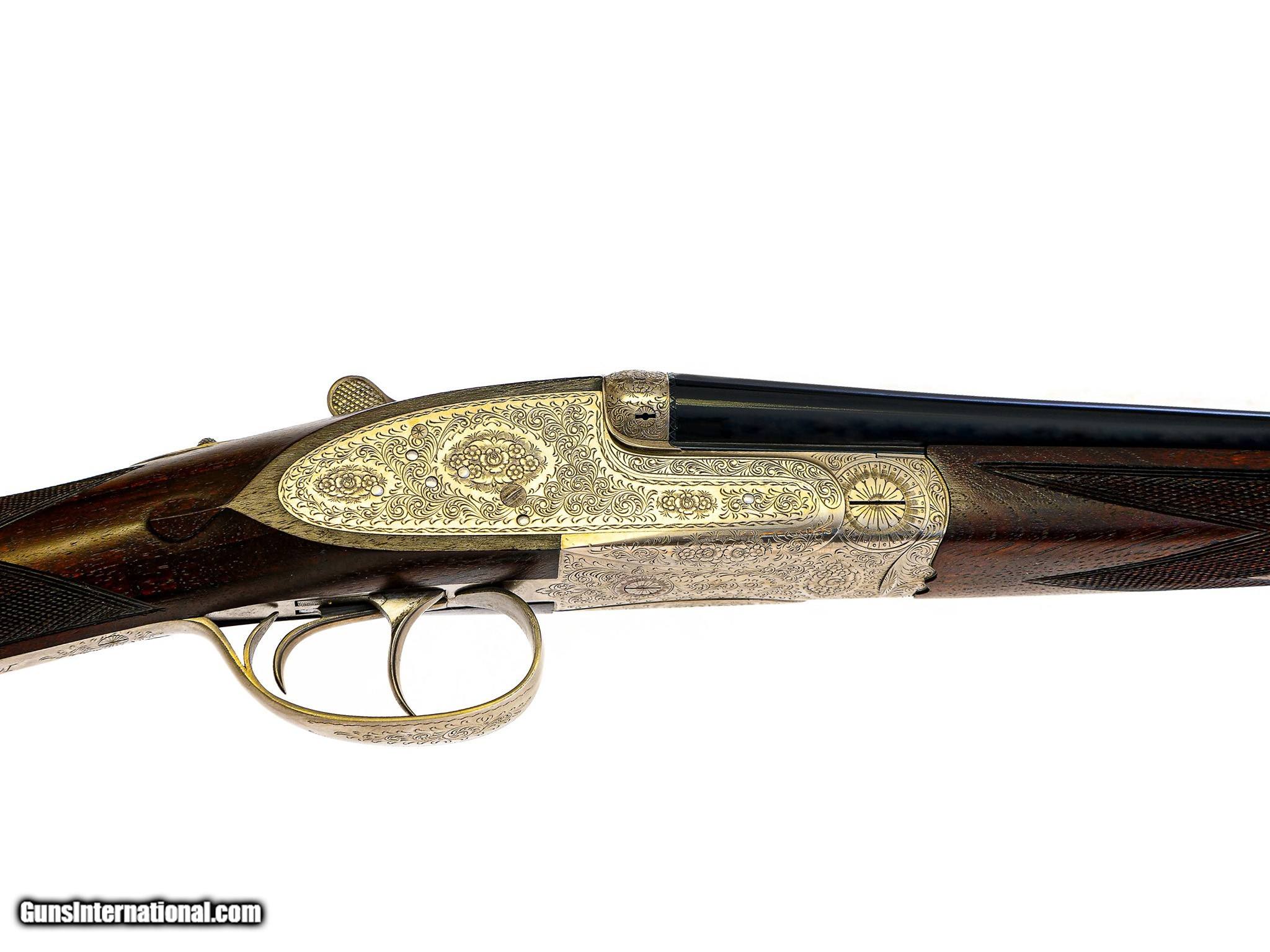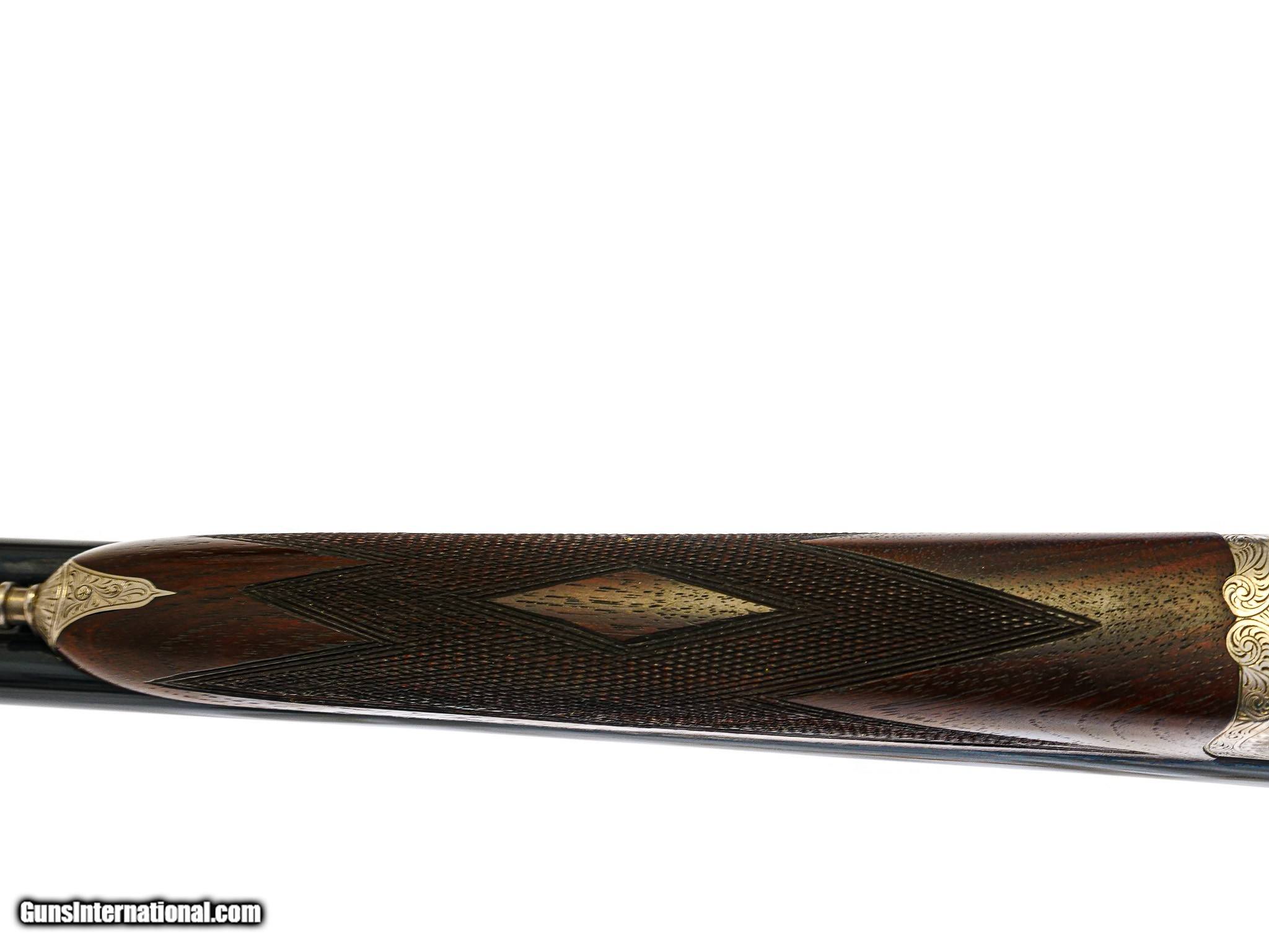 Description: Grulla/Kettner - San Remo Full Sidelock, SxS, .410ga. 27 ¾” Chopper Lump Barrels. Specially built to higher level for the German retailer Kettner. Hand detachable, hand engraved, double trigger, hinged front, 27 ¾” chopperlump barrels, matted raised rib, 2 ¾” chambers, straight grip, double trigger, auto ejector, English drop points, checkered butt, French grey receiver, zero cast, splinter forend. gun is new and unfired with jeweled watertable, barrels flats, rounded and specially sized .410 frame. These guns were specially built to a higher level for German market. A very high quality small frame full sidelock, with English drop points and is as new. Inv: 67844 5 lbs. 4 oz. 14 5/8" x 1 3/16" x 2 ¼" $11,995.00 SOLD |