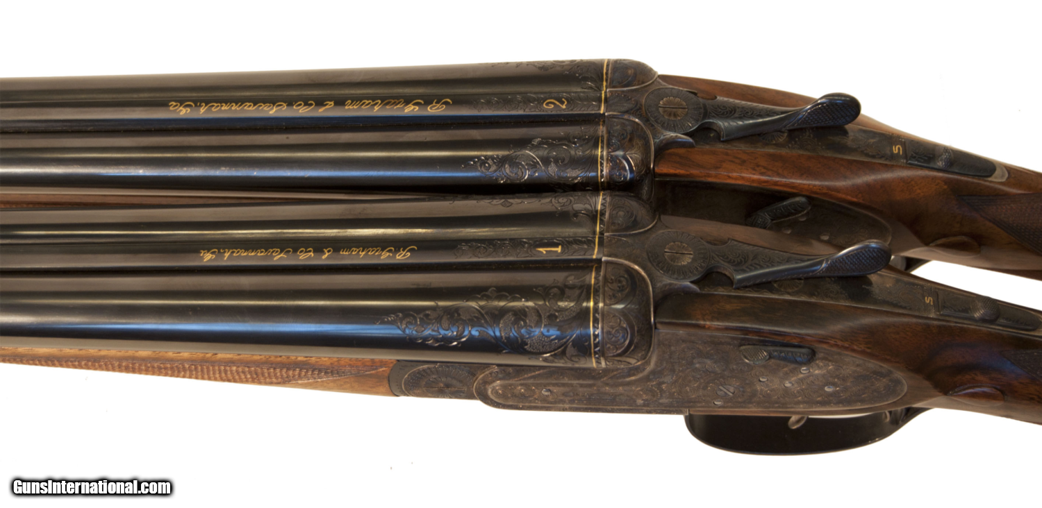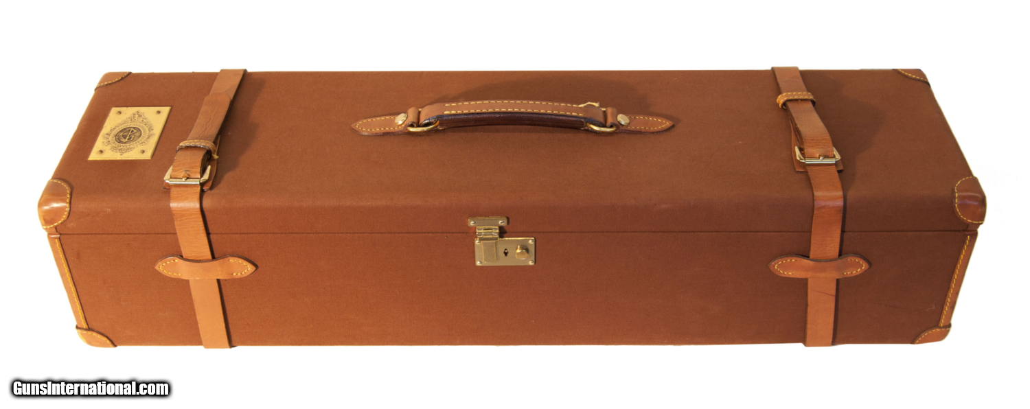 Description: Sale Pending 8/30 This is a rare pair of consecutively numbered No. 2 Grullas in 12G and 20G. Mfg date 1980s. We have had the wood completely redone by a professional and the wood is very nice and 100% condition with checkered butts. The wood between the #1 and #2 gun is not a 100% perfect match but they look good together. The case coloring is superb. The barrels show some scratches from use and we have attempted to show that in the pictures. We decided not to reblue the barrels due to the very interesting engraving and lettering. This is a Holland style hand detachable sidelock gun with cocking indicators. There is a nice and original canvas and leather motor case for the pair with a Grulla badge on the lid. Gun #1 is a 12 G with 26" barrels choked R: IC (.010) and L: LM (.015). The weight is 6 1/2#s. LOP is 14.5". DAC is 1 5/8" and DAH is 2 3/8". Gun #2 is a 20 G with 26" barrels choked R: IC (.08) and L: M (.015). The weight is 6 #s.LOP is 14.5". DAC is 1 5/8" and DAH is 2 3/8". The importer's name R. Graham & Co Savannah Ga appears on top of the ribs in gold. A bit overdone in our opinion but nonetheless tastefully done and it adds to the uniqueness of the guns. We are a Grulla authorized dealer. Replacement cost on a comparable pair would be approximately 3 times the asking price of these guns. This cased set would be an interesting and fun pair of field guns for a husband/wife, father/son, etc. They are modern guns and how often do you have a chance to get your hands on a newer pair of guns from a world renowned maker at a price like this? SOLD Stock Cast: Neutral both |