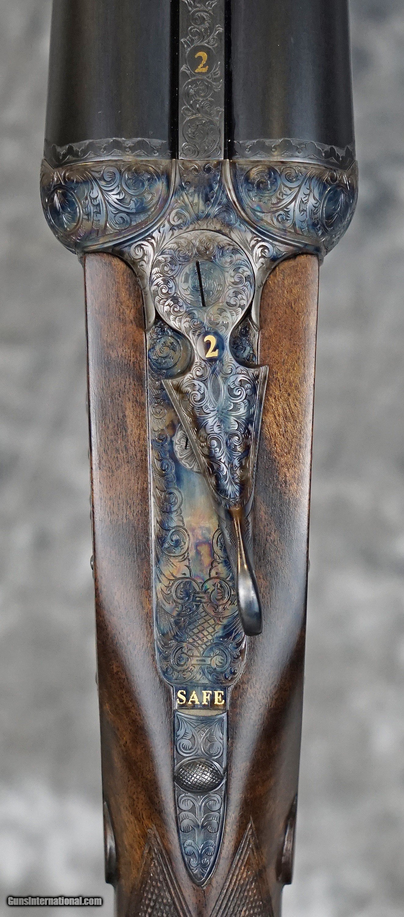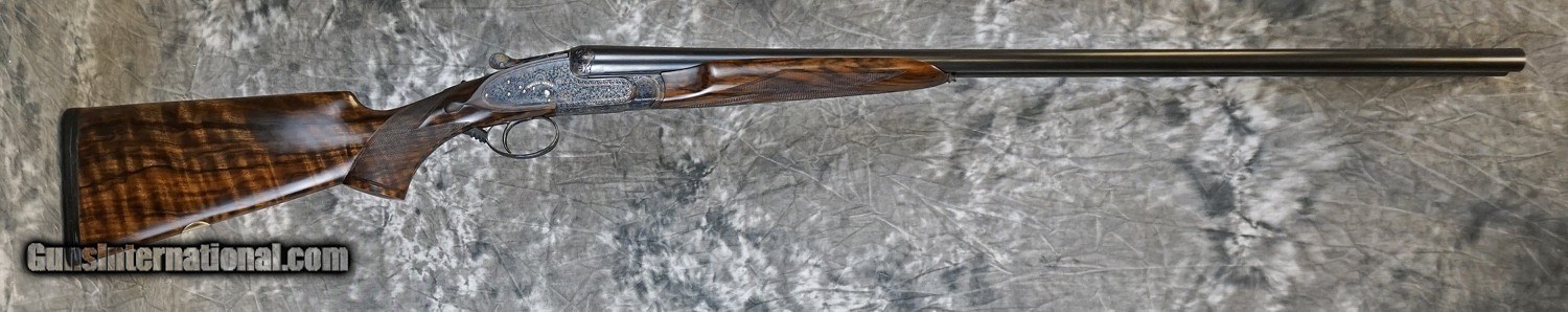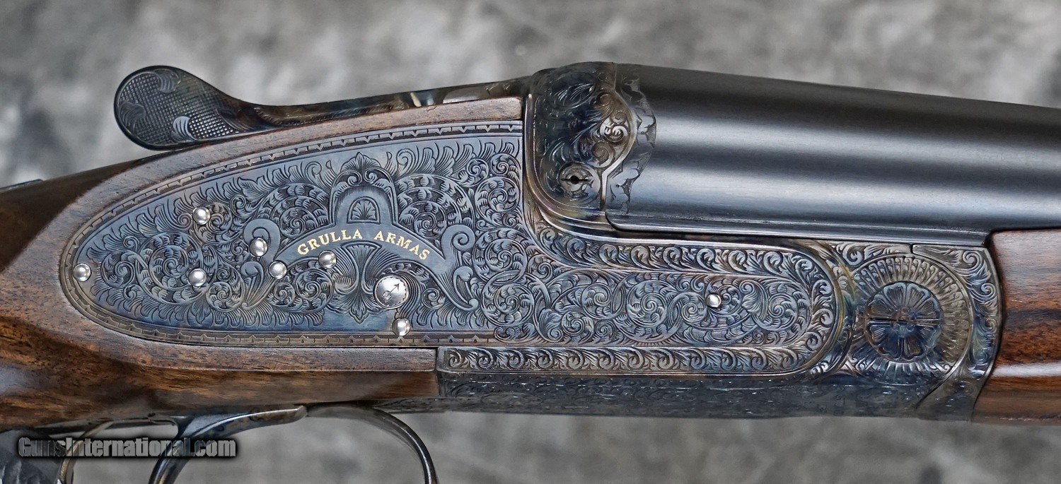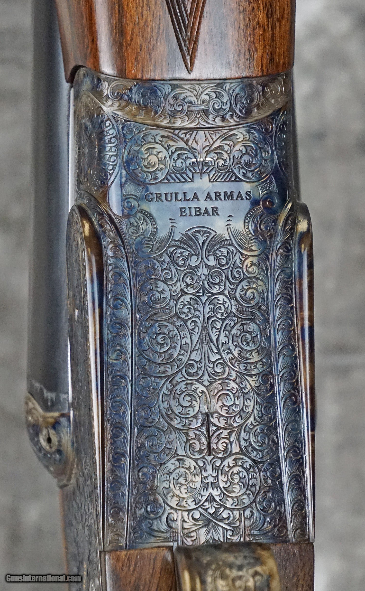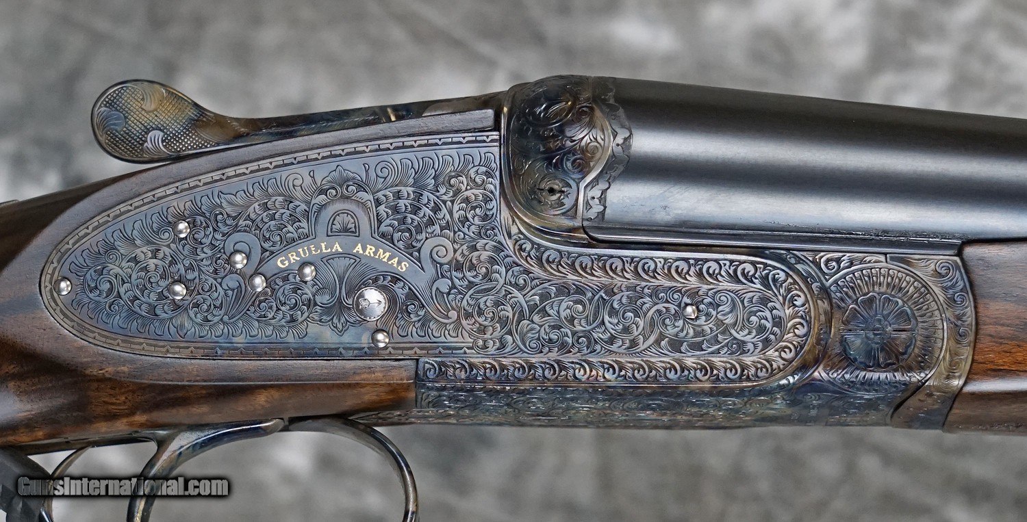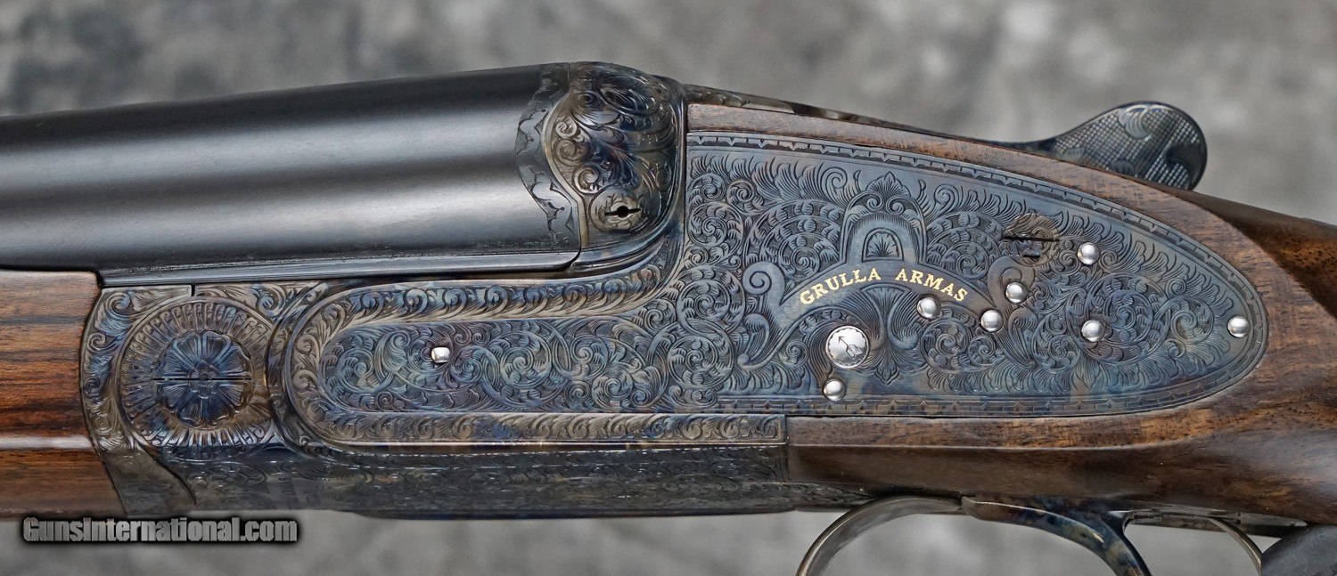 Description: New Grulla Matched Pair of Driven Game Royale Game Guns, 16GA with 30" fixed choke (IC/M) steel proofed and chrome lined barrels, deeply rust blued with swamped game ribs. Fully hand-engraved 16GA scaled; 7-pin style sidelock action with self-openers, single-triggers and factory case-color hardened. Factory Purdey style pistol grip stocks to recoil pads, full beavertail forearms. Includes factory matched pair leather trunk presentation case. SOLD Shotgun Gauge: 16 Gauge |