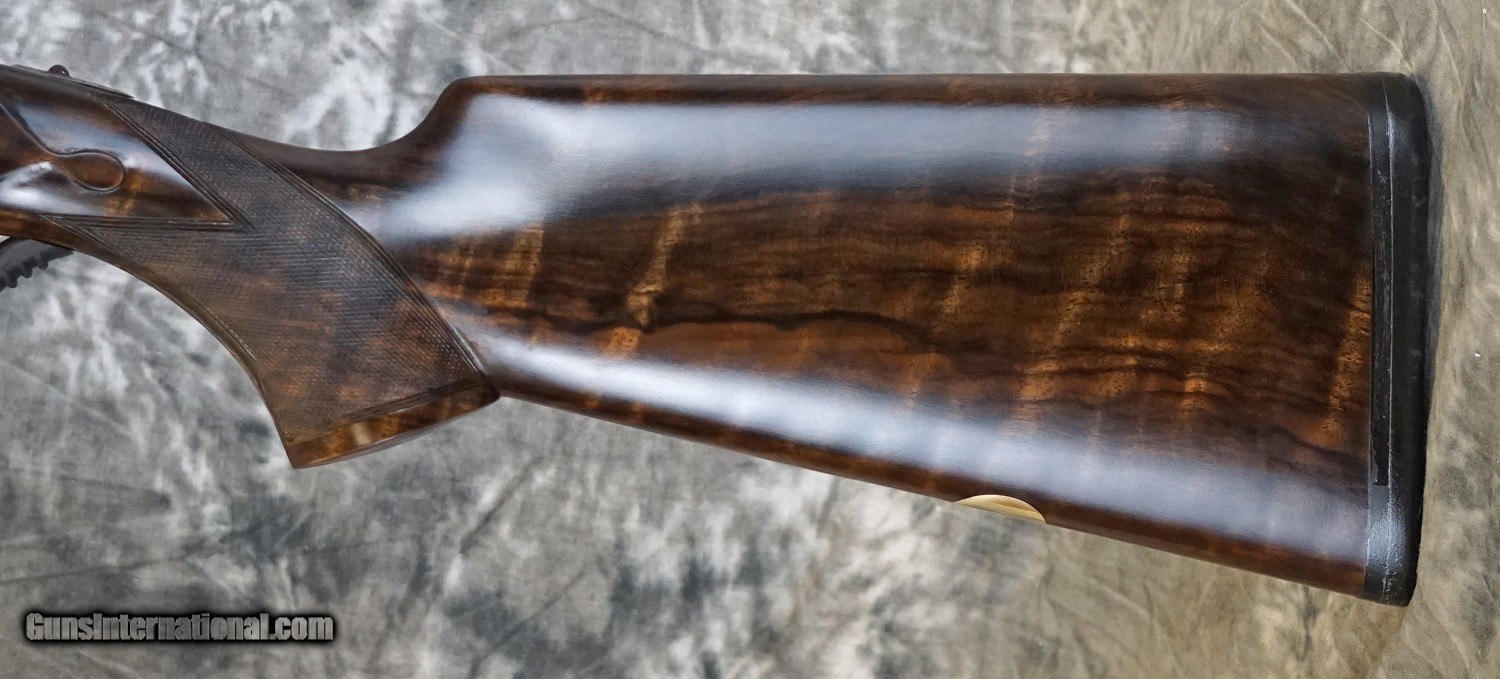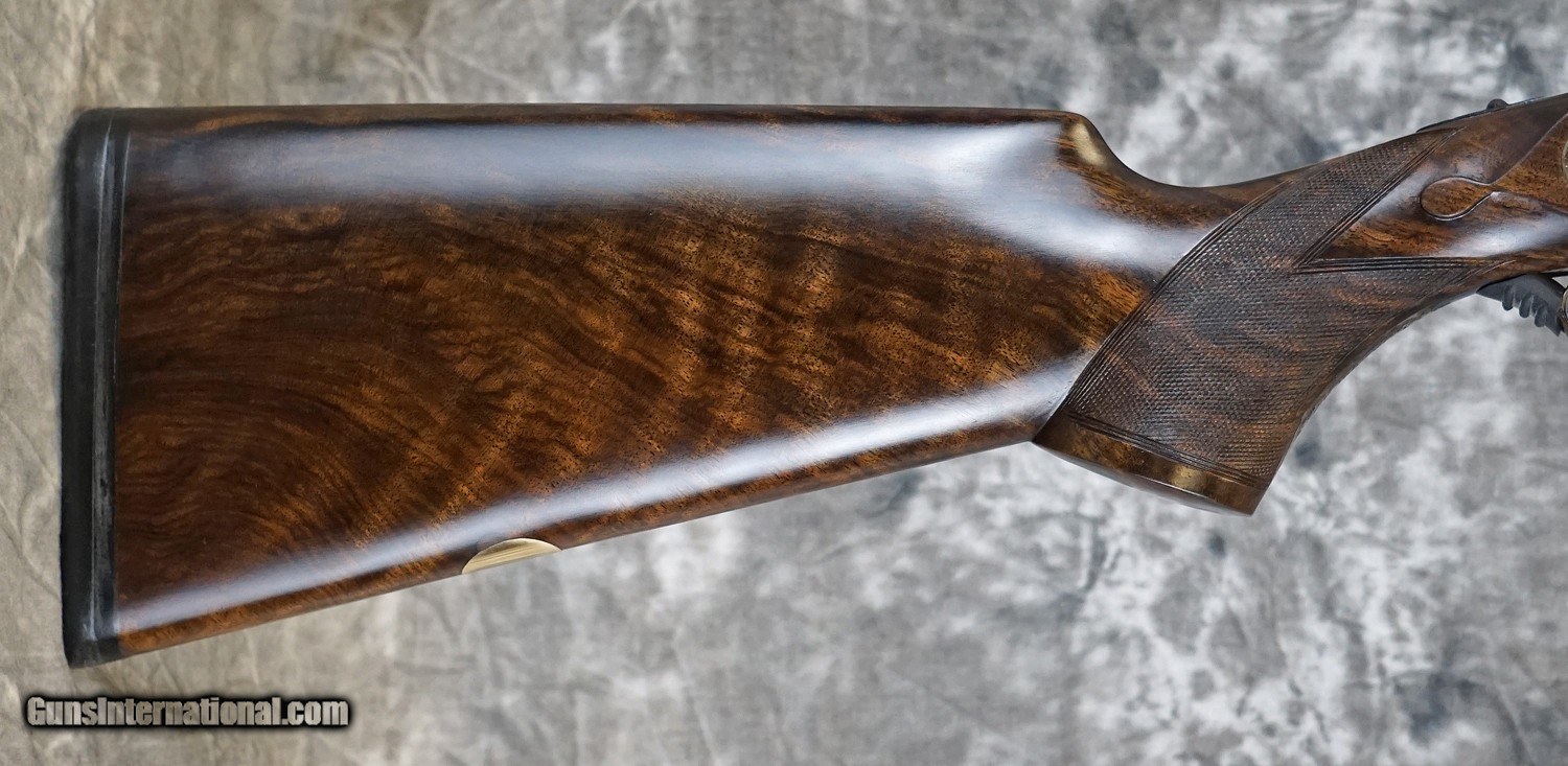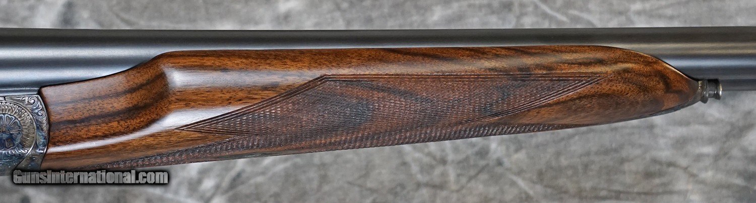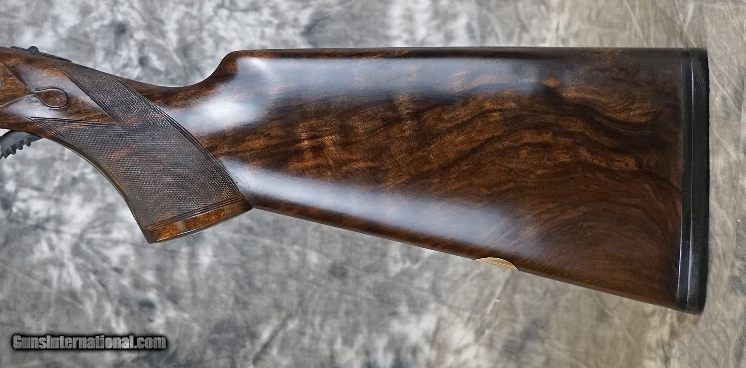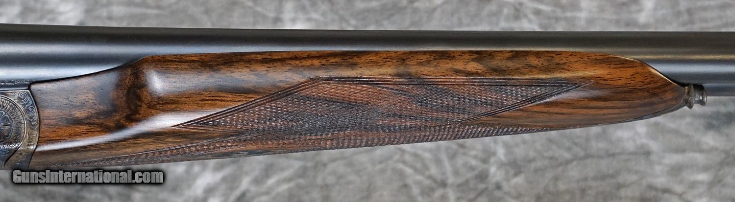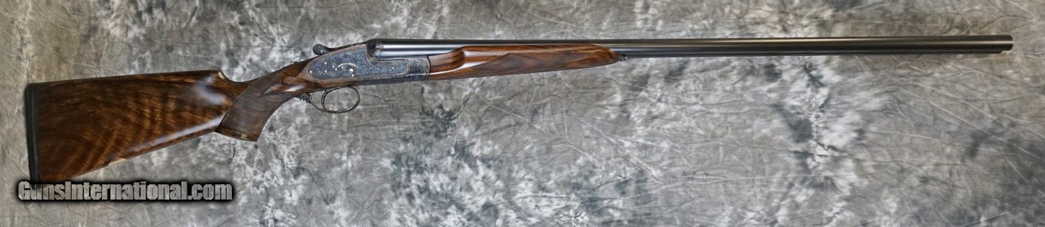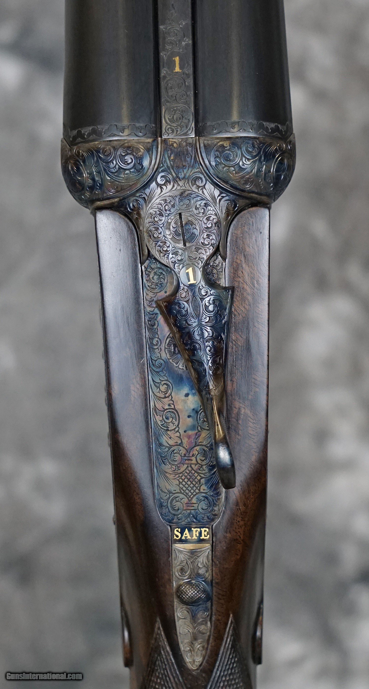 Description: New Grulla Matched Pair of Driven Game Royale Game Guns, 16GA with 30" fixed choke (IC/M) steel proofed and chrome lined barrels, deeply rust blued with swamped game ribs. Fully hand-engraved 16GA scaled; 7-pin style sidelock action with self-openers, single-triggers and factory case-color hardened. Factory Purdey style pistol grip stocks to recoil pads, full beavertail forearms. Includes factory matched pair leather trunk presentation case. SOLD Shotgun Gauge: 16 Gauge |