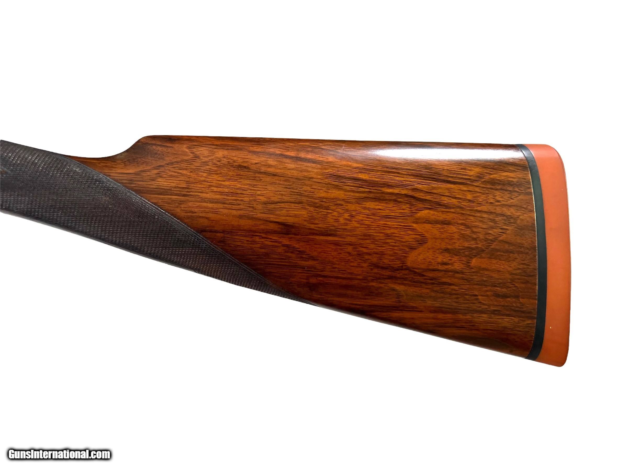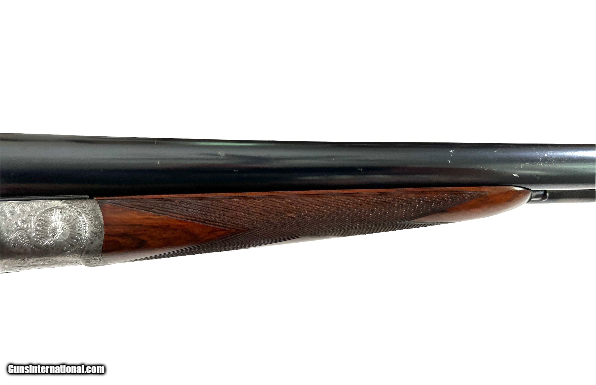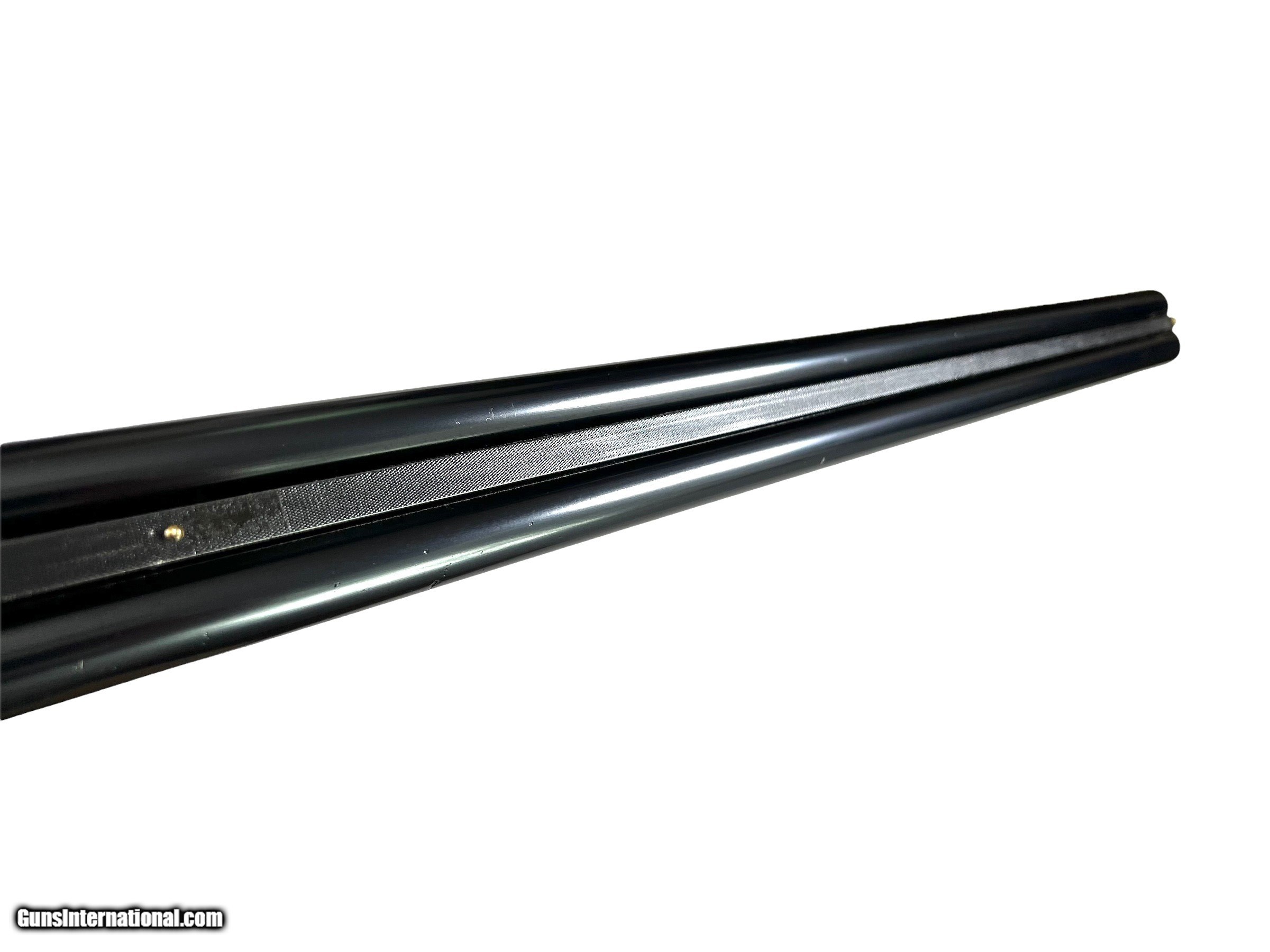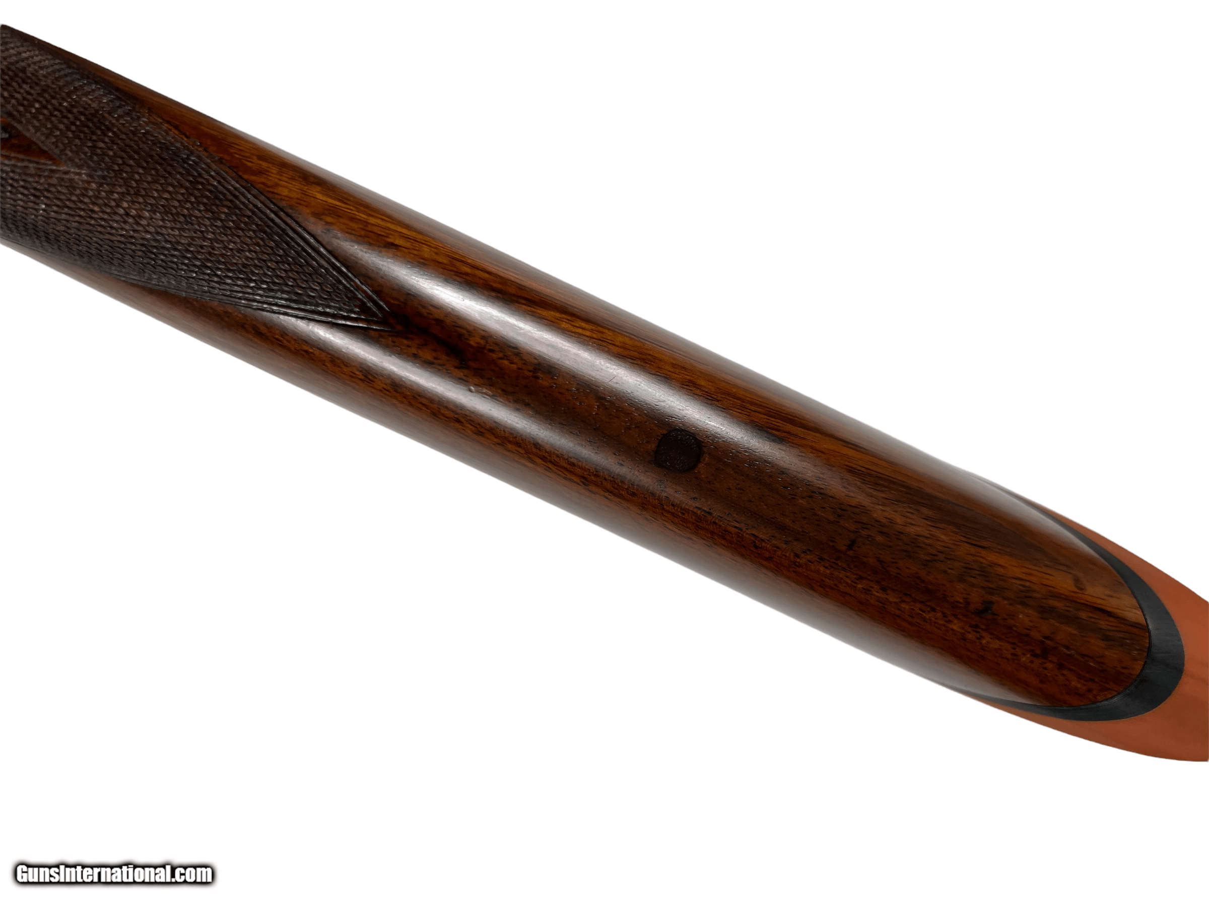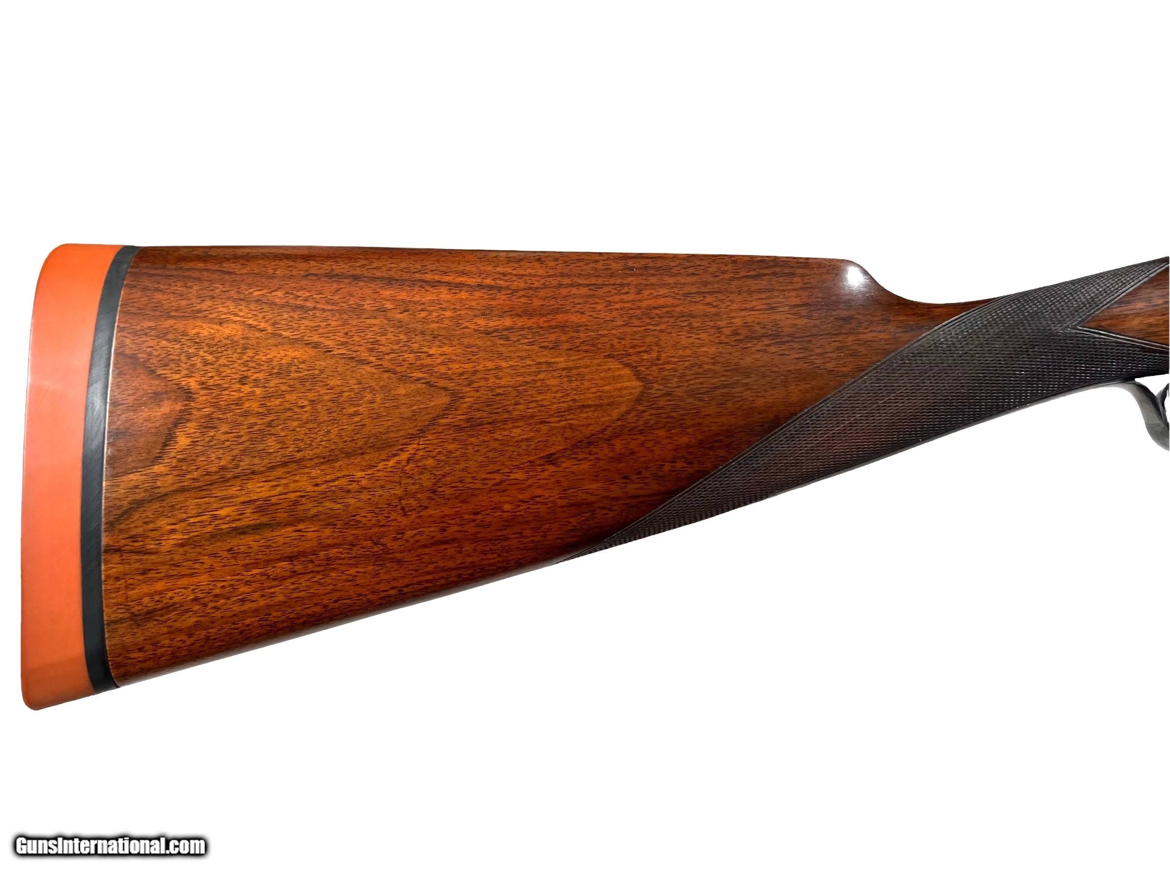 Description: FC Scott hammer pigeon gun 29.5" barrels Belgian proof 2 7/8" chambers Bores measure .734/.734 Choked .043/.045 Minimum wall thickness R: 31/1000 L: 26/1000 LOP 14 7/8 DAC 1 3/8 DAH 1 7/8 Cast off 3/8" 8lbs 3oz Gun was rebarreled in Belgium early on. Sling swivels have been filled(see pictures) bores are bright and clean. There are a couple places of minor pitting on the outside of the barrels. Very fine hammer pigeon gun with fantastic stock dimensions. SOLD Antique: Yes Shotgun Gauge: 12 Gauge |