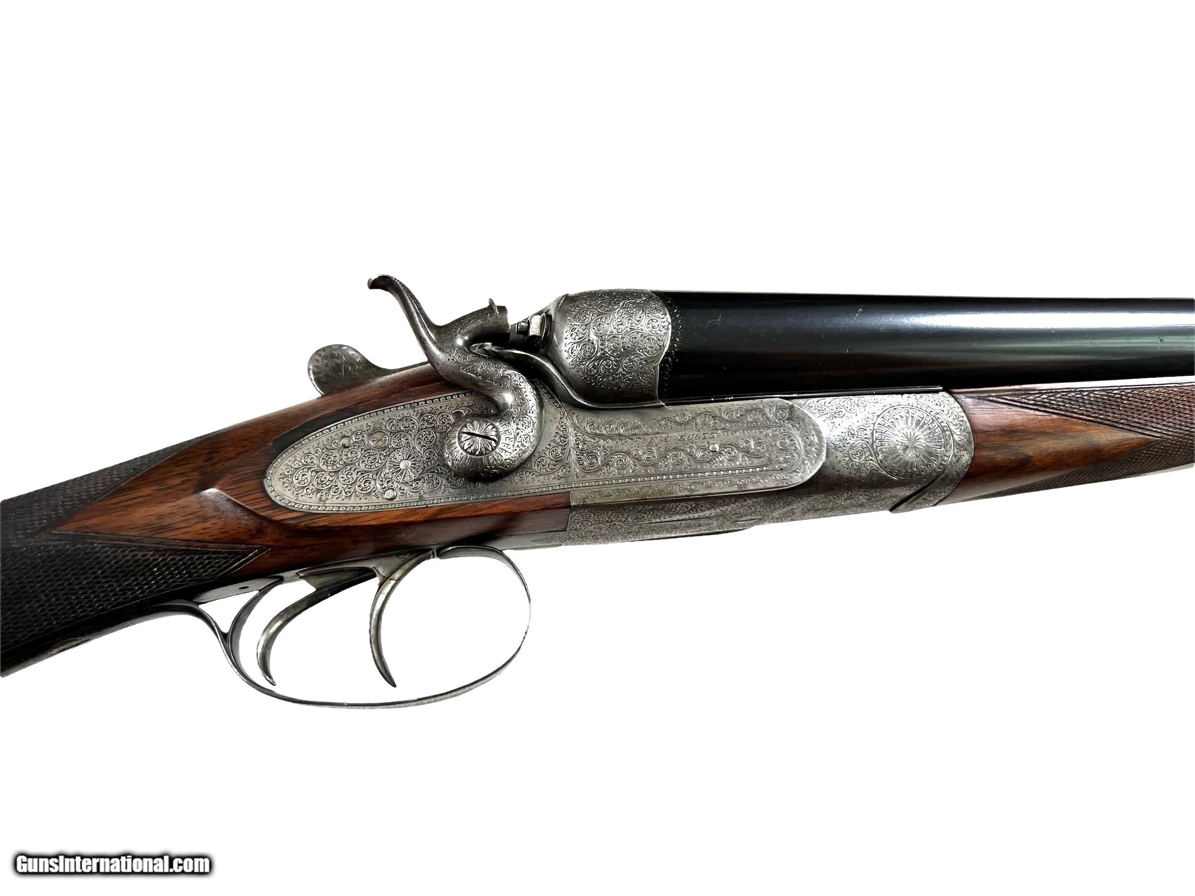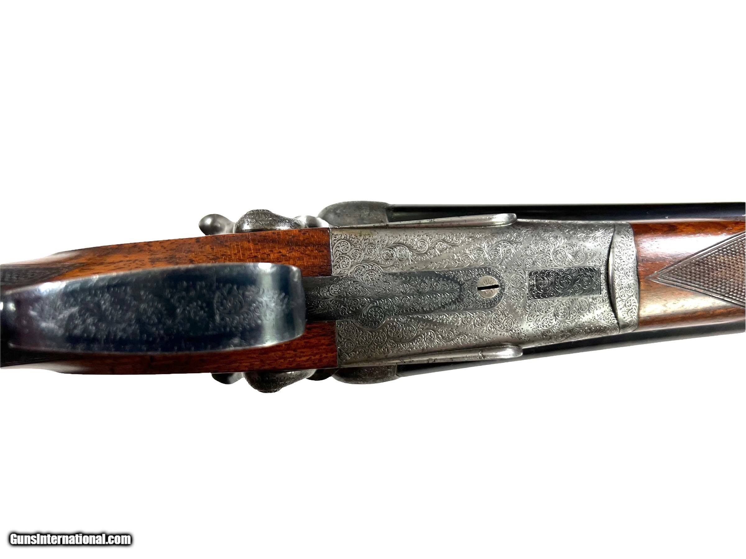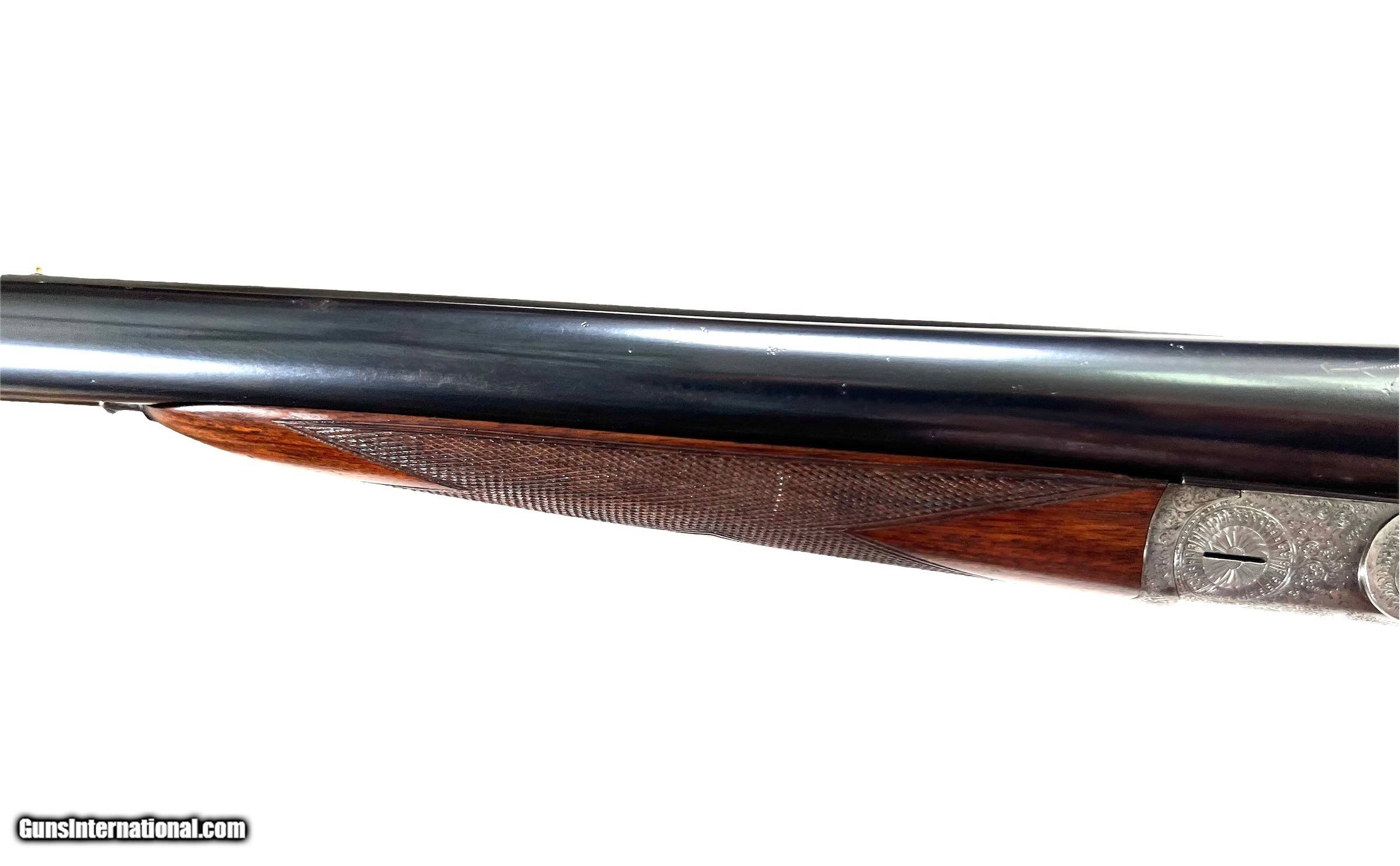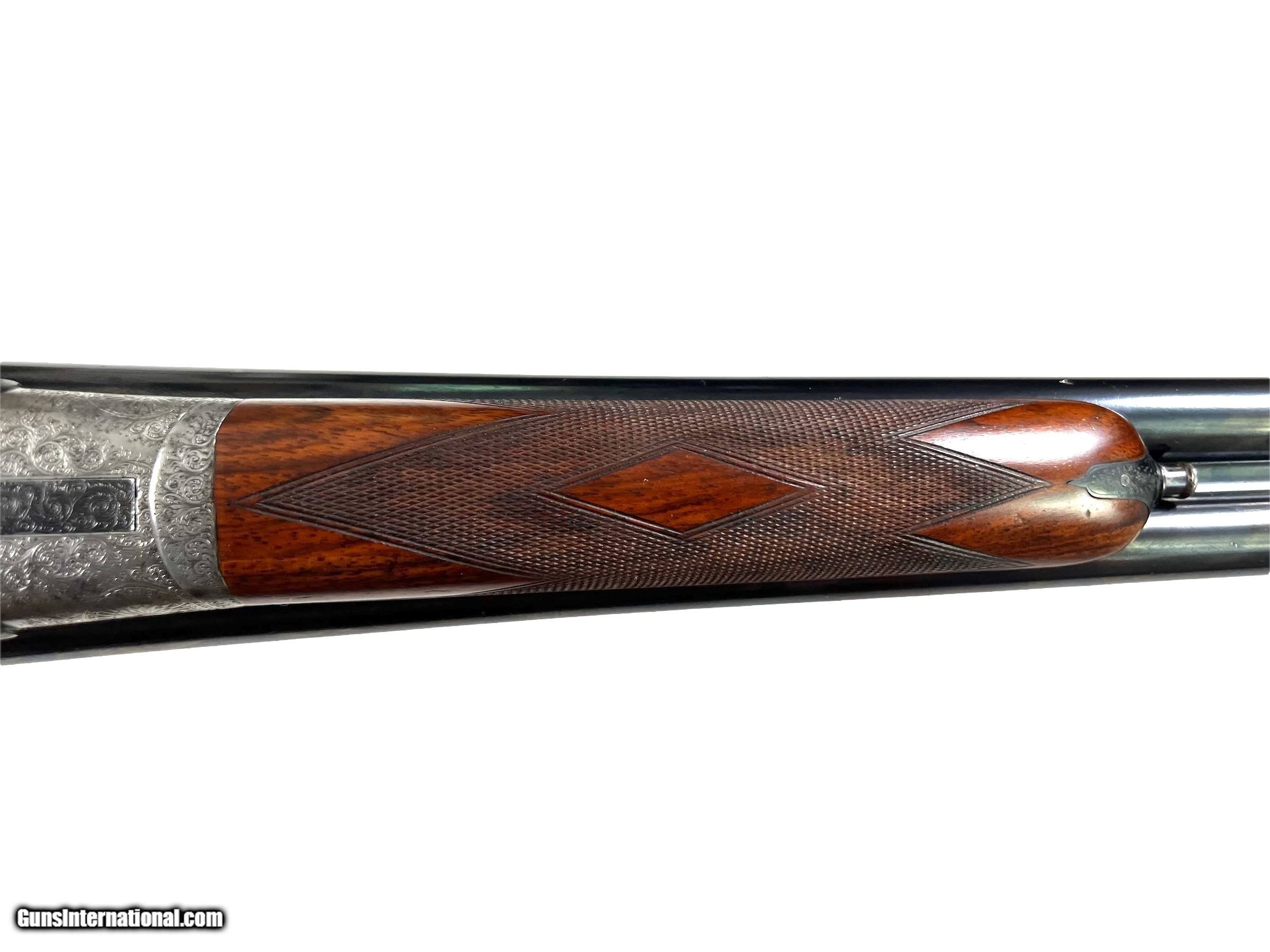 Description: FC Scott hammer pigeon gun 29.5" barrels Belgian proof 2 7/8" chambers Bores measure .734/.734 Choked .043/.045 Minimum wall thickness R: 31/1000 L: 26/1000 LOP 14 7/8 DAC 1 3/8 DAH 1 7/8 Cast off 3/8" 8lbs 3oz Gun was rebarreled in Belgium early on. Sling swivels have been filled(see pictures) bores are bright and clean. There are a couple places of minor pitting on the outside of the barrels. Very fine hammer pigeon gun with fantastic stock dimensions. SOLD Antique: Yes Shotgun Gauge: 12 Gauge |