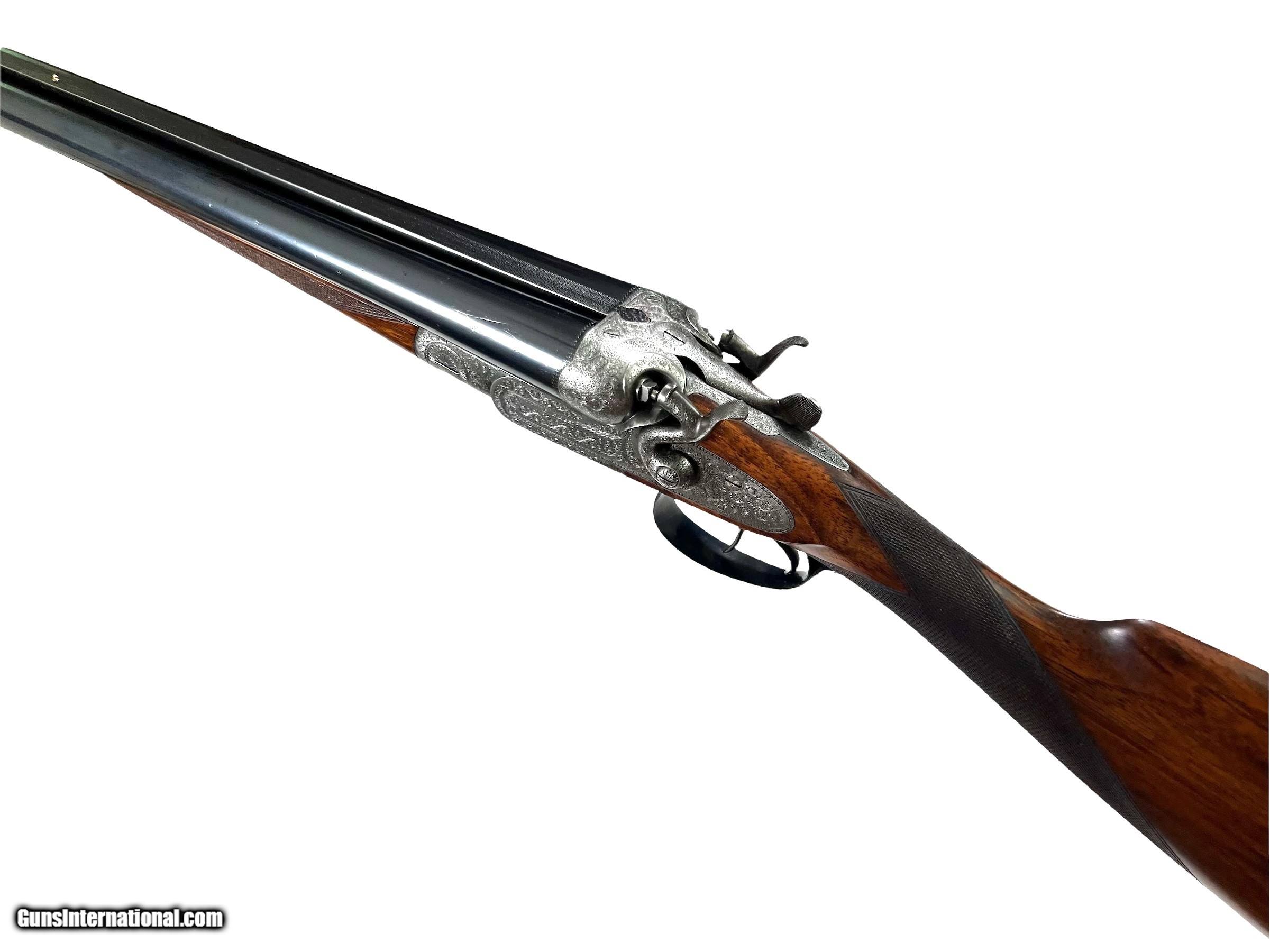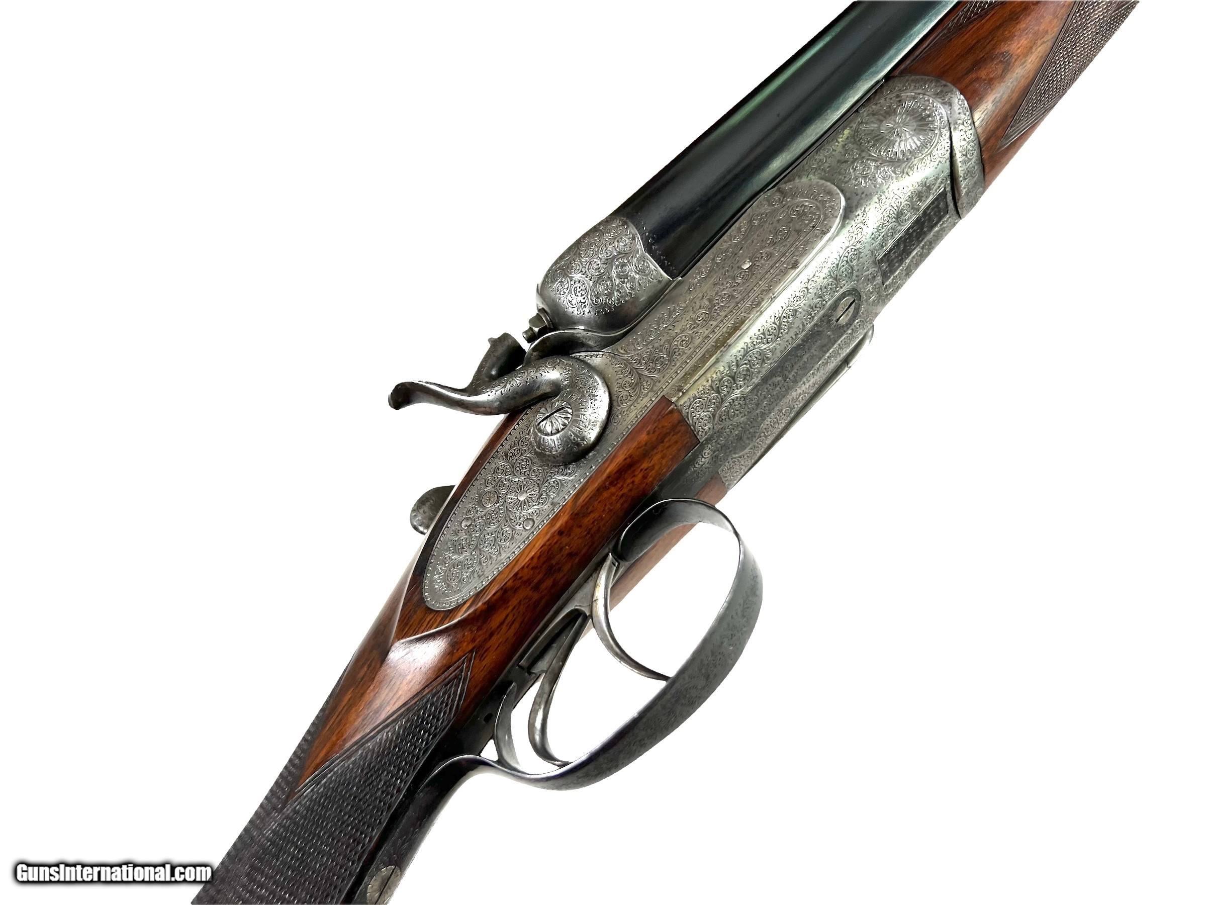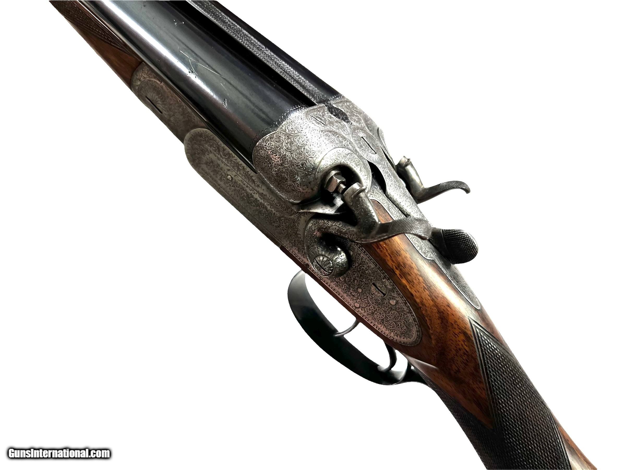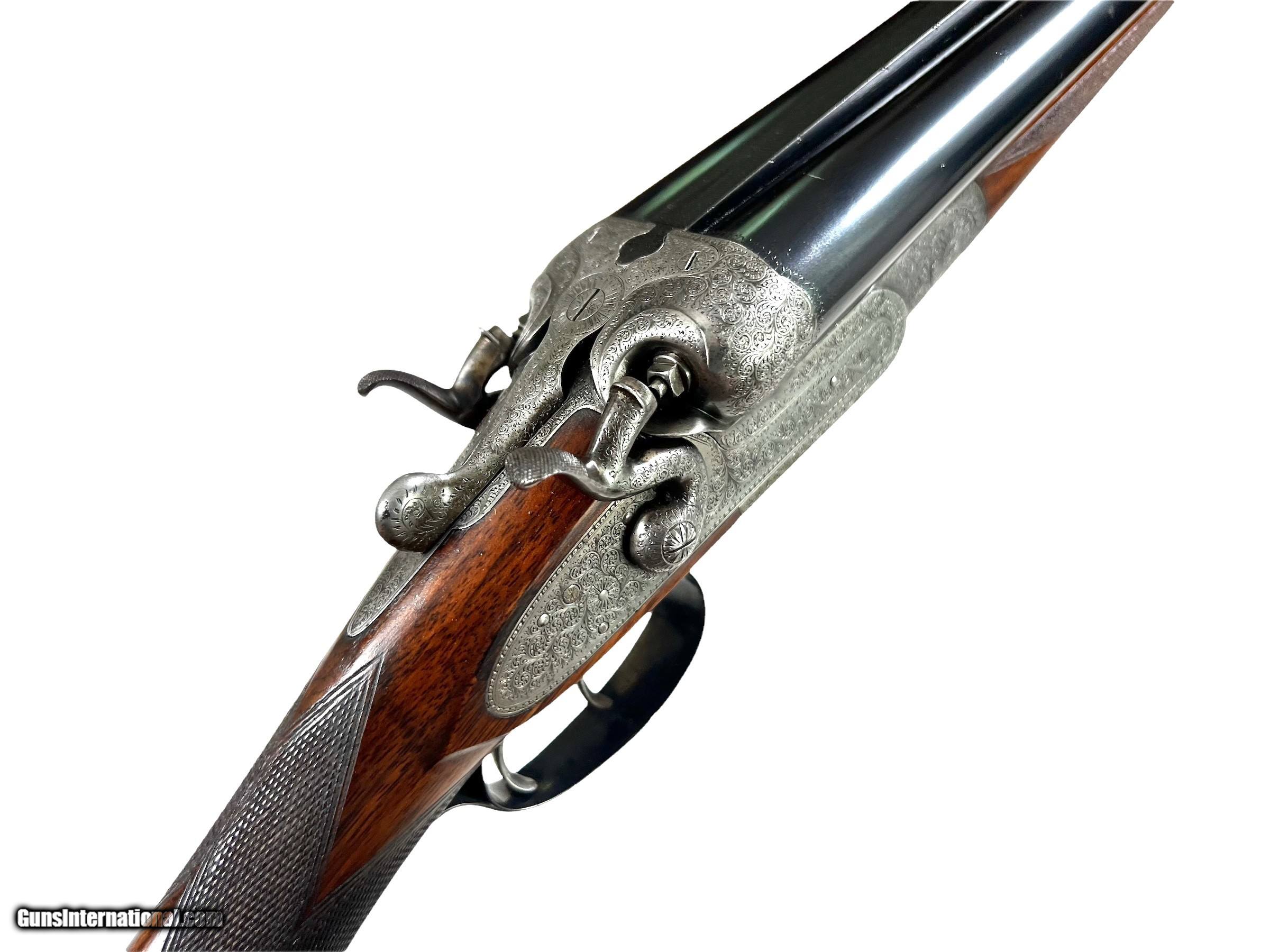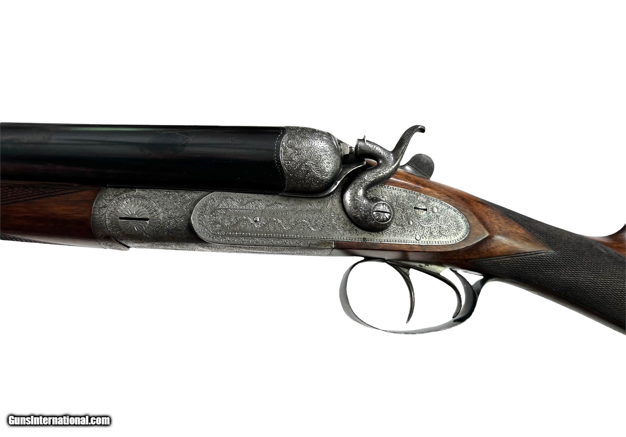 Description: FC Scott hammer pigeon gun 29.5" barrels Belgian proof 2 7/8" chambers Bores measure .734/.734 Choked .043/.045 Minimum wall thickness R: 31/1000 L: 26/1000 LOP 14 7/8 DAC 1 3/8 DAH 1 7/8 Cast off 3/8" 8lbs 3oz Gun was rebarreled in Belgium early on. Sling swivels have been filled(see pictures) bores are bright and clean. There are a couple places of minor pitting on the outside of the barrels. Very fine hammer pigeon gun with fantastic stock dimensions. SOLD Antique: Yes Shotgun Gauge: 12 Gauge |