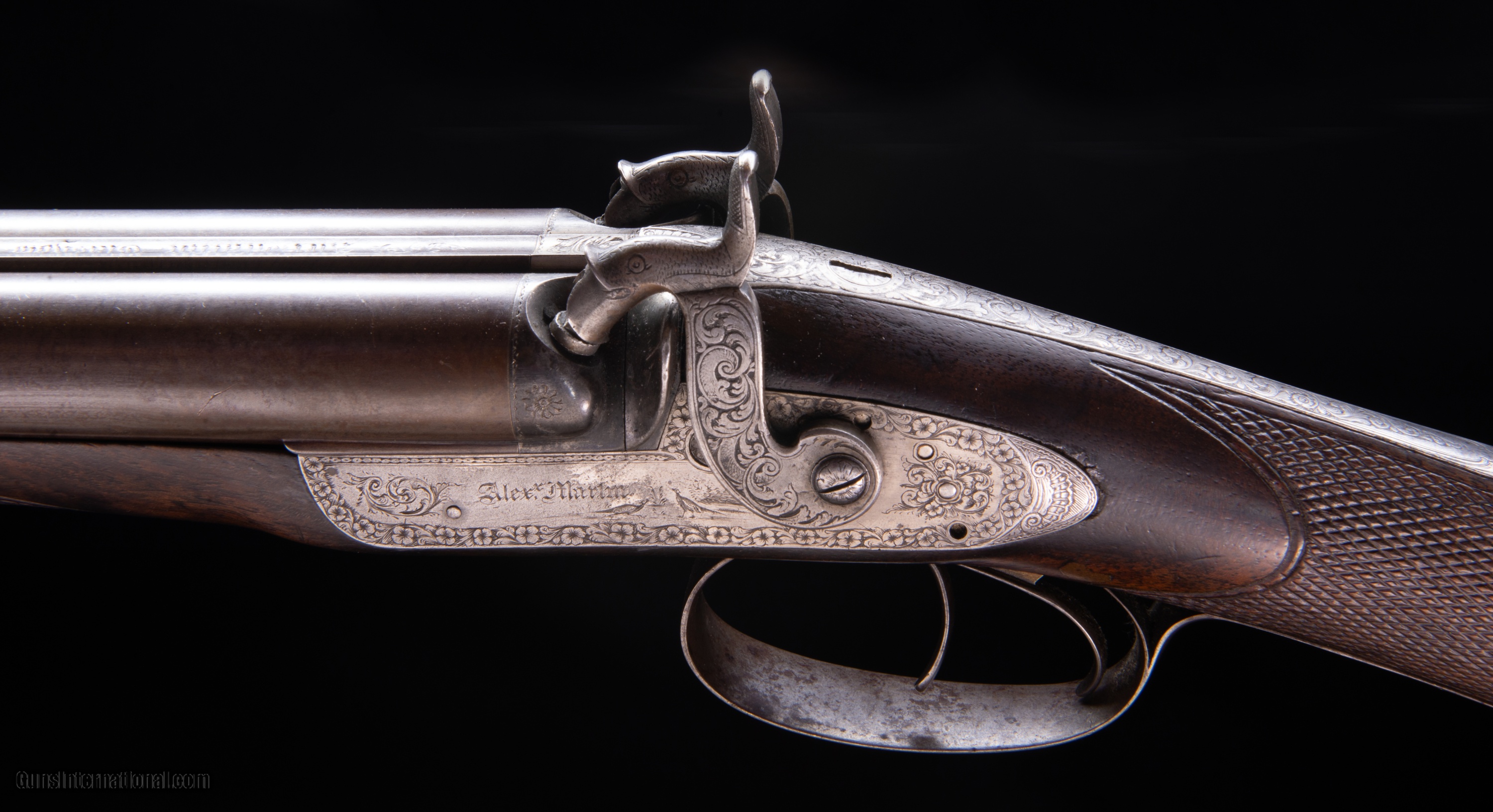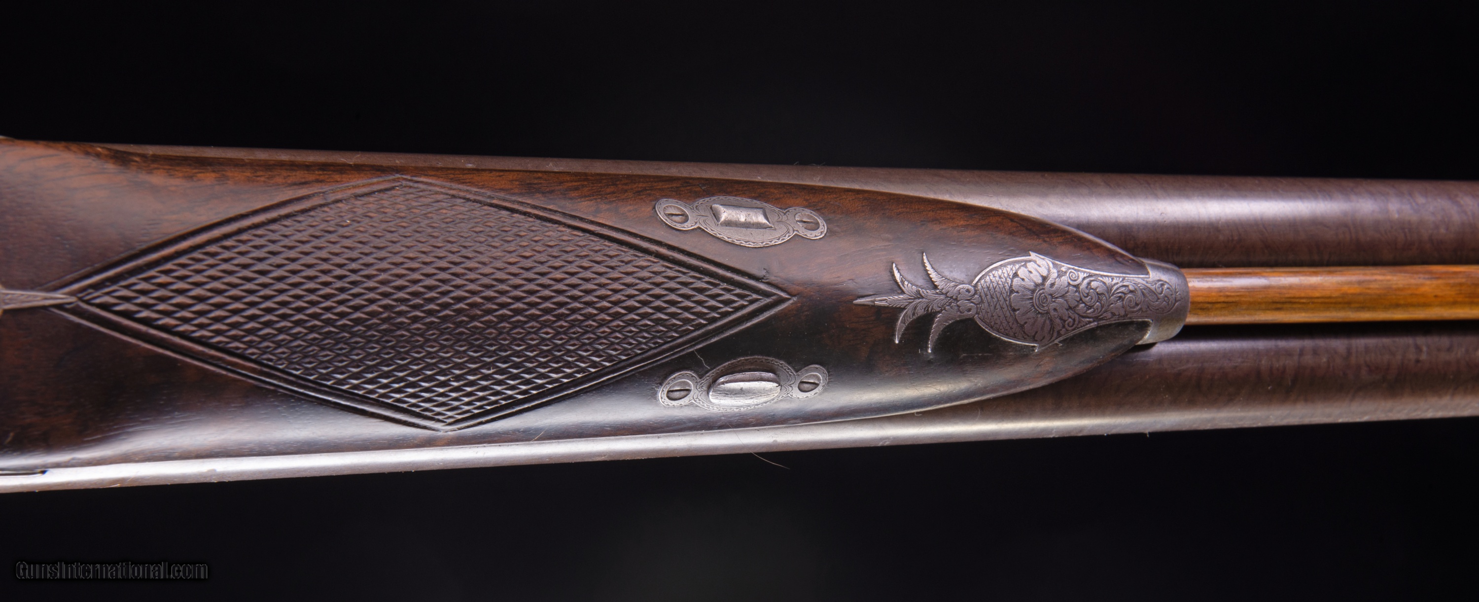 Description: Hammerguns - A very handy and fast swinging double percussion. I particularly like the hammers and the stepped locks. Well, actually I particularly like the wood! *** Note: To see this gun with high resolution photos and a zoom-in feature, go to the vintagedoubles main site and search for the gun ID: 4749 or browse the main site to see our full gun collection. SOLD Manufacturer: Alex Martin of Glasgow Muzzle loader ~ Check out the lovely wood on this fine Scottish lady! Model: None Serial Number: 12 Ejectors: No Barrels: 24.25 Barrel Type: Damascus Action: Muzzle loading percussion Gauge Info: 12 gauge Stock Comb: 1 5/8 Stock Heel: 2 Stock Cast: 1/4 LOP: 14 11/16" with Weight: 6 lbs. 10 oz. Choke Left: .005 Choke Right: Cyl. Proof:Black: X Minimum Wall Thickness Left: .042 at 4" from Minimum Wall Thickness Right: .042 at 4" from |