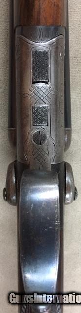 Description: This is a very nice unmarked Belgian Side x Side 410 Ga Hammer Gun, with Nitro Proofed 2.5 inch chambers, plain extractors, excellent bores, etc. Barrels are 27.5 inches in length and chokes are marked .413 and .409. Gun is quite petite and overall length is 43 inches with a length of pull at 13.5 inches to the front trigger. Blued finish on barrels, trigger guard and smooth steel buttplate appears to be the original rust blue finish - with the once case colored action having faded to an even patina. Engraving is minimal but tasteful. Looks very much like guns made and or sold by Francotte - could be a so called "Guild Gun" that was sold by them. Forearm wood has been replaced but matches the buttstock and only lacks checkering to match. All in all a very nice Nitro Proofed 410 Ga Hammer Gun that weighs in at only 4 lbs 1.8 ounces - not the smallest or lightest we have seen but a cutie pie none-the-less. SOLD Curio/Relic: Yes |