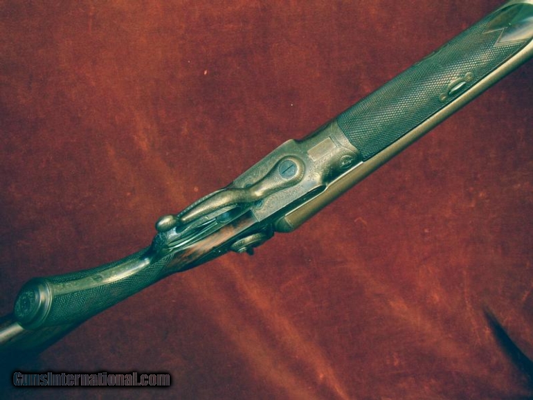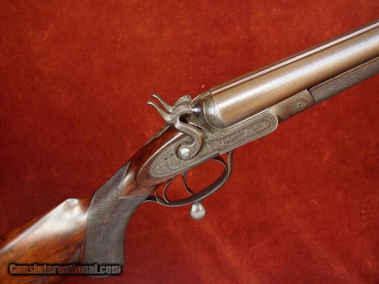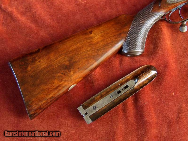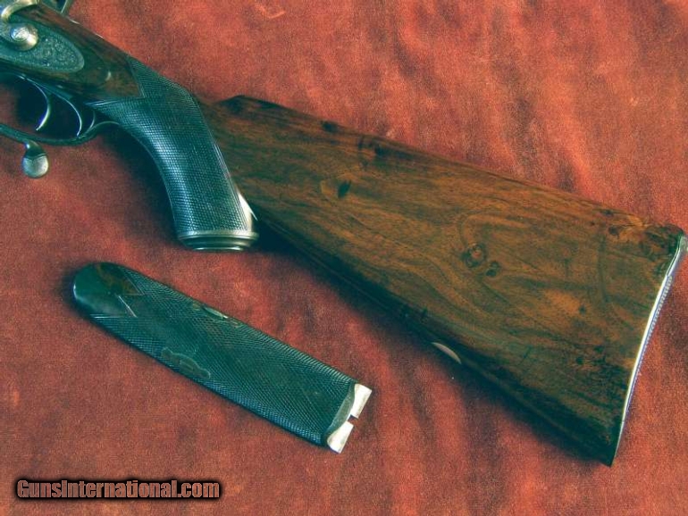 Description: *** SOLD *** Edmund Woods was in business in the centre of London from 1864 until 1891 and gauging by the unmistakable quality of this example, he definitely traded at the upper end of the market. This lovely rotary underlever hammergun was made in the period of much change in the gunmaking world. Centerfire guns had only recently started to replaced pinfire guns and percussion before them. Gun number 1084 was built with old-fashioned non-rebounding locks, converted in the 1880's to the modern rebounding mechanism and it also features an early type of snap action bolting. Undoubtedly made as a pigeon gun, many of the aesthetic and design features that would become the norm can be seen in this early gun. The engraving is a very striking bold foliate pattern and not in the usual symmetrical form, in itself a high end feature. The 30-1/4" barrels have been re-proofed for 3" nitro cartridges and this all adds up to a very strong gun that is a joy to shoot and should give many years of service on game or clays with normal maintenance. *** The action is of traditional bar action sidelock design and features: percussion fences and Bold Foliate Scroll engraving; Jones rotary underlever with Webley patent spring assistance; double triggers; rebounding bar action locks with high, faceted hammers; sprung strikers andcross wedge forend fastening. Gun weighs 8lb 1oz. Engraving style is Bold Foliate scroll. Trigger pulls measure approximately: Front trigger 3 ½ lbs Rear trigger 4lbs. *** The nitro Damascus barrels are 30-¼ " in length, chambered for 3" (76mm) cartridges and are of brazed dovetail lump construction with soft soldered ribs. Top rib is of the smooth, concave game type. The right barrel has a few light vestigial pits and there is evidence of some pitting at the front of the chambers. London reproof for 3” nitro powder cartridges in 2013. Right barrel is bored 0.724 and has a constriction of 0.023 for Modified choke. Minimum wall thickness is 0.033. Left barrel is bored 0.725 with a constriction of 0.021 for Modified choke. Minimum wall thickness is 0.032. *** The pistol grip stock and splinter forend are crafted from figured walnut. The stock is cast-off for a right-handed shot and features a vacant white metal oval and engraved heel & toe plates. There is an antique inlet repair to a shake near the butt, one inlet repair to the forend's edge and the stock appears to have been converted from semi- to full-pistol grip. The forend has a horn tip. Stock dimensions are 14-1/2” by 1-1/2” by 2-5/8”. Cast off for right hand shot. I give a 3-day non-firing inspection and will only accept returns if gun is not as described. *** Great gun for clays for game and clays. US Agent for Heritage Guns UK. SOLD Antique: Yes |