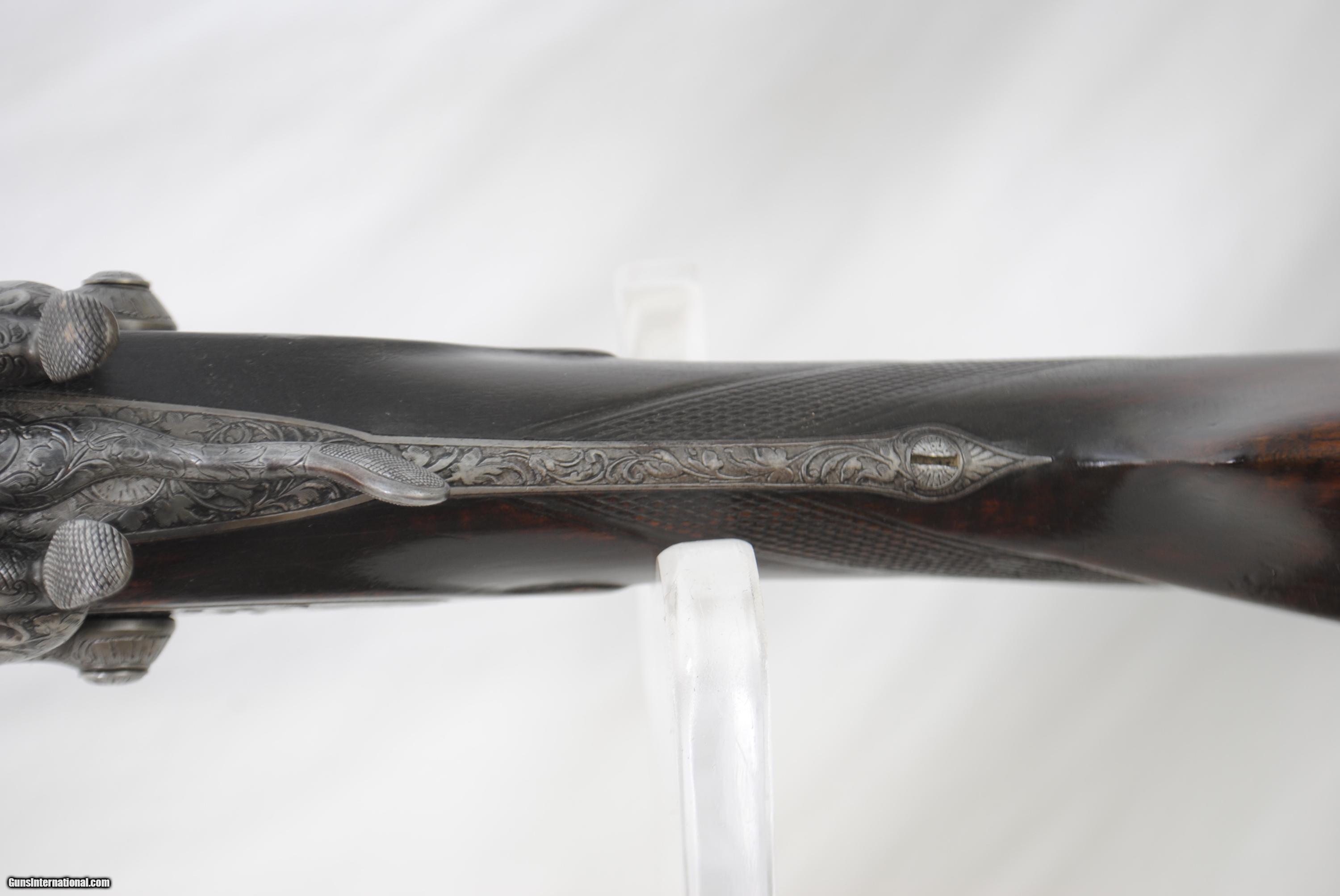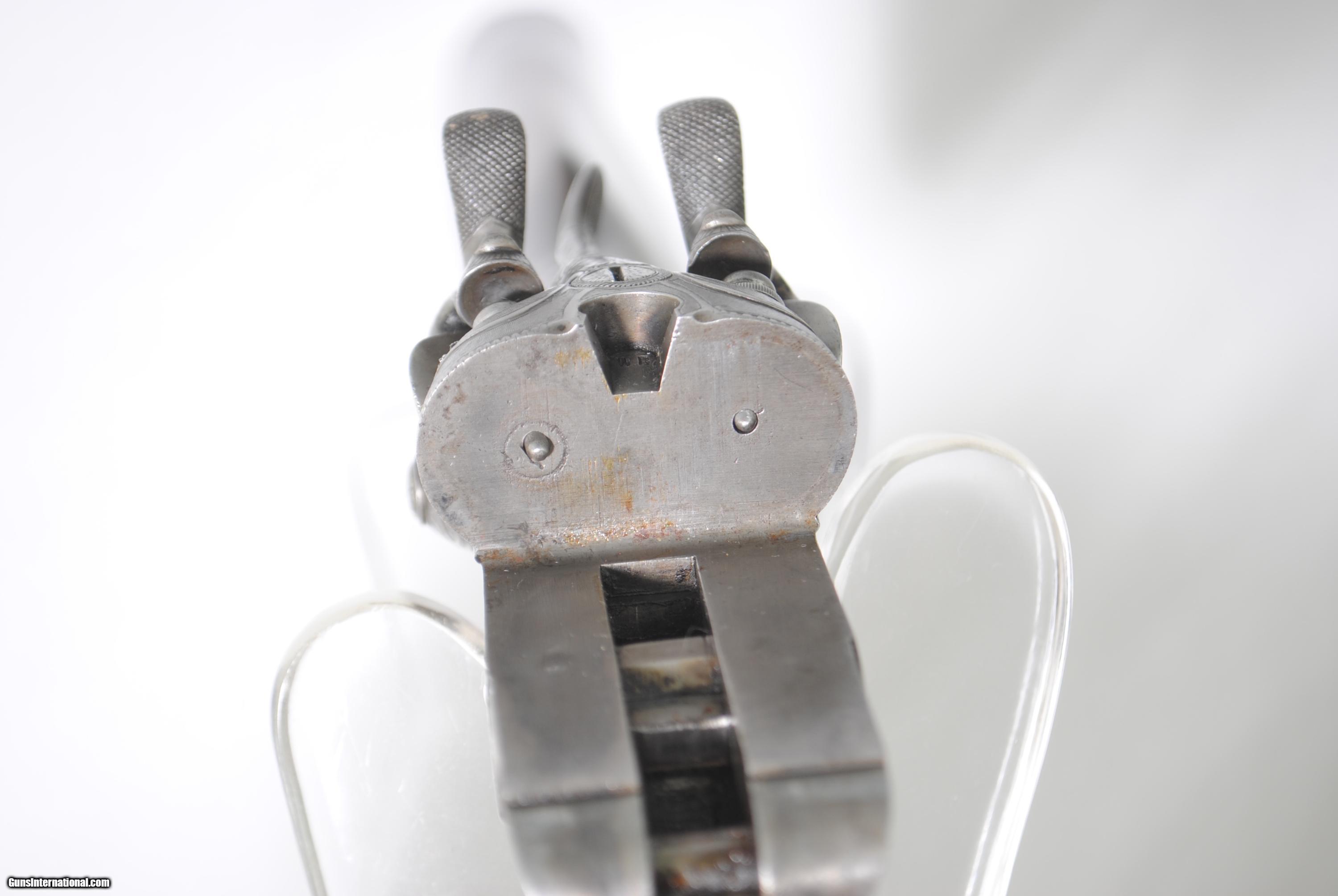Description: Here is an interesting cape gun of high quality with elaborate engraving. Shotgun barrel is damascus while the rifle barrel is fluid steel - a less often seen combination. Excellent bores in both. Shotgun barrel measures .662 with 20/1000 choke (Light Full). Chamber is 2 1/2". Rifle is 11.2 x 51R Kropatschek. A sketch (not to scale) of the chamber casting is shown as the last photo. Rebounding hammers. Lever forend fastening system. Elegant clamshell fences. Gun is tight on face. Weight of gun is 7 LBS 9 1/4 OZ. Makers name or retailers name and location is engraved on the barrel - C. Frandsen / Vejle. Best I can tell is that Vejle is a town in Denmark. LOP is 13 1/2". Shipping is $50. For inquiries please call Guy - 407-721-3748 SOLD Curio/Relic: Yes |