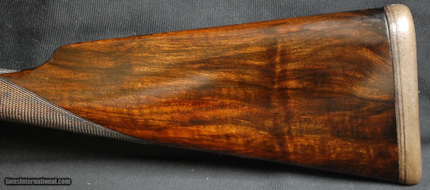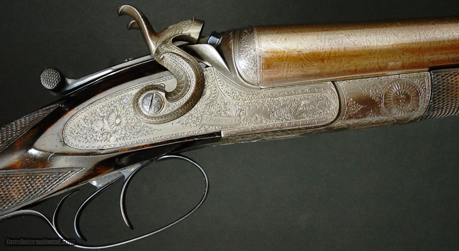 Description: J. Reeves & Co. Hammergun 12ga., 29 ¾” CYL/CYL, thumb lift opener, straight grip, gold oval, leather covered pad, horn tipped splinter forend, extractor gun, beautiful Damascus barrels, modern Birmingham reproofed at 850 BAR, solid game rib, splendid restoration, with all case coloring remaining, dog and duck engraving surrounded by full coverage scroll, excellent wood finish and checkering, extremely clean and tight gun.