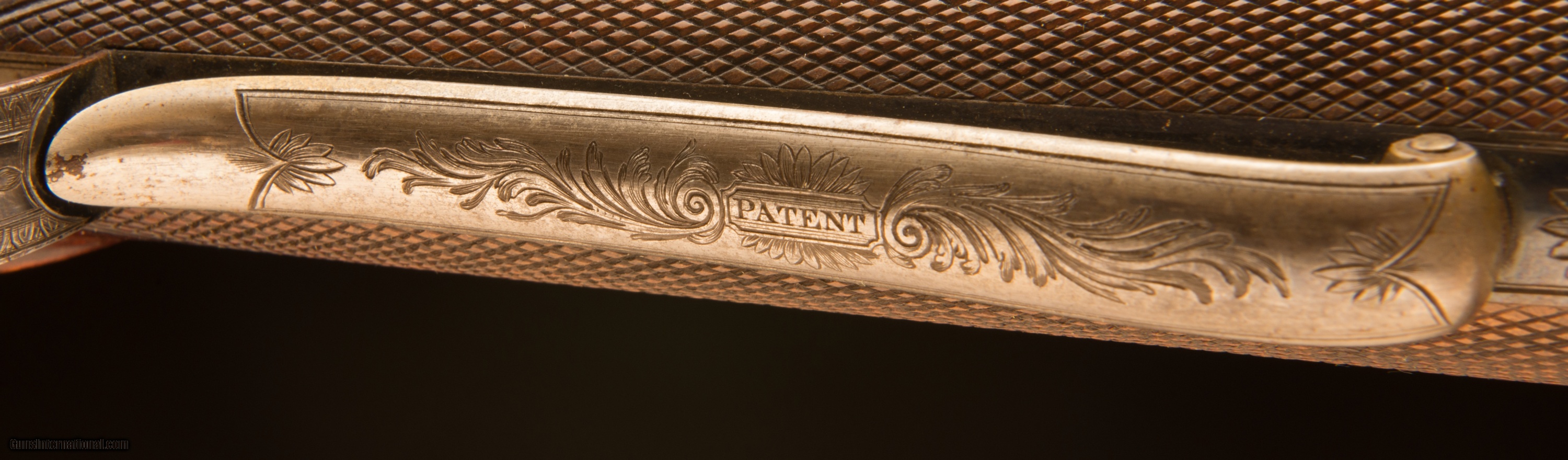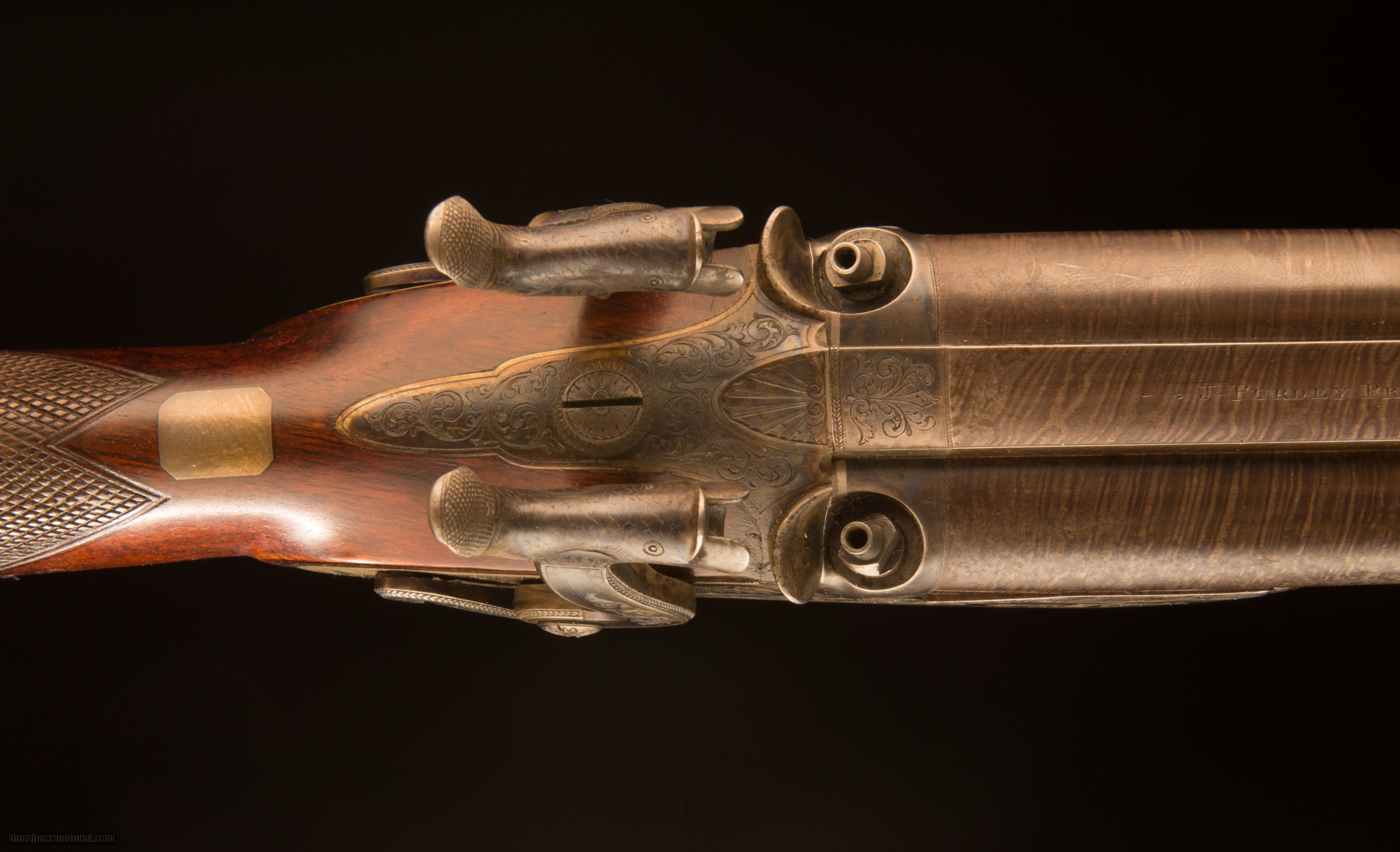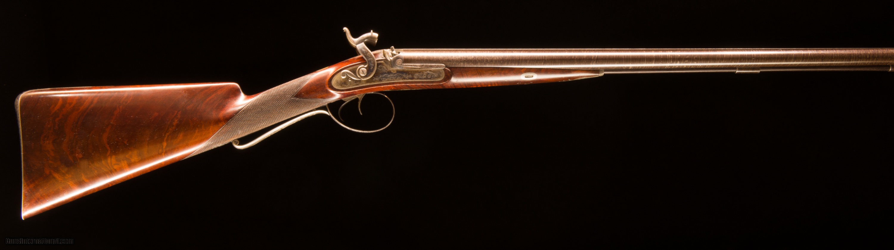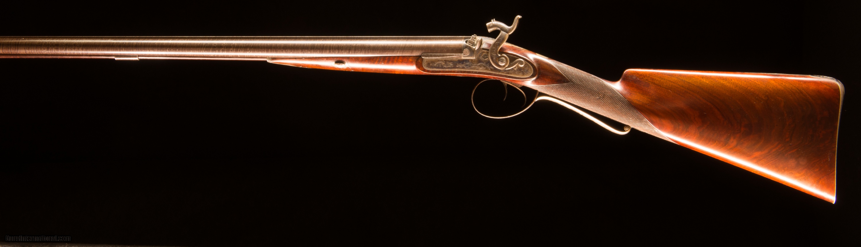 Description: From the famous W Keith Neal collection the card with his signature found in the case says "This Purdey Gun No. 287 was made about 1820 as a flint-lock, but subsequently rebuilt by Purdey\'s as a copper cap gun and apparently never used since, as it is in mint condition. I purchased it from Mr. Howes, late of secretary to Purdey\'s to whom it was given by a customer of Purdey\'s. It is of great interest having Purdey\'s original intercepting sear locks and safety lever. It will be noticed that the case retains it\'s original compartments for the locks which still fit but not quite so well with the percussion hammers. The serial number appears on both the barrels and the edge of the lock plates. The trade card is the first one at the first address of Princess St. Leicester Square." This is an extremely rare Purdey in excellent condition. Mr. Neal describes the gun as mint but I would give it a near mint as it has some handling marks. The gun comes with the signed letter from Purdey and the signed card by W. Keith Neal. It is of note that the gun is featured on two pages, one a color plate, in Donald Dallas\'s "Purdey - The Definitive History." *** Note: To see this gun with high resolution photos and a zoom-in feature, go to the vintagedoubles main site and search for the gun ID: 3419 or browse the main site to see our full gun collection. |