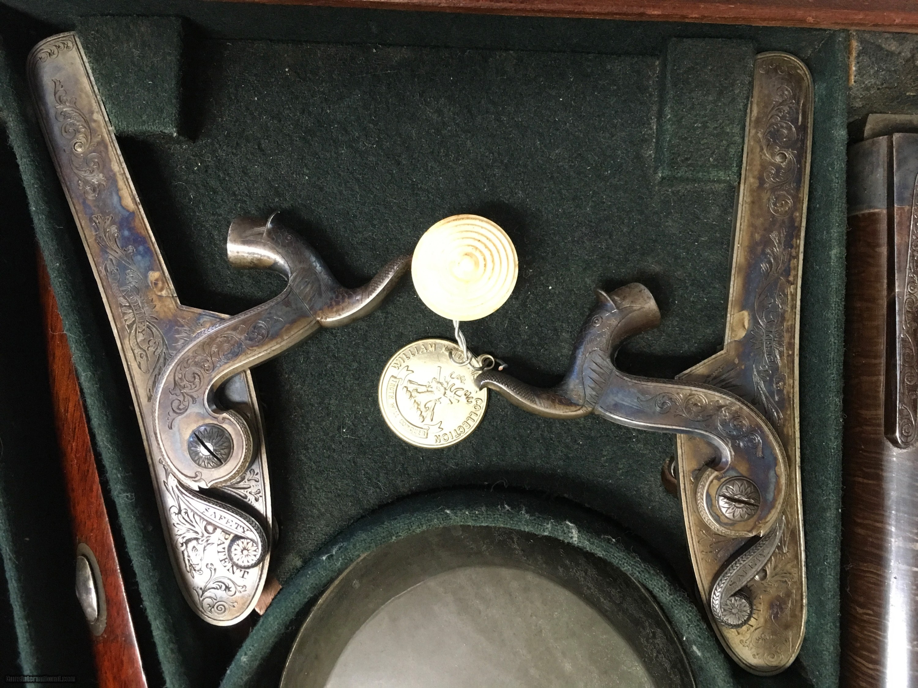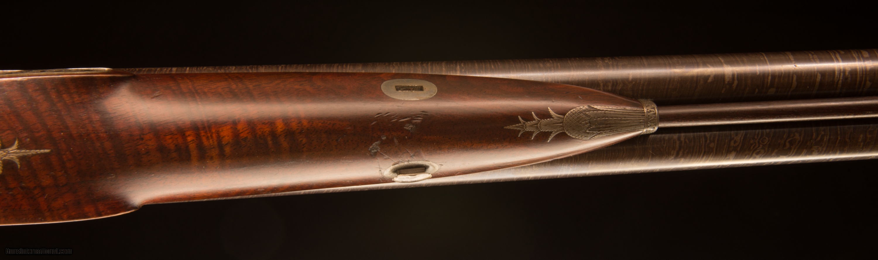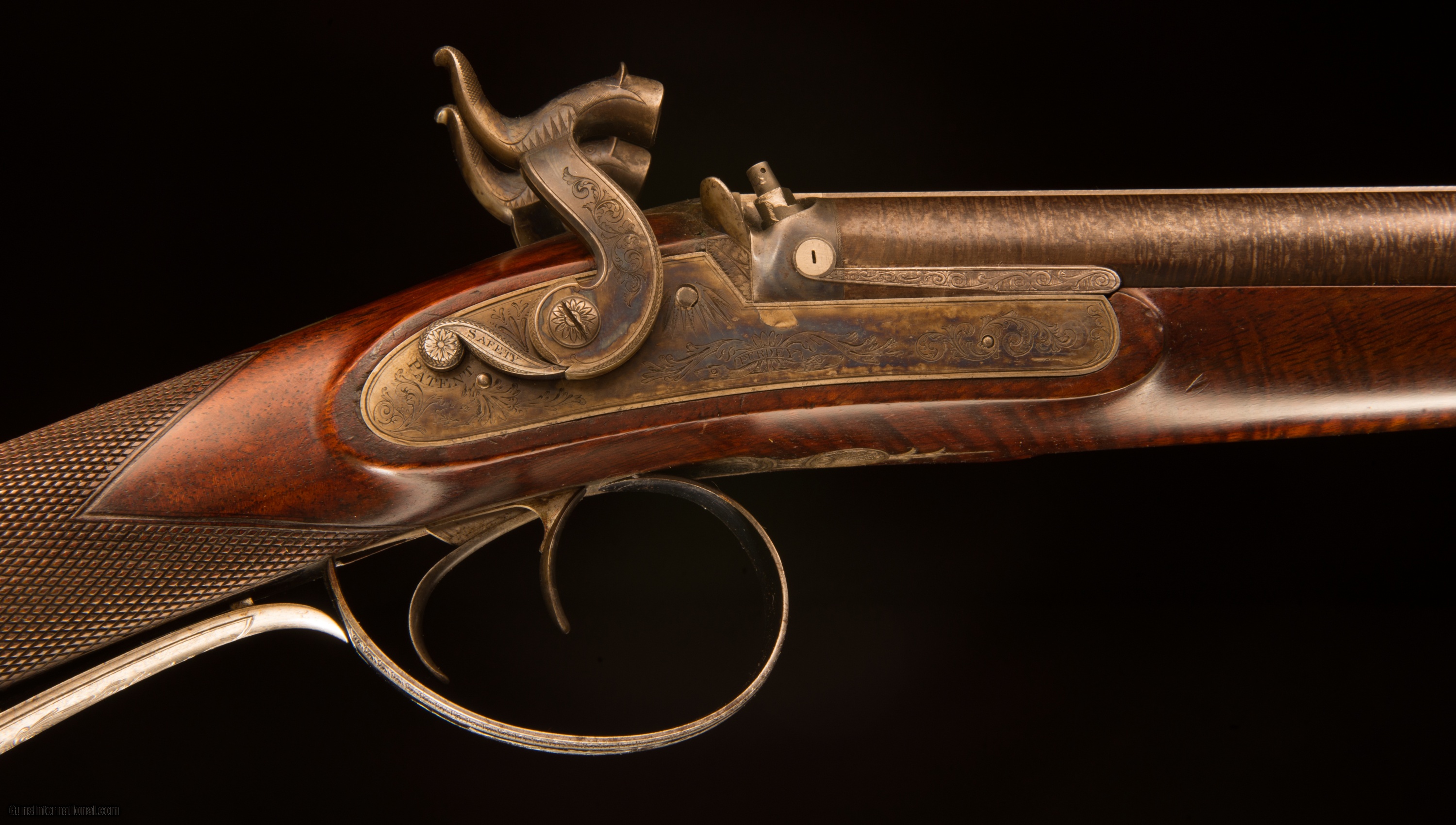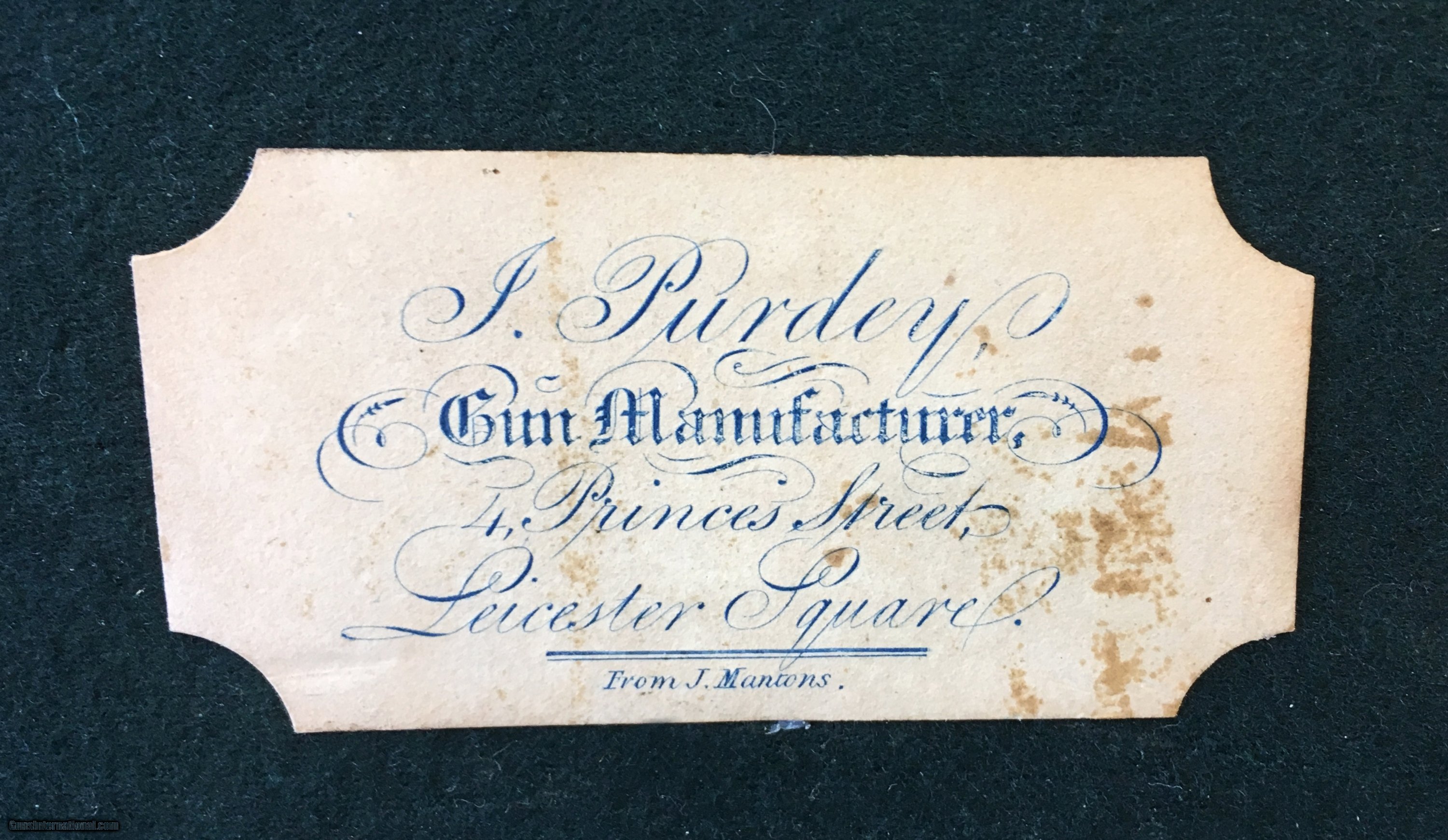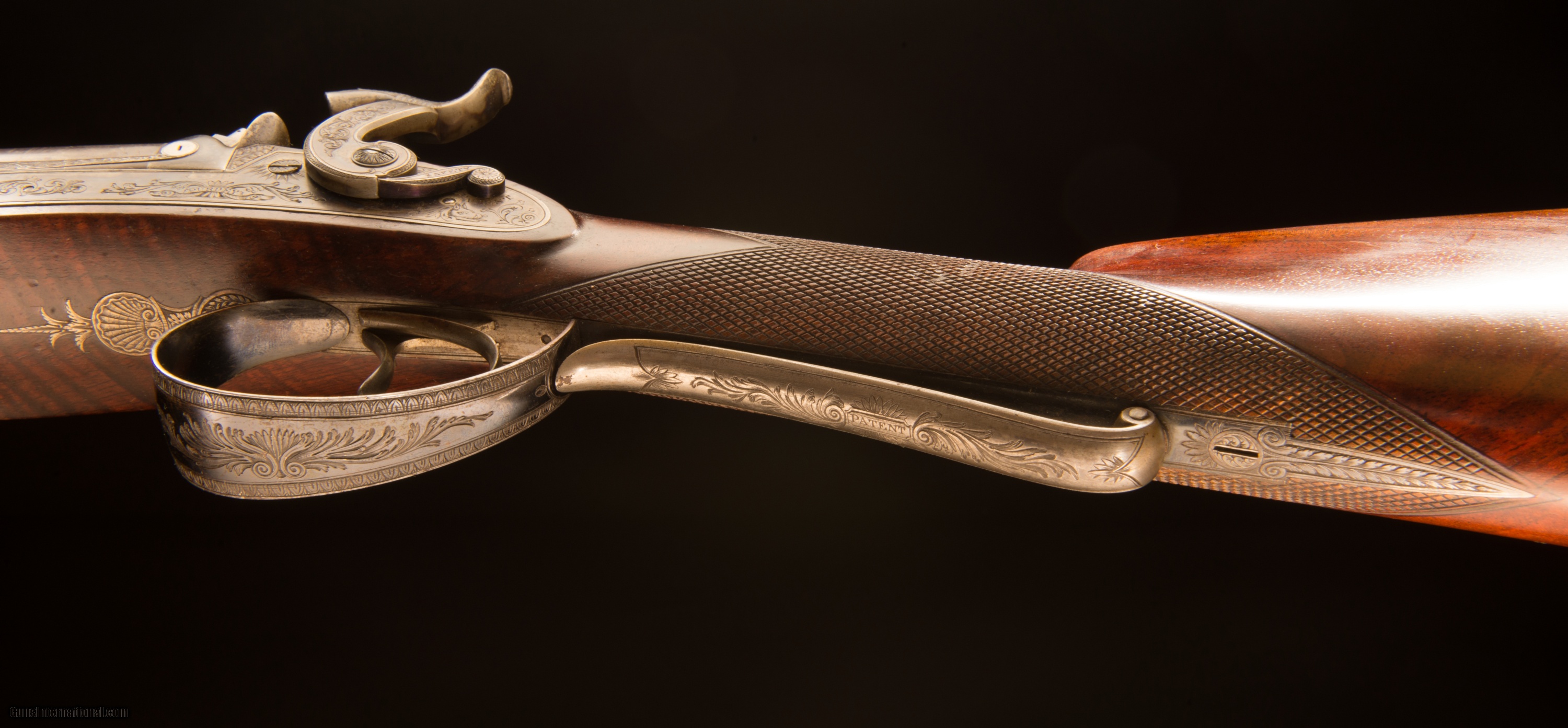 Description: From the famous W Keith Neal collection the card with his signature found in the case says "This Purdey Gun No. 287 was made about 1820 as a flint-lock, but subsequently rebuilt by Purdey\'s as a copper cap gun and apparently never used since, as it is in mint condition. I purchased it from Mr. Howes, late of secretary to Purdey\'s to whom it was given by a customer of Purdey\'s. It is of great interest having Purdey\'s original intercepting sear locks and safety lever. It will be noticed that the case retains it\'s original compartments for the locks which still fit but not quite so well with the percussion hammers. The serial number appears on both the barrels and the edge of the lock plates. The trade card is the first one at the first address of Princess St. Leicester Square." This is an extremely rare Purdey in excellent condition. Mr. Neal describes the gun as mint but I would give it a near mint as it has some handling marks. The gun comes with the signed letter from Purdey and the signed card by W. Keith Neal. It is of note that the gun is featured on two pages, one a color plate, in Donald Dallas\'s "Purdey - The Definitive History." *** Note: To see this gun with high resolution photos and a zoom-in feature, go to the vintagedoubles main site and search for the gun ID: 3419 or browse the main site to see our full gun collection. |