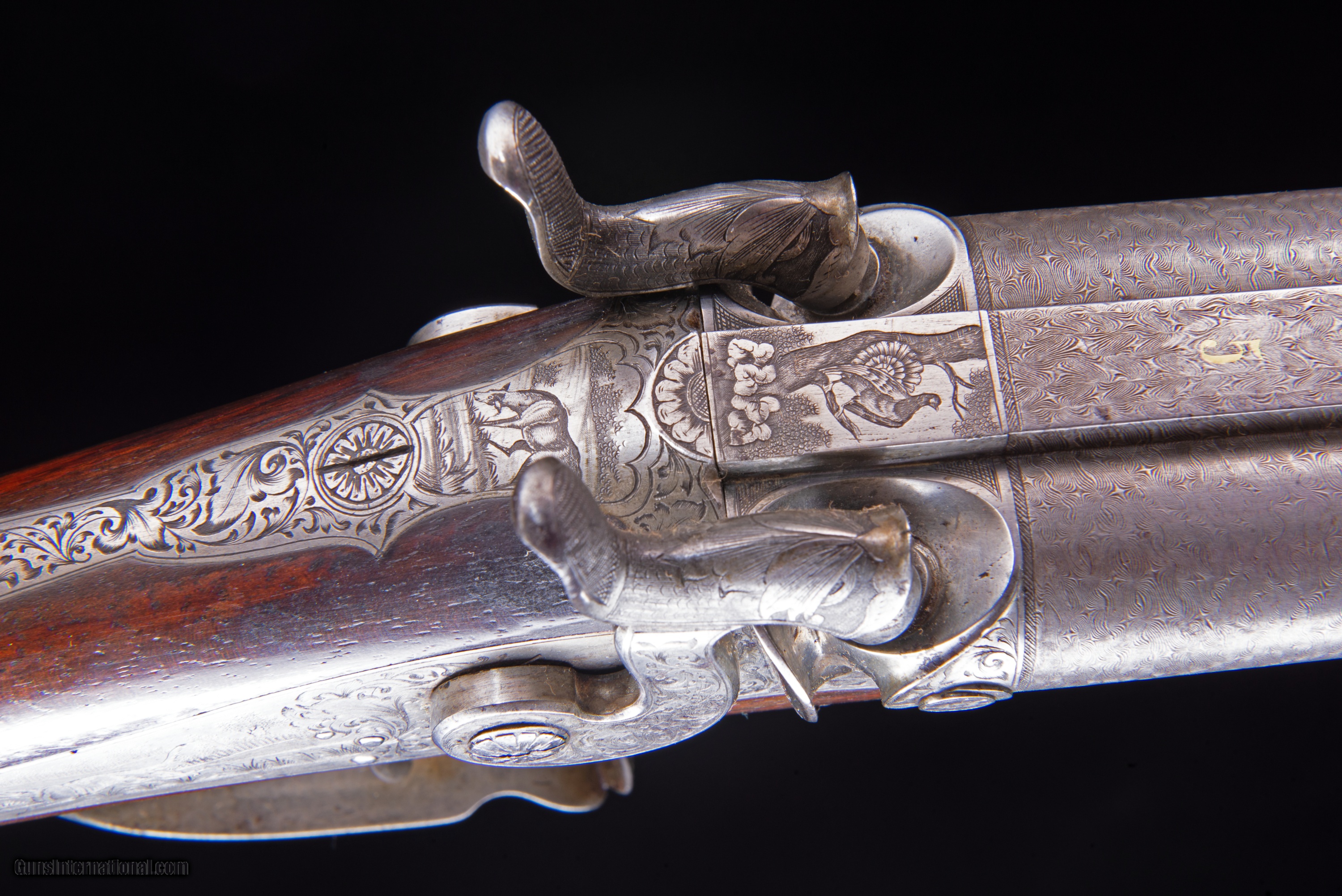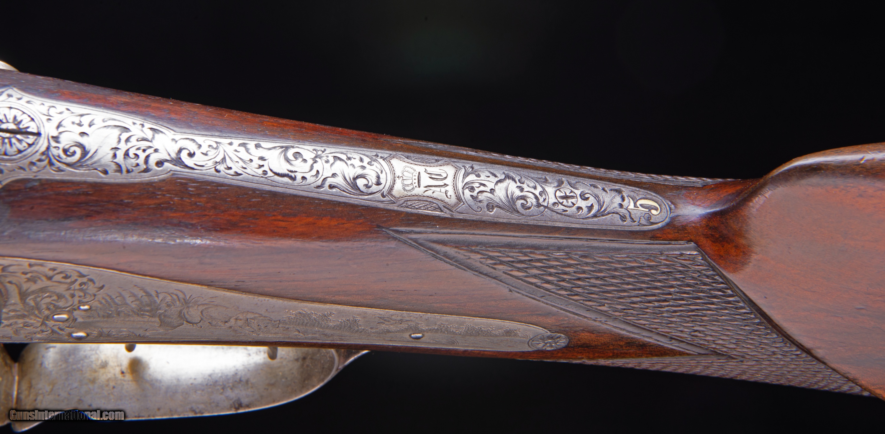 Description: Hammerguns - This is an outstanding piece of functional gun art and as far as I can see is ready for the field again at any time. The royal crown on the initial plate indicate royalty. The bores are wonderful and the condition super high.