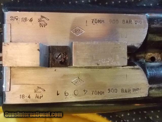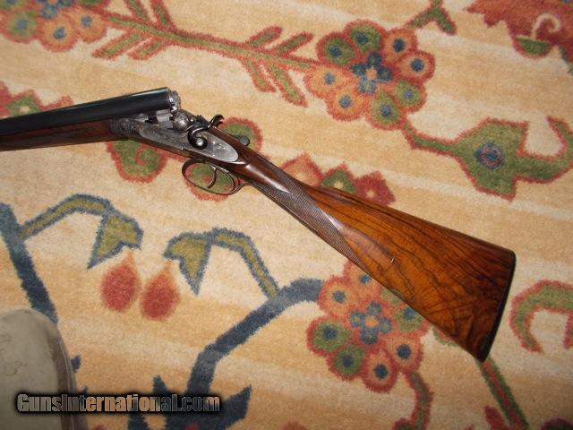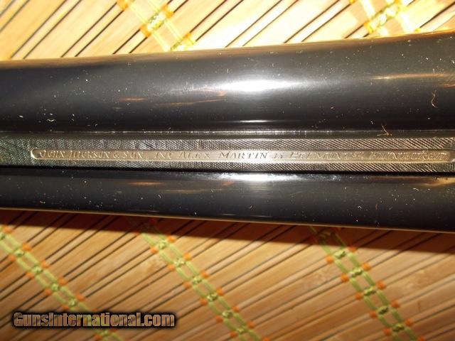 Description: 1887 John Dickson Hammer Gun: Re-barreled, 30 inch steel, chopper lump barrels, London proofs, 2001 2 3/4 inch, (70mm), 900 BAR. SN 4091. Chokes R. .001 L. .021. Beautiful figured wood, no cracks, chips. There is one small plug repair in forend, barely visible. Stock measurements are LOP 14 3/8, DAC 1 5/8, DAH 2 3/8, Cast off approx. 1/4 inch. The butt plate is the original horn plate. Gun is clean, tight on face, and a great shooter for game and much fun for "clays." The face of the right hammer shows a little more wear than the left, as typical of old hammers, but both locks/hammers function perfectly with good trigger pulls. The new barrels, according to a letter from Dickson, are not Dickson. But Dickson says that they do match the specs of the original 30 inch barrels as they were also 30" steel and with similar chokes. In that day, steel was not yet as preferred as damascus barrels. Wt. 6' 10oz. SOLD Curio/Relic: Yes |