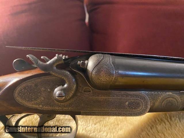 Description: Excellent cased 12 gauge Brancquaert Model 5 Bar Action Hammer Pigeon Gun. Louis Brancquaert provided guns to his clients during the heydays of European Live Pigeon shooting. This gun produced in the early 1920s, post-war and during the best shotgun production times for England and Belgium. This robust 12 gauge gun enjoys original 2 3/4 (70 mm) chambers and has complete Belgium proof marks (see photos). Gun weighs 7pounds 2 ounces. It boasts a Purdey-type hidden third bite, side clips, and an articulated front trigger. Nickel steel barrels in excellent condition with length of 29 1/2 inches (75 cm). Right barrel measures .726 inch with Mod (.010 inch) choke, and the left barrel also measures .726 inch with ImpMod (.018 inch) choke. Wall thickness at .027 right barrel and .026 left. Barrels tight on face. Barrels perfect internally, with exterior showing minor wear from handling the past 100+ years. The barrels are topped by a raised matted concave rib with gold front bead. This gun has double triggers and extractors, the front trigger articulated. Barrels fully in Belgian proof with original 12 gauge and 70mm/20.6mm chamber designations (see photos). A straight stock and splinter fore-end of figured European walnut. Stock dimensions are 14 1/4 inch LOP by 1 3/8 inch DAC and 1 7/8 inch DAH. The stock has a new 1/2 inch replacement Silvers type recoil pad (see photo 10), with a stock wood length of 13 3/4 inches, easily "pad-adjustable" to any customer desired LOP. Cast neutral at face. The buttstock shows small handling marks, but, as with the entire gun, no damages, cracks, dents, bulges, etc. Stock photos show stock lighter colored than actual, with color better shown in photo 1 (gun cased) and photo 10 (replacement pad). The action and fore-end iron are perfectly engraved with excellent rose and scroll engraving, finished in a French grey (see photos). The name "Louis Brancquaert (over) Brussels" is engraved on the action bottom (see photo 6). Beautiful rebounding hammers sit low when cocked so as to not interfere with shooter's line of sight (see photo 4). Barrels tight on face. Serial number 1682 on all components. Louis Brancquaert and several members of the Defourny family combined their talents and contacts to promote their guns in the very active European pigeon circuit of the 1920s. Brancquaert was a well-known pigeon shooter who supplied his well-heeled friends with competition shotguns. The enclosed handbook/catalog (copy) lists the championships won using Brancquaert guns. Brancquaert maintained his shop on 202 Avenue d" Hippodrome in Brussels, moving guns from the Defourney shop to his in order to support his local business and his distributors throughout Europe. This particular gun has a gold ducat on the fore-end, likely signifying royal bloodline ownership at the beginning of its life. A great gun for club trap, vintager outings, sporting clays and squab shooting at local farms. Provided in a labeled canvas and leather case. Accompanying this fine shotgun are several articles of research regarding the Brancquaert/Defourneys work and the before-mentioned copy of the original catalog for these guns. This is an opportunity to own one of the finest hammer pigeon guns available that remains in its original state, easily equivalent to any London Best gun. Shipping and insurance to be paid by the buyer at a fixed rate of $ 75. Shipment to CONUS FFL locations only. Item may also be retrieved from current location in Nashville, Tennessee. Photo zip file or specific requested pictures available to interested parties via email. Happy to discuss reasonable offers. Thank you for your consideration. SOLD Shotgun Gauge: 12 Gauge Manufacturer: Brancquaert Model: 5 Serial Number: 1682 Barrel Length: 75 cm (29 1/2 inch) Bore: 12 gauge Chambers: 2 3/4 Condition: excellent Metal Condition: excellent Wood Condition: excellent Bore Condition: excellent Barrel Type: Nickel Steel Action: SxS Triggers: Double Stock: Straight Manufacture Date: Circa1920 Chokes: Fixed Case: Brady style |