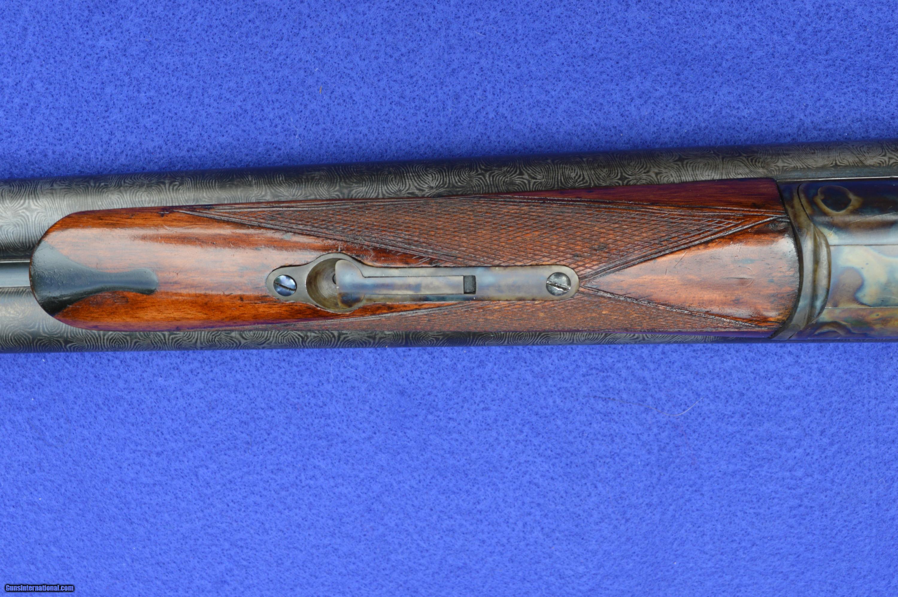 Description: This Grade 3 Remington Model 1889, which was manufactured in 1901, is not only ready to go back into the field to do what it was made to do, but has already been there. Pictured is almost certainly the first bird taken in a 100 years by this Damascus-barreled hammergun, which has been given a new life not only by proper reconditioning but by the ready availability of factory-produced low-pressure shells designed to be fired in Damascus barrels. The wood, as refinished with hand rubbed stock oil, is attractive and solid. The Oxford Crolle pattern in the Damascus steel is distinct, as refinished using the tradition process of slow rust bluing and etching. The bores are bright as honed. The color case hardening, which was redone by Classic Guns in Crete, IL, is brilliant. The 32” barrels are choked Light Modified (.015) and Improved Modified (.025). The wall thicknesses (top/side/bottom) for the right barrel at 9” from muzzle are 046/.037/.042 and at the middle of the barrel are .058/.050/.050. The wall thicknesses of the left barrel are .046/.040/.038 and .059/.055/.0548, respectively. Bores 9” from the breech are both 729. Chambers are 2-3/4”. The gun locks up tight and on face; the top lever returns to center. This shotgun weighs 8 lb 10 oz. The drop at the comb is 2-1/8 and at the heel 3-1/8”. Length of pull from the front trigger to the end of the original butt plate is 14”. All serial numbers, 207705, match. The inspection period is 7 days from receipt. This shotgun has been fired on the range and in the field using low pressure 2-3/4” shells produced for Damascus-barreled shotguns by RST Corporation. However, as for any antique or vintage shotgun, and especially one a hundred and fifteen years old, it is recommended that the new owner have it inspected by a professional gunsmith before firing and then only use shells that produce pressures for which the gun was designed. The gun carries a 30-day warrantee, during which Back in Time will have any mechanical problems documented by a professional gunsmith repaired or accept the return of the gun and refund the price of the gun and the return shipping cost. The listed price of the gun does not include shipping costs paid by buyer. Please do not hesitate to call with questions Stephen Wesbrook, 703-625-4830; Back in Time, LLC -- preserving late 19th and early 20th Century double shotguns. SOLD Curio/Relic: Yes |