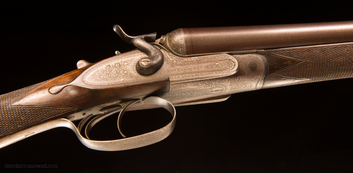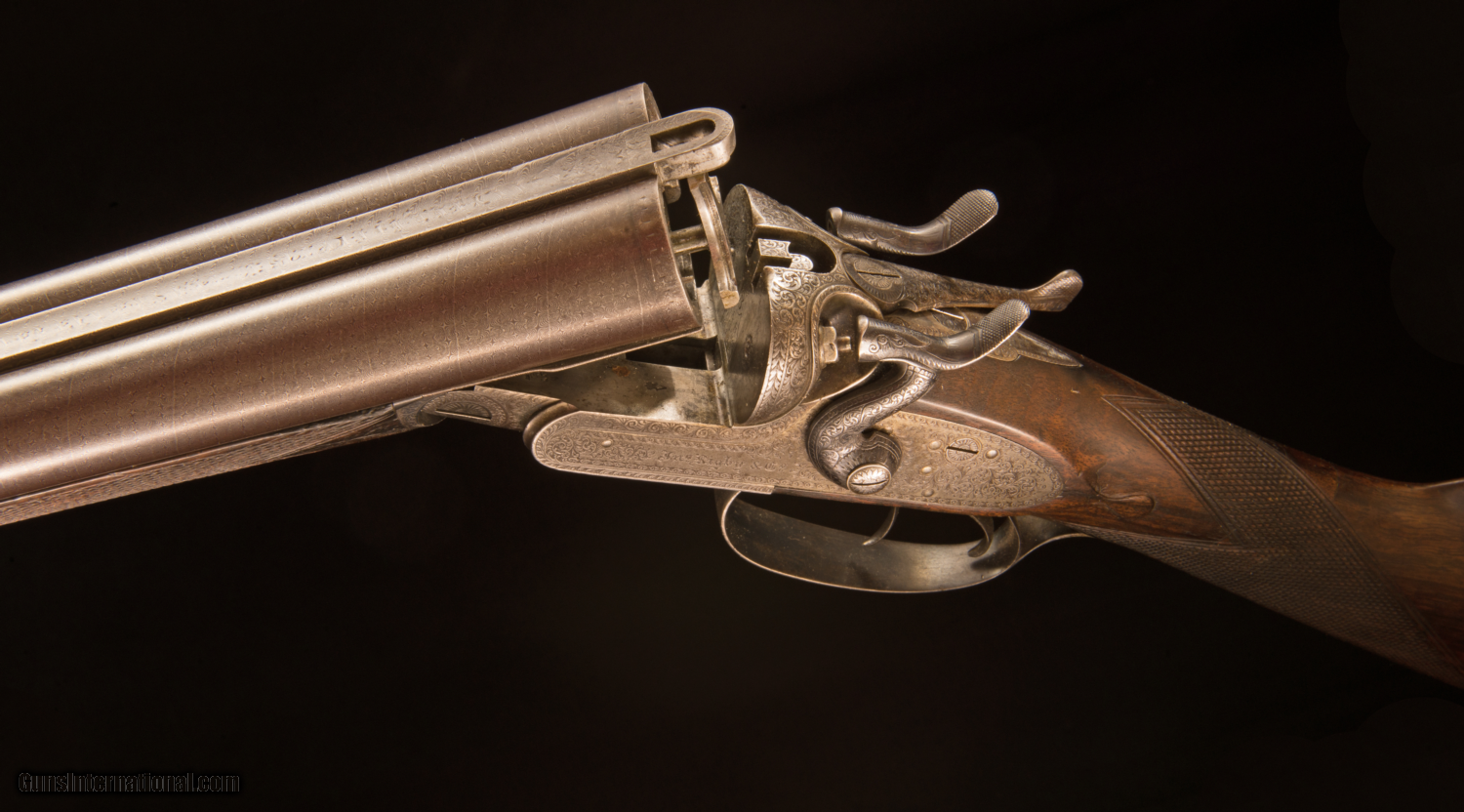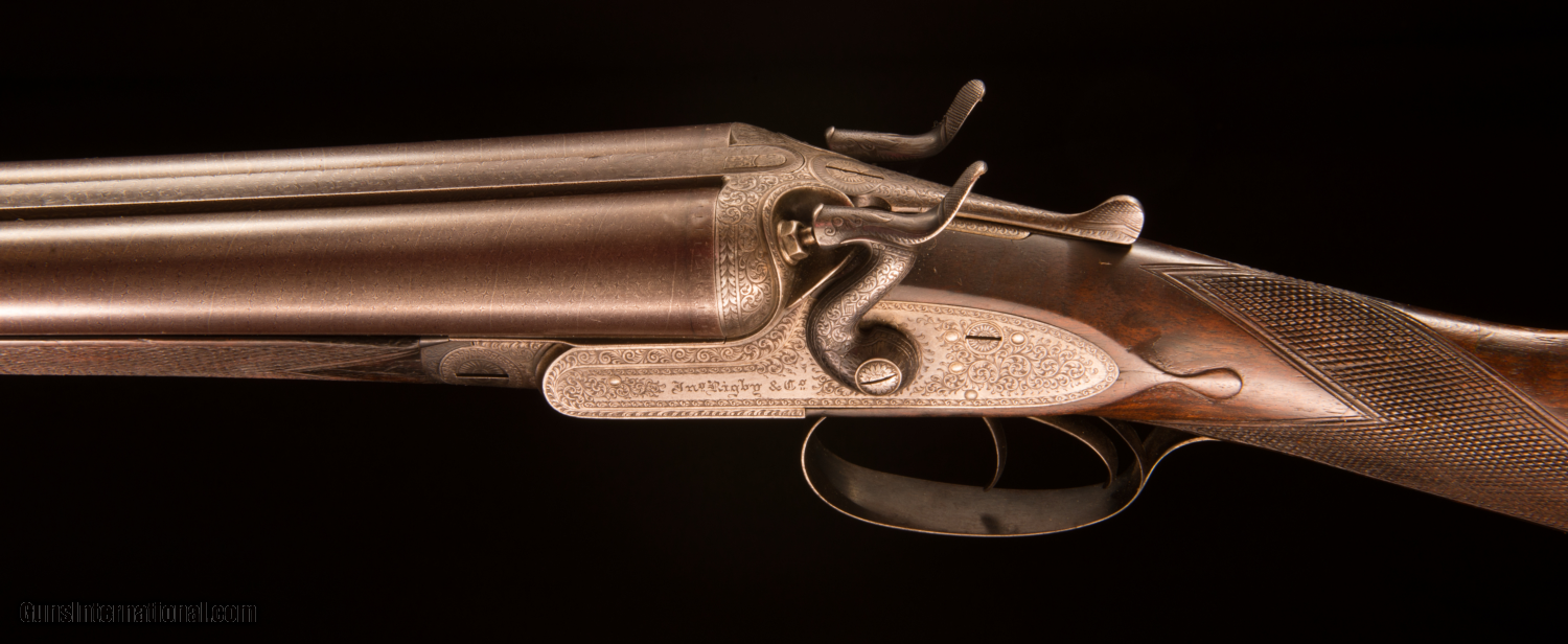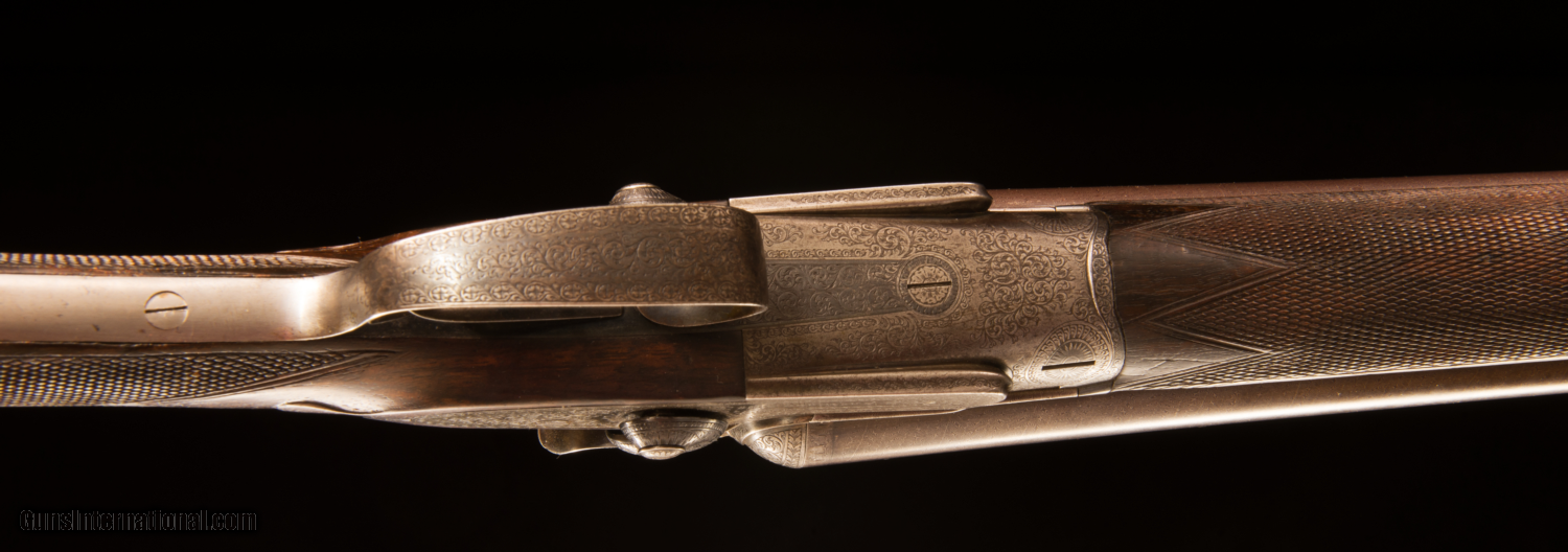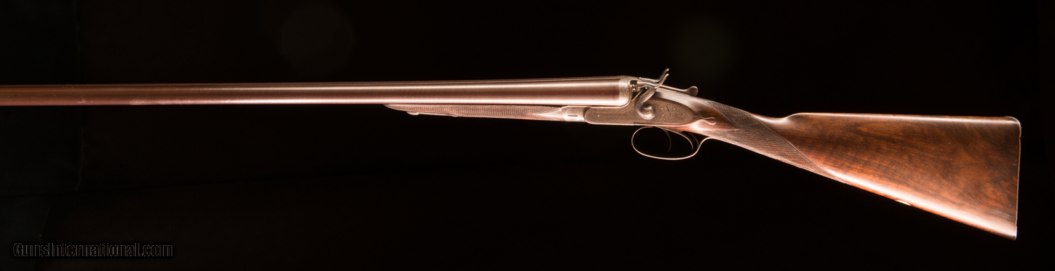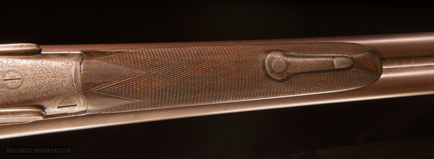 Description: I love the Rigby rising bite on this gun, the only one I have ever seen on a hammer Rigby. Bright bores and great dimensions. SOLD Antique: Yes Manufacturer: Rigby rising bite top lever Serial Number: 15159 Ejectors: No Barrels: 30 Barrel Type: Damascus Action: Top lever bar action with Rigby rising bite Gauge Info: 12 gauge Stock Comb: 1 5/8 Stock Heel: 2 Stock Cast: 1/8 LOP: 14 1/4 Weight: 6 lbs. 3 oz. Choke Left: .036 extra full Choke Right: .016 Mod Proof:Black: 2 1/2 Minimum Wall Thickness Left: .019 Minimum Wall Thickness Right: .019 |