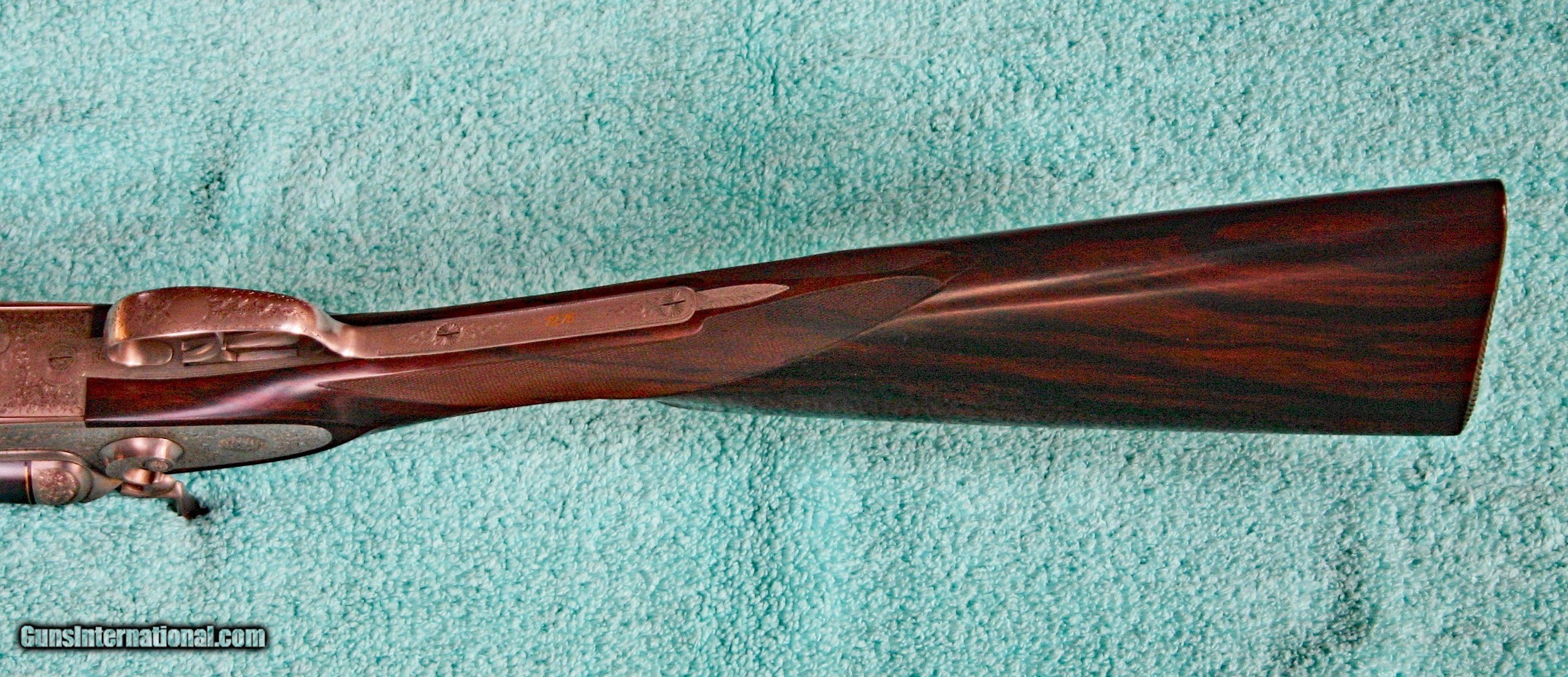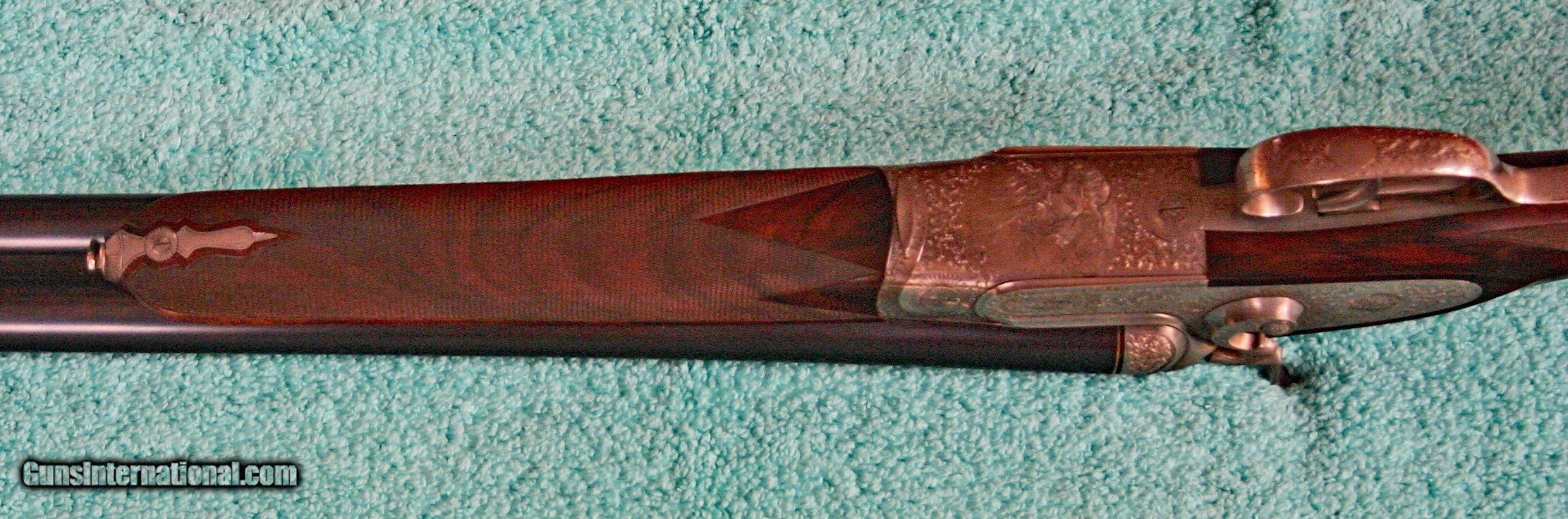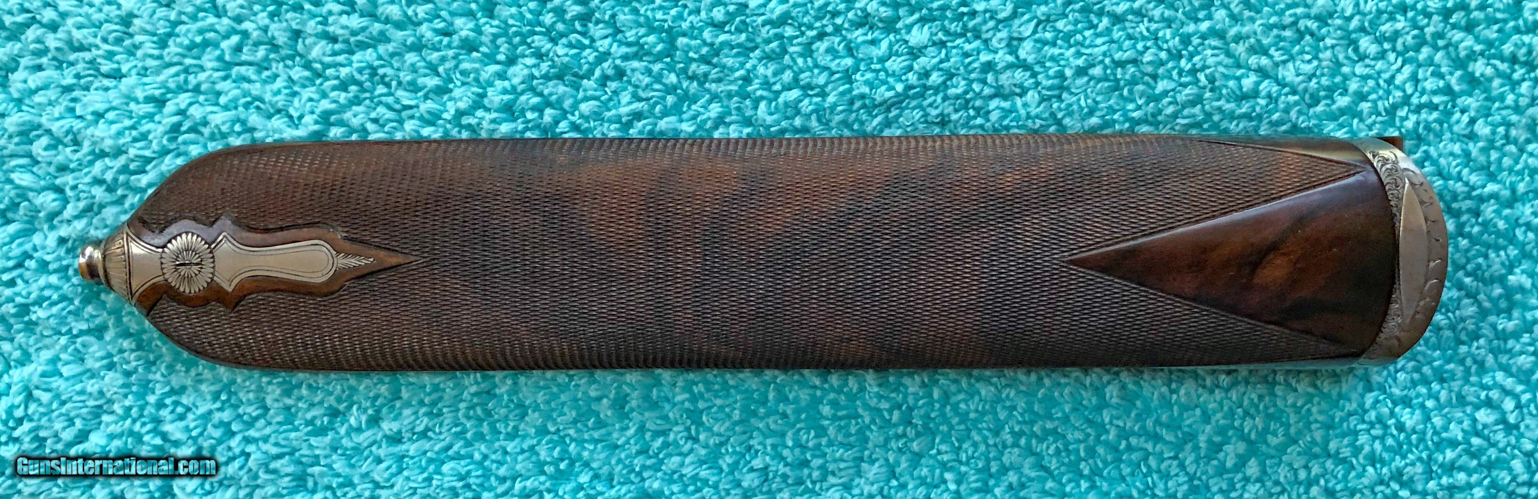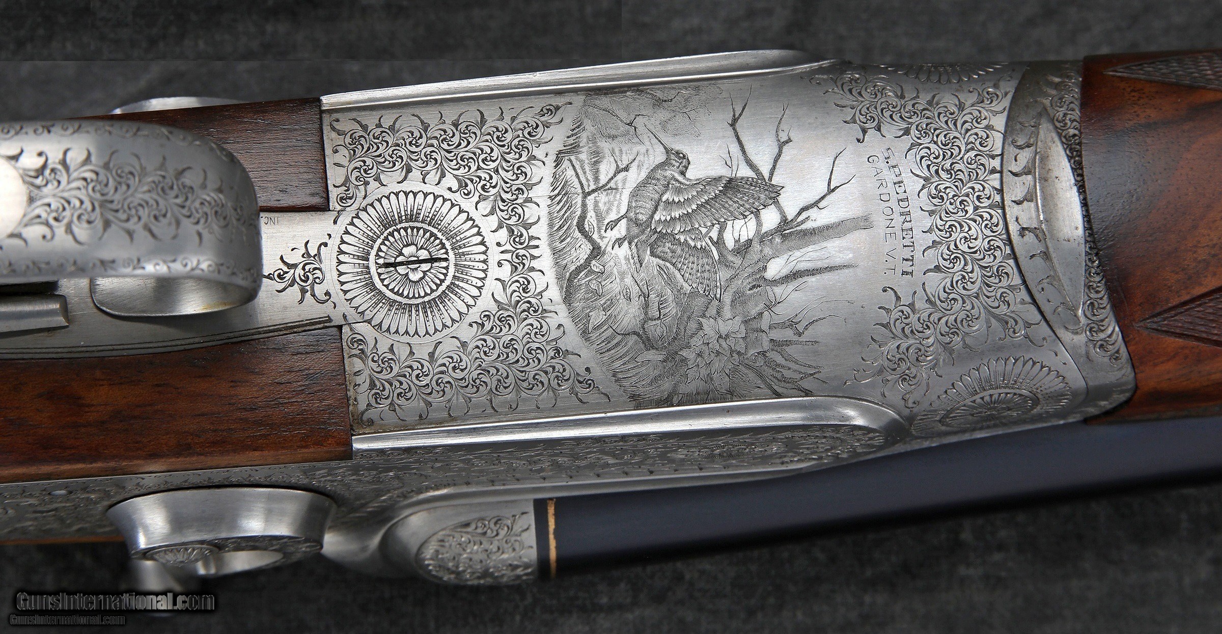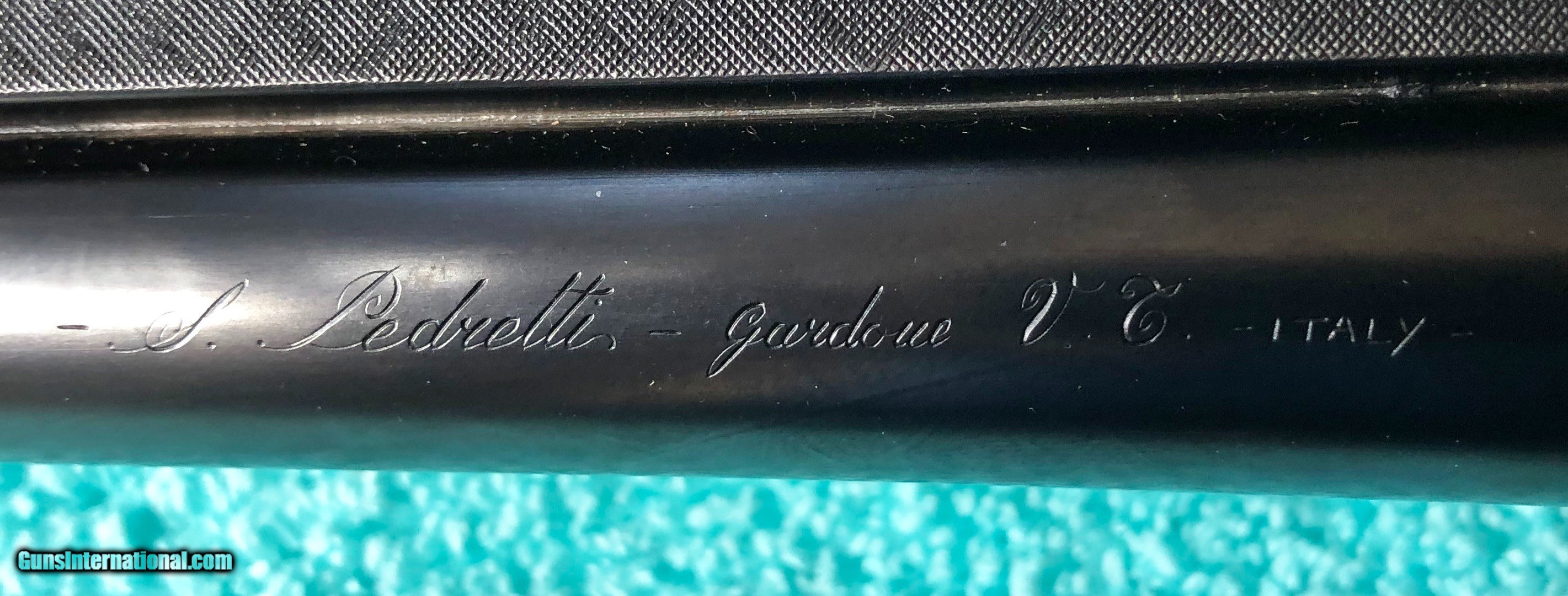 Description: SOLD ** S. Pedretti Best Hammer Sidelock SxS 12 Ga. Mint, with incredible Italian Master Bulino Engraving Description: S. Pedretti, from Gardone, Val Trompe, Italy, a best gun -- hammer sidelock gun in a side by side double, 12 gauge choked Modified (left) and Full (right). Although the gun is in mint condition with no flaws of any kind and looks as it did the day it was made, the most outstanding feature is that it is exceptionally engraved in both the rose and scroll style and the Bulino style. With 2 ¾” chambers, the 27 3/4” steel extractor barrels feature a level hand-filed rib with a single ivory bead front sight. Featuring classic double triggers with an articulated front trigger, the action locks up using the tried and true Purdey double underlugs. The breech face does not show bushed strikers since this is a hammer gun with external access to replaceable firing pins. It is coin-finished which contrasts richly with the deep blue barrels. The barrels flat is stamped with AF, the Italian code for 1980. The right and left sidelocks are engraved in the traditional Purdey rose and scroll with full coverage, beautifully executed, superior to Purdey’s British engravers, as only Italian masters can do. This continues on the top of the receiver, the hammers, the upper and lower tang, the trigger bow, and on the underside of the receiver surrounding a detailed Bulino game scene of a flushing woodcock that is so realistic, it looks like it will fly off the metal. These parts are all coin finished. All screws are engraved and indexed. Two inlaid gold rings circle the breech and the serial number, 7276, is in gold, engraved on the lower tang, just enough touch of gold to see that it is a best gun. On the top left side of the left barrel, it is inscribed, “S. Pedretti, Gardone, V.T. Italy.” For this 12 gauge shotgun, the maker chose the classic sidelock hammer design mating up his action with the finest barrels that ring with a very pronounced chime. The fit and finish are best quality. As to the extra fancy Turkish walnut wood: the forend is the English splinter type with Anson push button forearm release, and buttstock is a straight-hand English grip with checkered butt. It has marblecake figure that is stunningly beautiful in color with the streaks of black and dark reddish brown intertwined. Both pieces of wood look like the came from the same blank. The fine checkering is 32 lpi with single border that looks nearly borderless. It is executed flawlessly. For the stock it is a classic point pattern coming together over the wrist and below the comb with intersecting borders. For the forearm, also a point pattern at the receiver, it is fully checkered to the tip, or nose, and shows a beautiful detail surrounding the forearm release escutcheon. This has every feature of truly a best-made hammer gun. Stock measurements are 14 ½” LOP, 1 ½” DAC, 2 ¼” DAH with 3/8” cast off. Weight of the gun is 7 lb 1 oz. Condition: For being 40 years old, this gun is still 100% wood, 100% metal, 100% checkering, bores bright and new, comes with original leather case and accessories with canvas protector. Priced to sell at $ 17,450.00 Seller is the author of The Rifleman’s Rifle (Winchester pre-64 Model 70s) and will furnish a Letter of Provenance that this gun is from his collection. Please check out author’s feedback on ebay under rcrwin70roger. 3-day non-firing inspection for full refund, shipping is $70 to buyer’s FFL, payment by MO, certified check , wire transfer or personal check with wait for validation. For questions, call Roger (808) 989-1863 Hawaii time or send email. About the maker: Simone Pedretti grew up in Gardone, Val Trompe, Italy, in the mecca of Italy’s best gunmakers, and some might argue, the world’s best gunmakers. Apprenticed and working in all the disciplines, he opened his own shop as a boutique one-man operation, producing only best bespoke guns, (seven or eight a year) building side-by-sides sidelock ejector shotguns on the Holland & Holland pattern, and keeping to the tradition of building hammer sidelocks such as the gun featured here. In the 1980s, a combination of events hit Italy at once: the devaluation of the lire, which affected both domestic and international trade, volatile political turmoil, the Vatican bank scandal and a plunge in hunting participation. Simone began building high-end furniture to make ends meet and soon discovered his success in the furniture trade was more lucrative than gunmaking during that period when everyone was closing their doors: Ferlib, Mario Beschi, Euroarms, Luciano Rota, eventually F.lli Bertuzzi and others. It was the time when Renato Gamba changed his business from production to custom-oriented. The big houses like Benelli, Beretta and Perazzi weathered the storm. Consequently, for Simone Pedretti as the master gunmaker, very few of his guns were made under the name, S. Pedretti, but all were/are best guns and very rare today… especially in the U.S. The gun featured here made in 1980 and is most likely one of his last guns. SOLD Barrel Length: 28 Bore: 12 Chambers: 2 3/4 Triggers: 2 LOP: 14 1/2 Manufacture Date: 1980 Engraving: Master Italian Bulino Minimum Wall Thickness Left: New Minimum Wall Thickness Right: New |