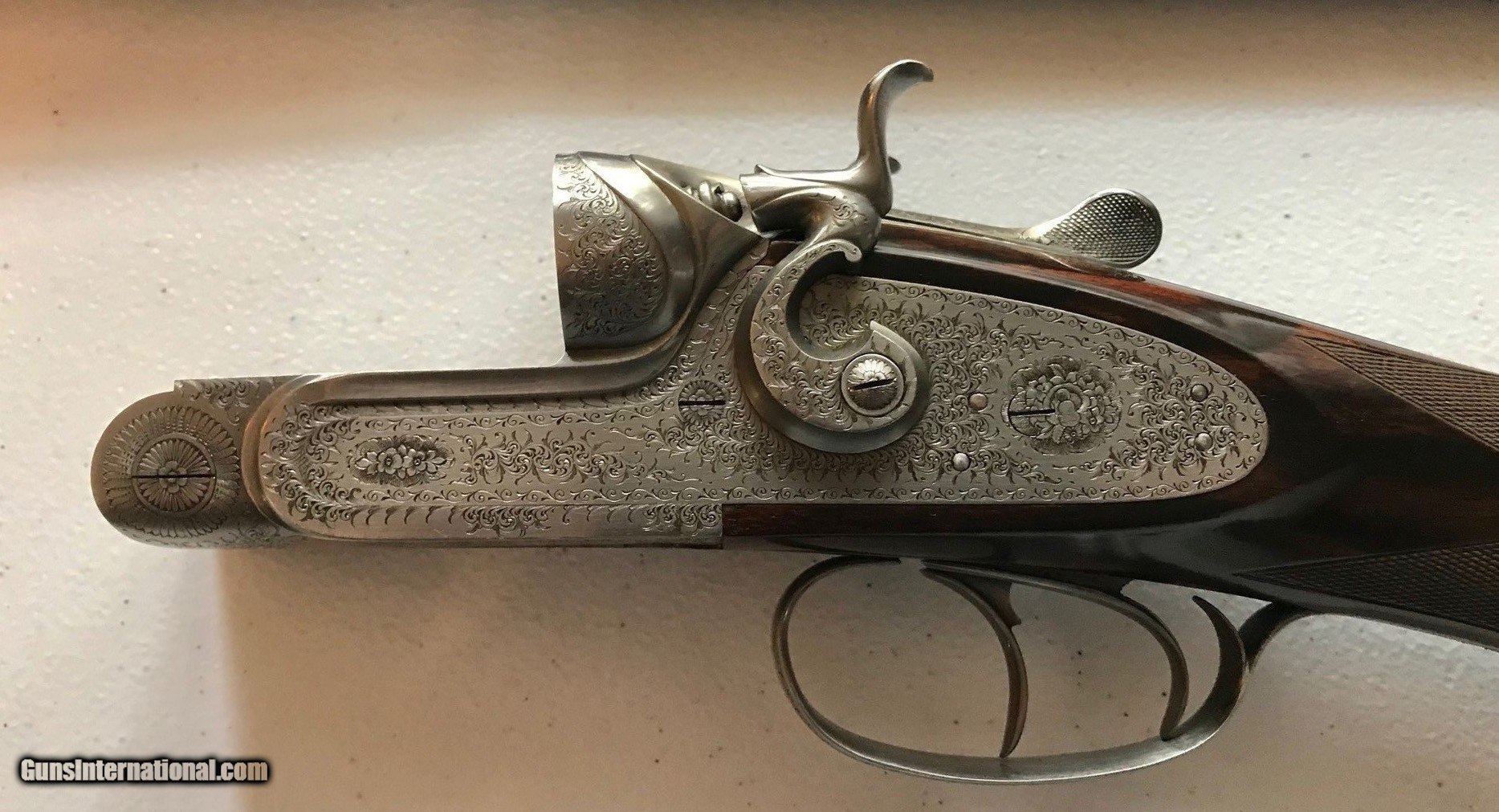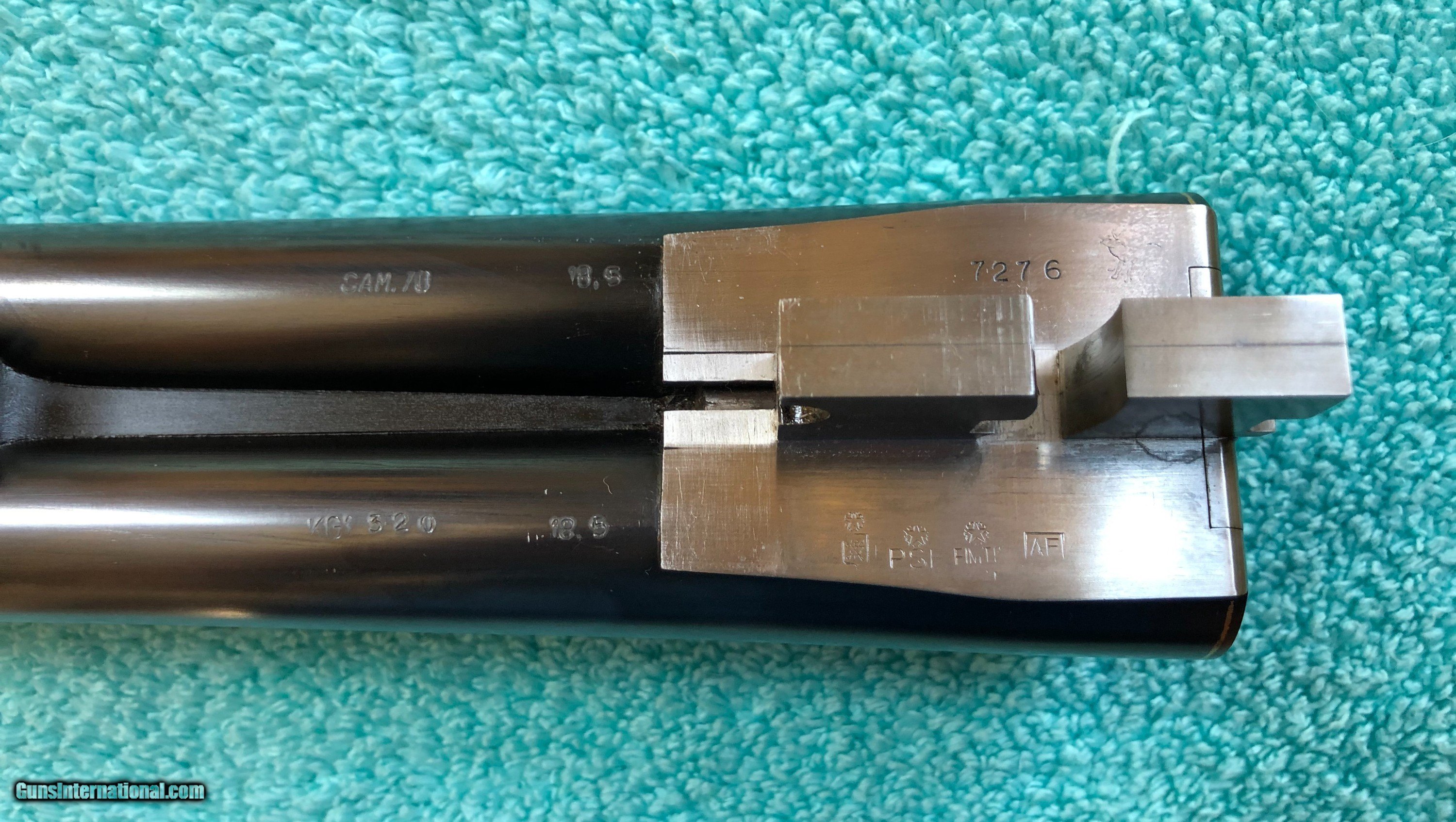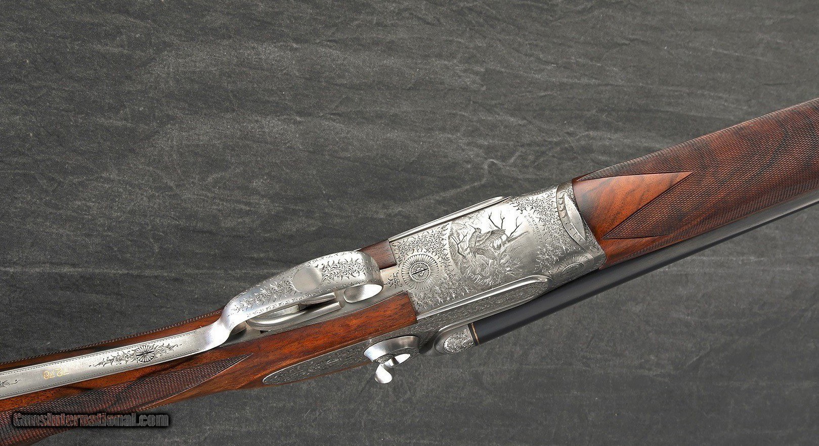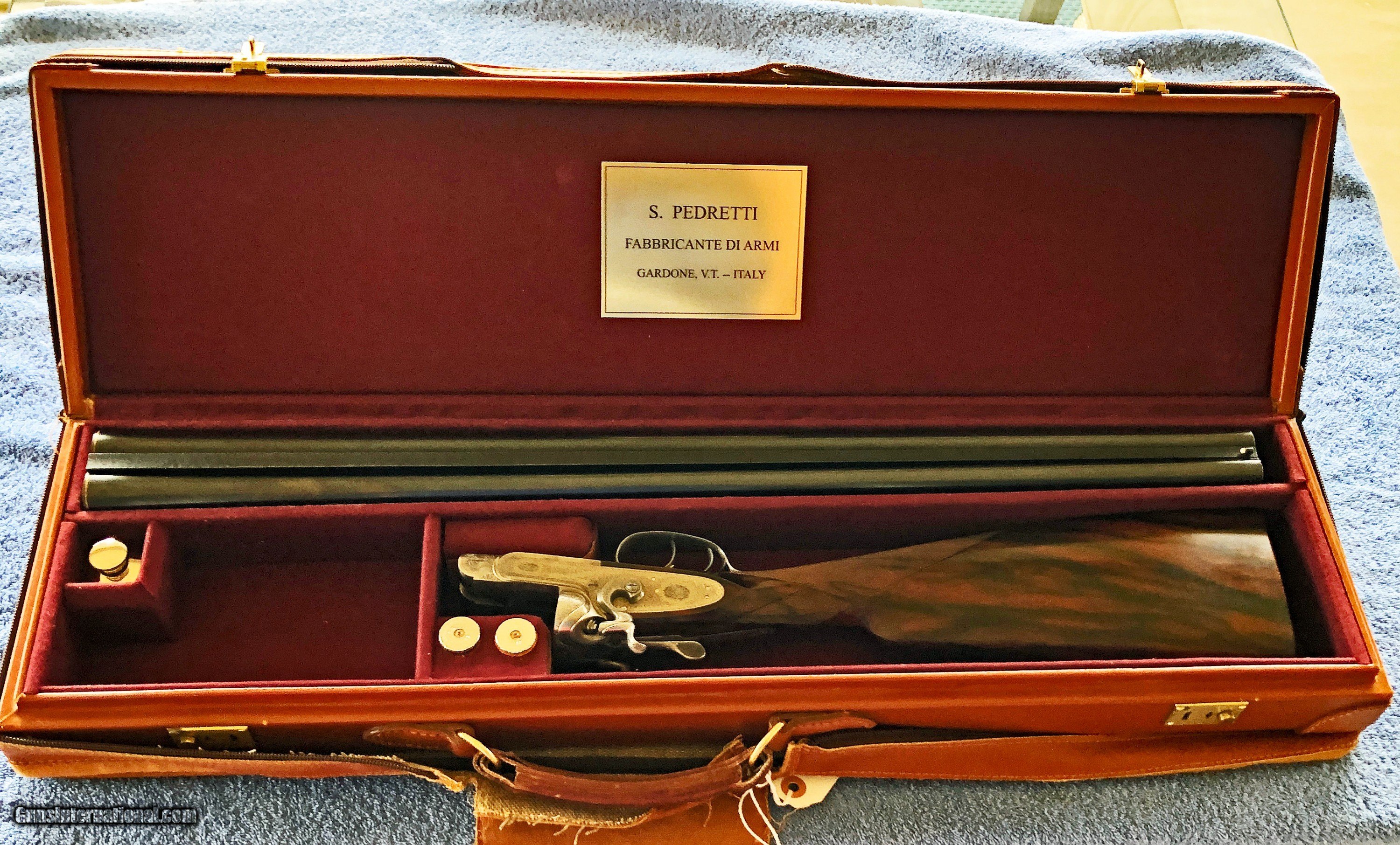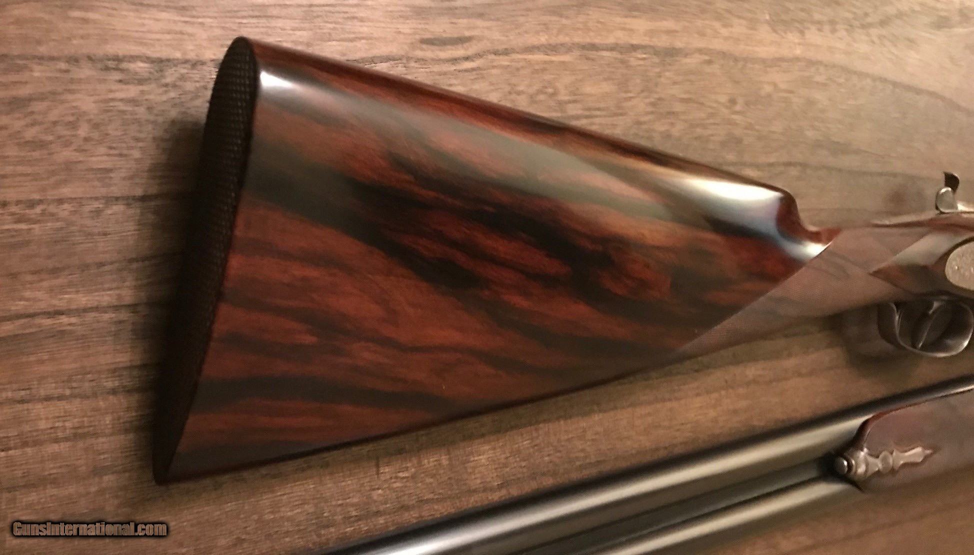 Description: SOLD ** S. Pedretti Best Hammer Sidelock SxS 12 Ga. Mint, with incredible Italian Master Bulino Engraving Description: S. Pedretti, from Gardone, Val Trompe, Italy, a best gun -- hammer sidelock gun in a side by side double, 12 gauge choked Modified (left) and Full (right). Although the gun is in mint condition with no flaws of any kind and looks as it did the day it was made, the most outstanding feature is that it is exceptionally engraved in both the rose and scroll style and the Bulino style. With 2 ¾” chambers, the 27 3/4” steel extractor barrels feature a level hand-filed rib with a single ivory bead front sight. Featuring classic double triggers with an articulated front trigger, the action locks up using the tried and true Purdey double underlugs. The breech face does not show bushed strikers since this is a hammer gun with external access to replaceable firing pins. It is coin-finished which contrasts richly with the deep blue barrels. The barrels flat is stamped with AF, the Italian code for 1980. The right and left sidelocks are engraved in the traditional Purdey rose and scroll with full coverage, beautifully executed, superior to Purdey’s British engravers, as only Italian masters can do. This continues on the top of the receiver, the hammers, the upper and lower tang, the trigger bow, and on the underside of the receiver surrounding a detailed Bulino game scene of a flushing woodcock that is so realistic, it looks like it will fly off the metal. These parts are all coin finished. All screws are engraved and indexed. Two inlaid gold rings circle the breech and the serial number, 7276, is in gold, engraved on the lower tang, just enough touch of gold to see that it is a best gun. On the top left side of the left barrel, it is inscribed, “S. Pedretti, Gardone, V.T. Italy.” For this 12 gauge shotgun, the maker chose the classic sidelock hammer design mating up his action with the finest barrels that ring with a very pronounced chime. The fit and finish are best quality. As to the extra fancy Turkish walnut wood: the forend is the English splinter type with Anson push button forearm release, and buttstock is a straight-hand English grip with checkered butt. It has marblecake figure that is stunningly beautiful in color with the streaks of black and dark reddish brown intertwined. Both pieces of wood look like the came from the same blank. The fine checkering is 32 lpi with single border that looks nearly borderless. It is executed flawlessly. For the stock it is a classic point pattern coming together over the wrist and below the comb with intersecting borders. For the forearm, also a point pattern at the receiver, it is fully checkered to the tip, or nose, and shows a beautiful detail surrounding the forearm release escutcheon. This has every feature of truly a best-made hammer gun. Stock measurements are 14 ½” LOP, 1 ½” DAC, 2 ¼” DAH with 3/8” cast off. Weight of the gun is 7 lb 1 oz. Condition: For being 40 years old, this gun is still 100% wood, 100% metal, 100% checkering, bores bright and new, comes with original leather case and accessories with canvas protector. Priced to sell at $ 17,450.00 Seller is the author of The Rifleman’s Rifle (Winchester pre-64 Model 70s) and will furnish a Letter of Provenance that this gun is from his collection. Please check out author’s feedback on ebay under rcrwin70roger. 3-day non-firing inspection for full refund, shipping is $70 to buyer’s FFL, payment by MO, certified check , wire transfer or personal check with wait for validation. For questions, call Roger (808) 989-1863 Hawaii time or send email. About the maker: Simone Pedretti grew up in Gardone, Val Trompe, Italy, in the mecca of Italy’s best gunmakers, and some might argue, the world’s best gunmakers. Apprenticed and working in all the disciplines, he opened his own shop as a boutique one-man operation, producing only best bespoke guns, (seven or eight a year) building side-by-sides sidelock ejector shotguns on the Holland & Holland pattern, and keeping to the tradition of building hammer sidelocks such as the gun featured here. In the 1980s, a combination of events hit Italy at once: the devaluation of the lire, which affected both domestic and international trade, volatile political turmoil, the Vatican bank scandal and a plunge in hunting participation. Simone began building high-end furniture to make ends meet and soon discovered his success in the furniture trade was more lucrative than gunmaking during that period when everyone was closing their doors: Ferlib, Mario Beschi, Euroarms, Luciano Rota, eventually F.lli Bertuzzi and others. It was the time when Renato Gamba changed his business from production to custom-oriented. The big houses like Benelli, Beretta and Perazzi weathered the storm. Consequently, for Simone Pedretti as the master gunmaker, very few of his guns were made under the name, S. Pedretti, but all were/are best guns and very rare today… especially in the U.S. The gun featured here made in 1980 and is most likely one of his last guns. SOLD Barrel Length: 28 Bore: 12 Chambers: 2 3/4 Triggers: 2 LOP: 14 1/2 Manufacture Date: 1980 Engraving: Master Italian Bulino Minimum Wall Thickness Left: New Minimum Wall Thickness Right: New |