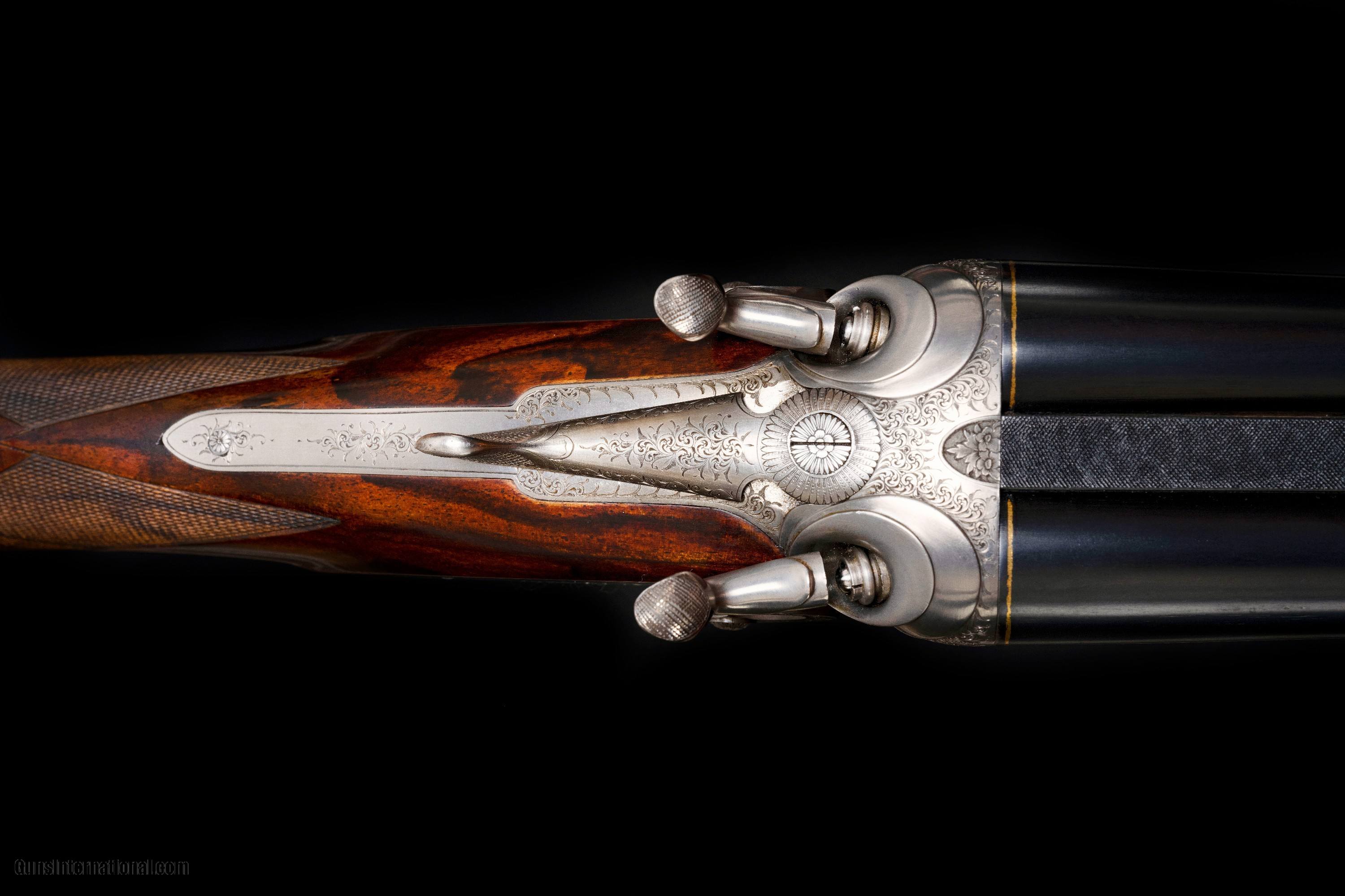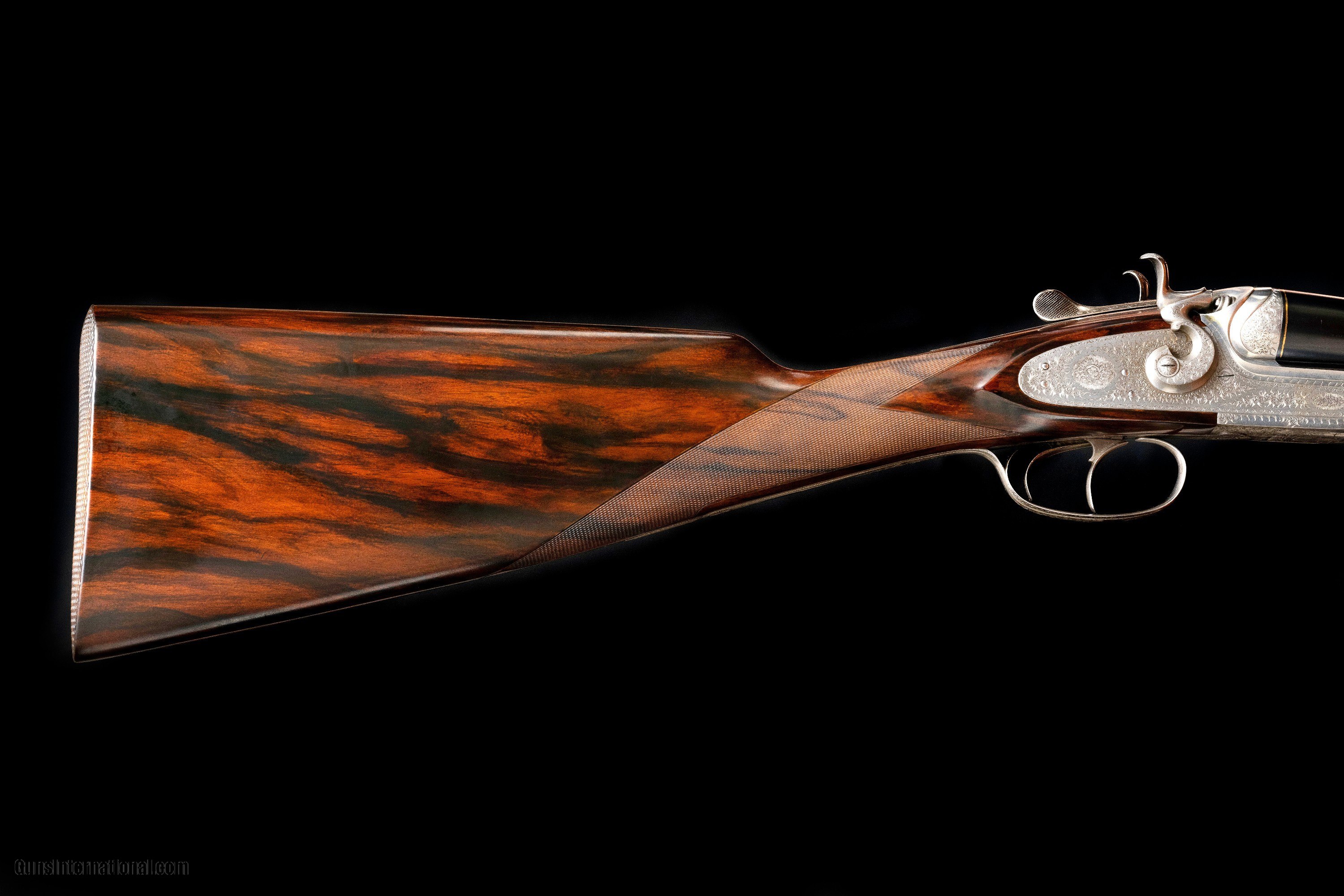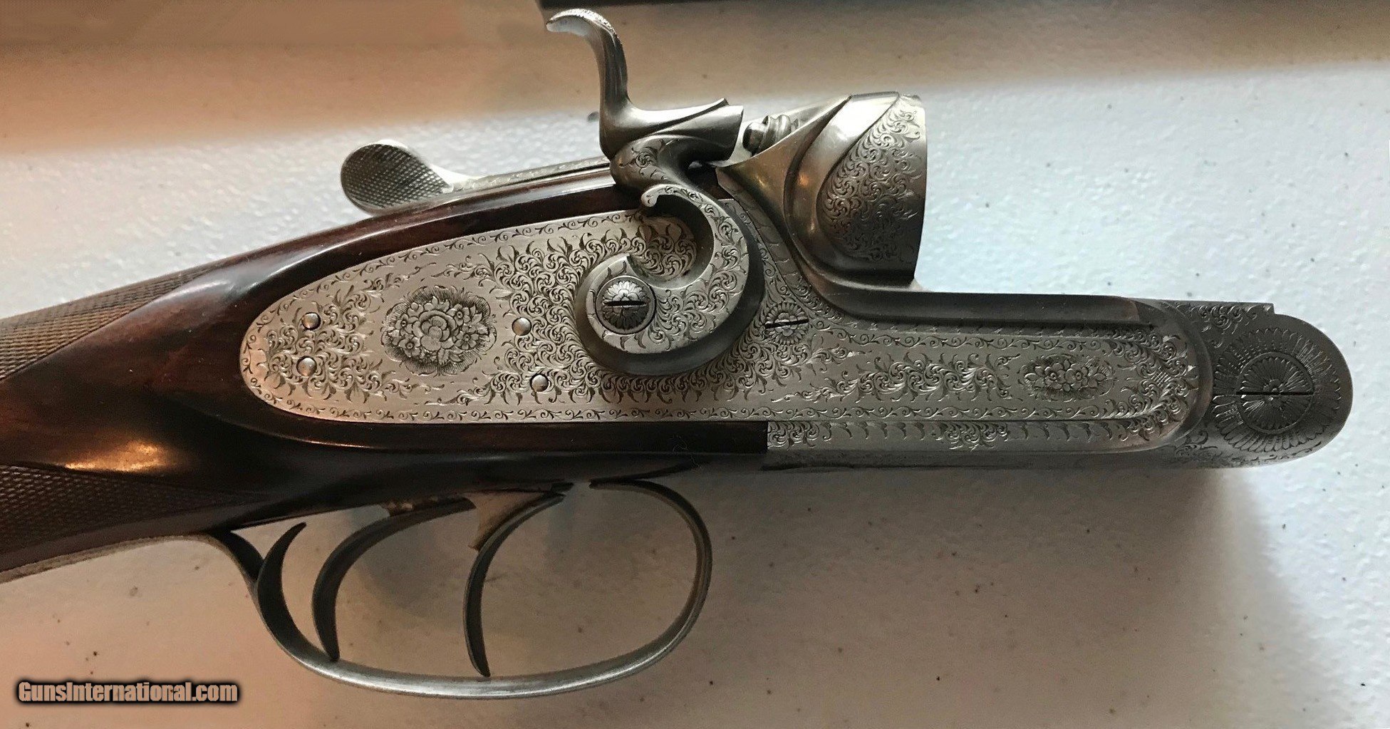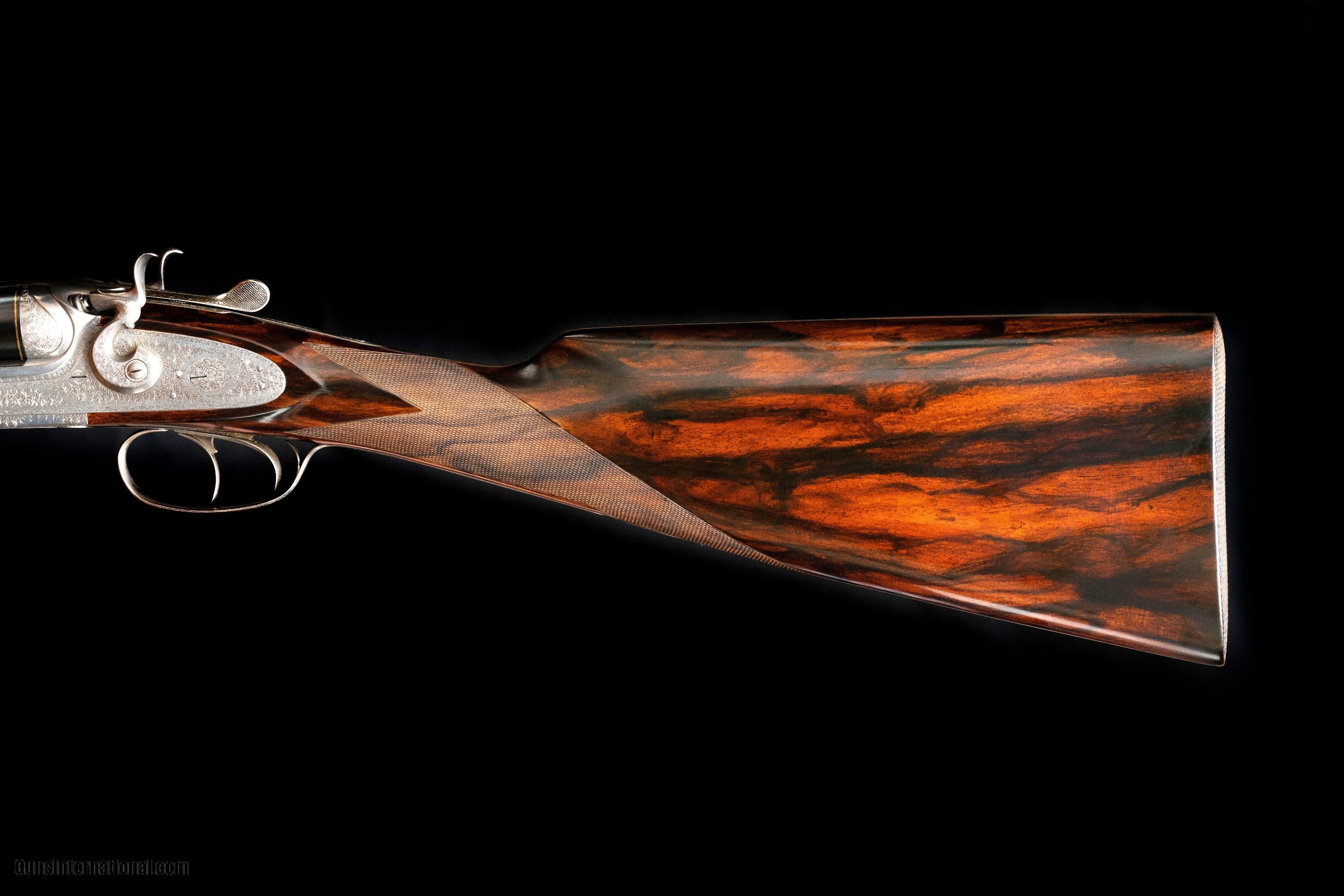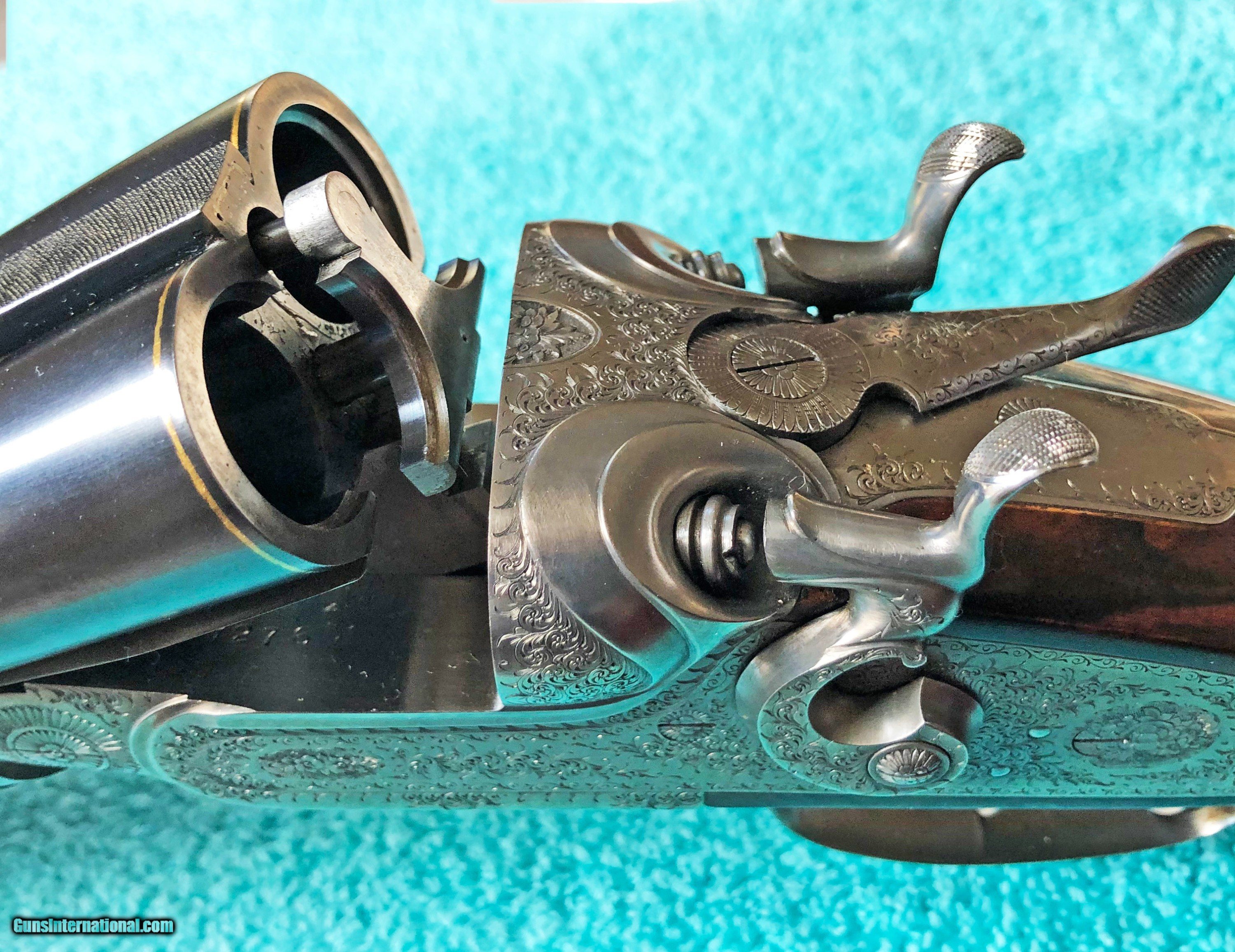 Description: SOLD ** S. Pedretti Best Hammer Sidelock SxS 12 Ga. Mint, with incredible Italian Master Bulino Engraving Description: S. Pedretti, from Gardone, Val Trompe, Italy, a best gun -- hammer sidelock gun in a side by side double, 12 gauge choked Modified (left) and Full (right). Although the gun is in mint condition with no flaws of any kind and looks as it did the day it was made, the most outstanding feature is that it is exceptionally engraved in both the rose and scroll style and the Bulino style. With 2 ¾” chambers, the 27 3/4” steel extractor barrels feature a level hand-filed rib with a single ivory bead front sight. Featuring classic double triggers with an articulated front trigger, the action locks up using the tried and true Purdey double underlugs. The breech face does not show bushed strikers since this is a hammer gun with external access to replaceable firing pins. It is coin-finished which contrasts richly with the deep blue barrels. The barrels flat is stamped with AF, the Italian code for 1980. The right and left sidelocks are engraved in the traditional Purdey rose and scroll with full coverage, beautifully executed, superior to Purdey’s British engravers, as only Italian masters can do. This continues on the top of the receiver, the hammers, the upper and lower tang, the trigger bow, and on the underside of the receiver surrounding a detailed Bulino game scene of a flushing woodcock that is so realistic, it looks like it will fly off the metal. These parts are all coin finished. All screws are engraved and indexed. Two inlaid gold rings circle the breech and the serial number, 7276, is in gold, engraved on the lower tang, just enough touch of gold to see that it is a best gun. On the top left side of the left barrel, it is inscribed, “S. Pedretti, Gardone, V.T. Italy.” For this 12 gauge shotgun, the maker chose the classic sidelock hammer design mating up his action with the finest barrels that ring with a very pronounced chime. The fit and finish are best quality. As to the extra fancy Turkish walnut wood: the forend is the English splinter type with Anson push button forearm release, and buttstock is a straight-hand English grip with checkered butt. It has marblecake figure that is stunningly beautiful in color with the streaks of black and dark reddish brown intertwined. Both pieces of wood look like the came from the same blank. The fine checkering is 32 lpi with single border that looks nearly borderless. It is executed flawlessly. For the stock it is a classic point pattern coming together over the wrist and below the comb with intersecting borders. For the forearm, also a point pattern at the receiver, it is fully checkered to the tip, or nose, and shows a beautiful detail surrounding the forearm release escutcheon. This has every feature of truly a best-made hammer gun. Stock measurements are 14 ½” LOP, 1 ½” DAC, 2 ¼” DAH with 3/8” cast off. Weight of the gun is 7 lb 1 oz. Condition: For being 40 years old, this gun is still 100% wood, 100% metal, 100% checkering, bores bright and new, comes with original leather case and accessories with canvas protector. Priced to sell at $ 17,450.00 Seller is the author of The Rifleman’s Rifle (Winchester pre-64 Model 70s) and will furnish a Letter of Provenance that this gun is from his collection. Please check out author’s feedback on ebay under rcrwin70roger. 3-day non-firing inspection for full refund, shipping is $70 to buyer’s FFL, payment by MO, certified check , wire transfer or personal check with wait for validation. For questions, call Roger (808) 989-1863 Hawaii time or send email. About the maker: Simone Pedretti grew up in Gardone, Val Trompe, Italy, in the mecca of Italy’s best gunmakers, and some might argue, the world’s best gunmakers. Apprenticed and working in all the disciplines, he opened his own shop as a boutique one-man operation, producing only best bespoke guns, (seven or eight a year) building side-by-sides sidelock ejector shotguns on the Holland & Holland pattern, and keeping to the tradition of building hammer sidelocks such as the gun featured here. In the 1980s, a combination of events hit Italy at once: the devaluation of the lire, which affected both domestic and international trade, volatile political turmoil, the Vatican bank scandal and a plunge in hunting participation. Simone began building high-end furniture to make ends meet and soon discovered his success in the furniture trade was more lucrative than gunmaking during that period when everyone was closing their doors: Ferlib, Mario Beschi, Euroarms, Luciano Rota, eventually F.lli Bertuzzi and others. It was the time when Renato Gamba changed his business from production to custom-oriented. The big houses like Benelli, Beretta and Perazzi weathered the storm. Consequently, for Simone Pedretti as the master gunmaker, very few of his guns were made under the name, S. Pedretti, but all were/are best guns and very rare today… especially in the U.S. The gun featured here made in 1980 and is most likely one of his last guns. SOLD Barrel Length: 28 Bore: 12 Chambers: 2 3/4 Triggers: 2 LOP: 14 1/2 Manufacture Date: 1980 Engraving: Master Italian Bulino Minimum Wall Thickness Left: New Minimum Wall Thickness Right: New |