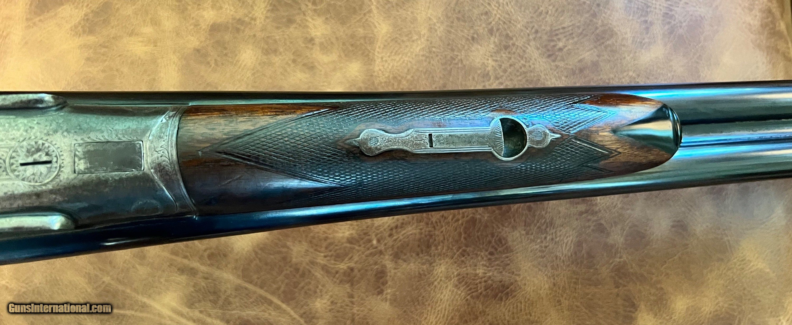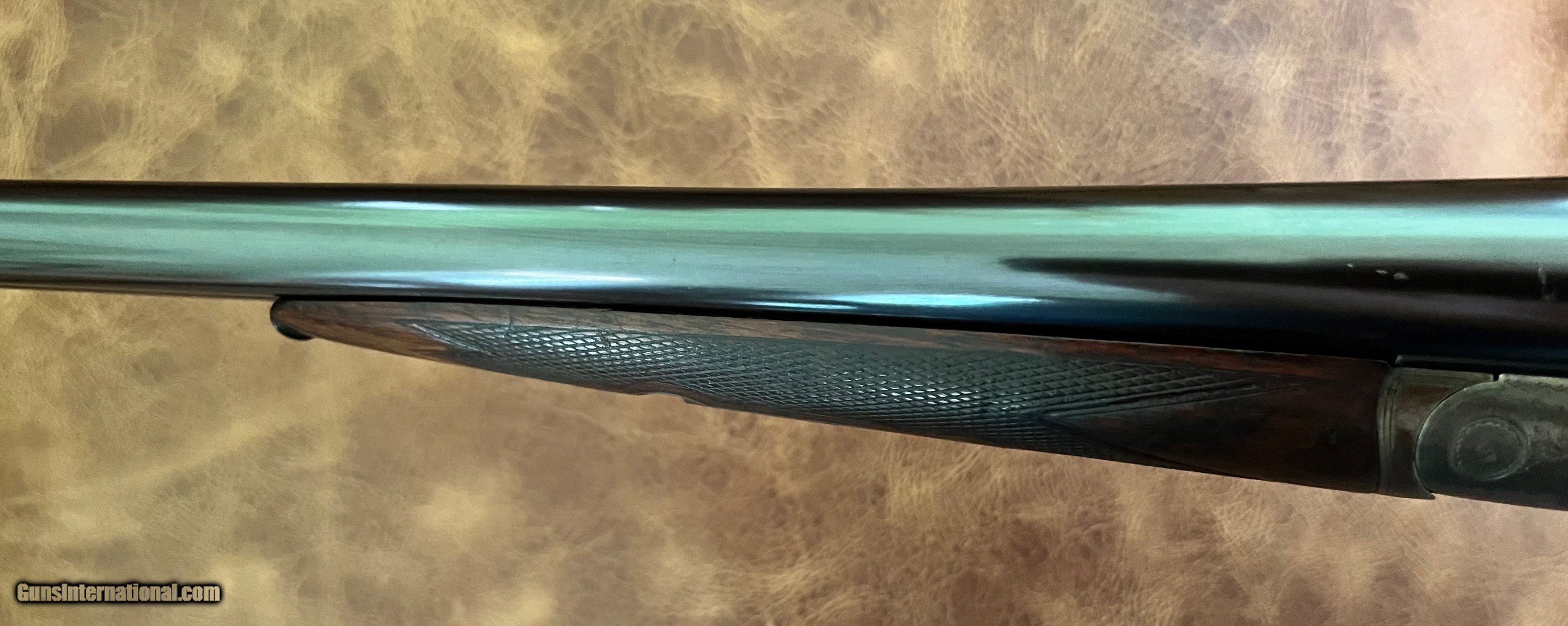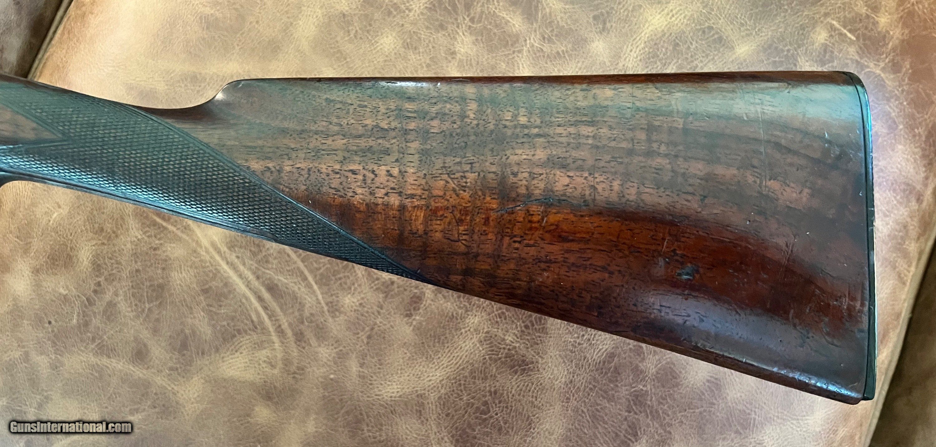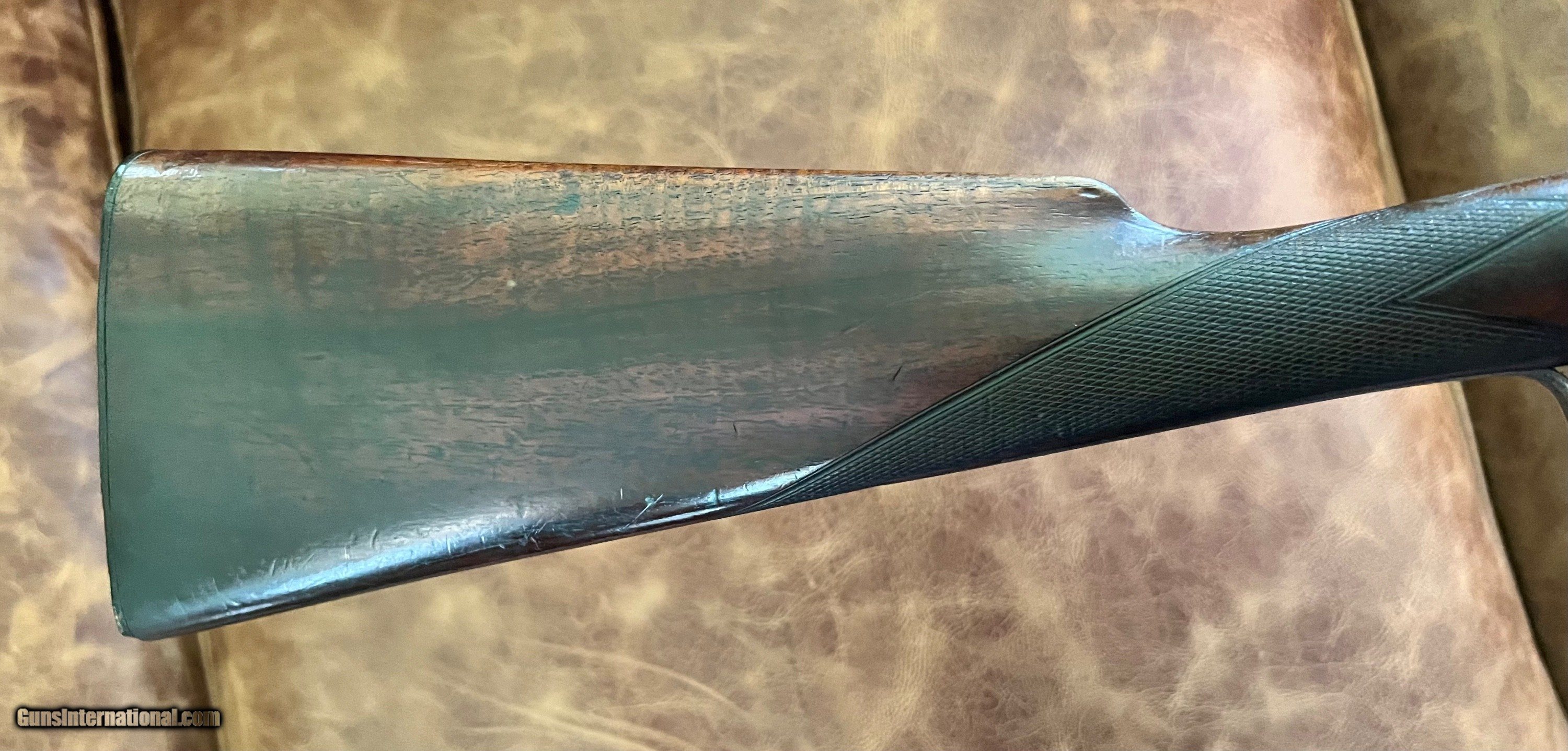 Description: T Wild Whittall street Birmingham England 12ga 30" non ejector barrels with wide flat matted rib 3" chambers Excellent bores Lockup is tight Treble grip action Original 3" 1 1/2oz proof with 12-76 1200 bar reproof Minimum wall thickness: R: 24/1000 L: 25/1000 Bores: .732/.732 proofed at .732/.732 Chokes: IM/F .029/.032 LOP 14 1/4 over original buttplate (15" with 1" pad) DAC 1 1/2 DAH 2 1/8 Cast off 3/8" 7lbs 7oz Carved fences and nicely shaped hammers. Border engraved action and screws with some remaining case color. Built in 1915 Nice original condition heavy proof bar action hammergun, Great weight and stock dimensions for clays or game and with the reproof you can safely shoot modern ammo up to 3" 1 1/2oz. SOLD Curio/Relic: Yes Shotgun Gauge: 12 Gauge |