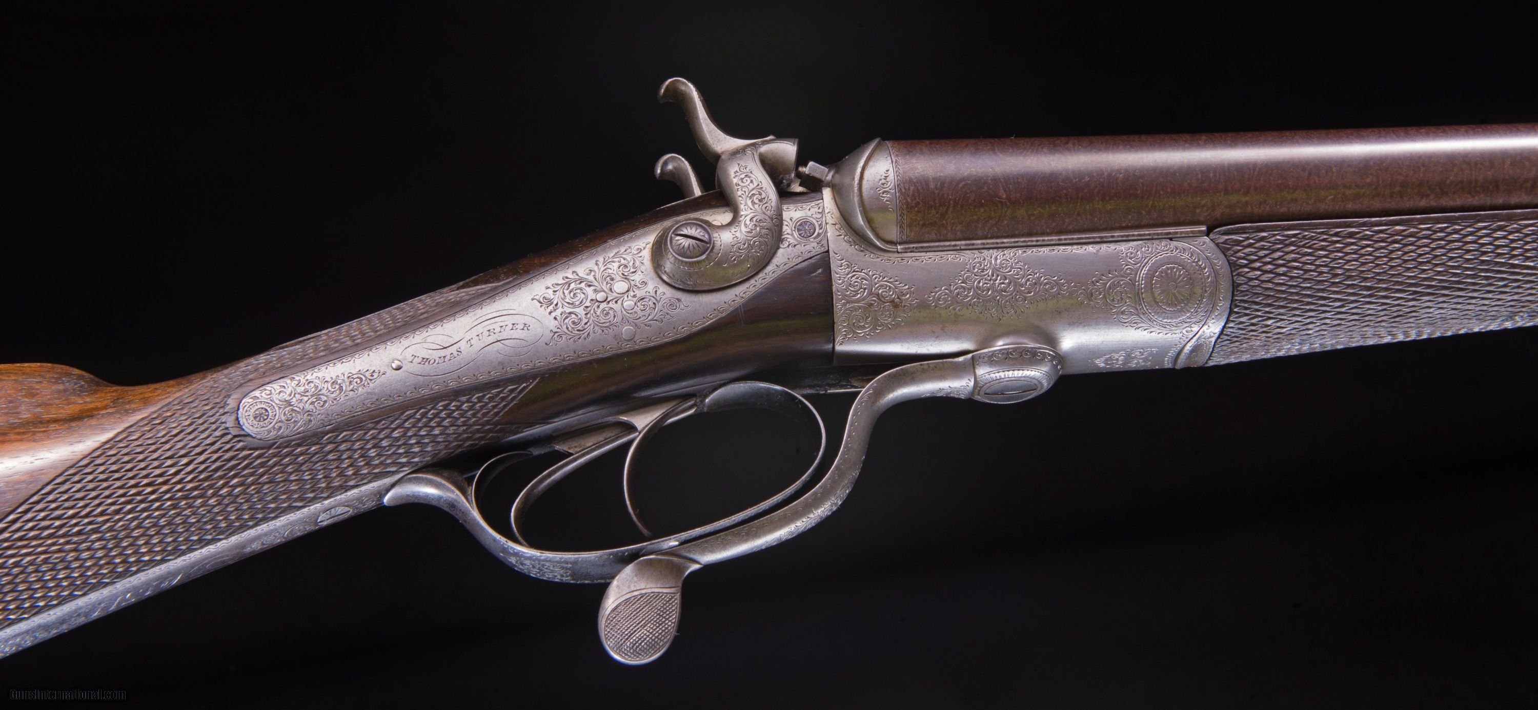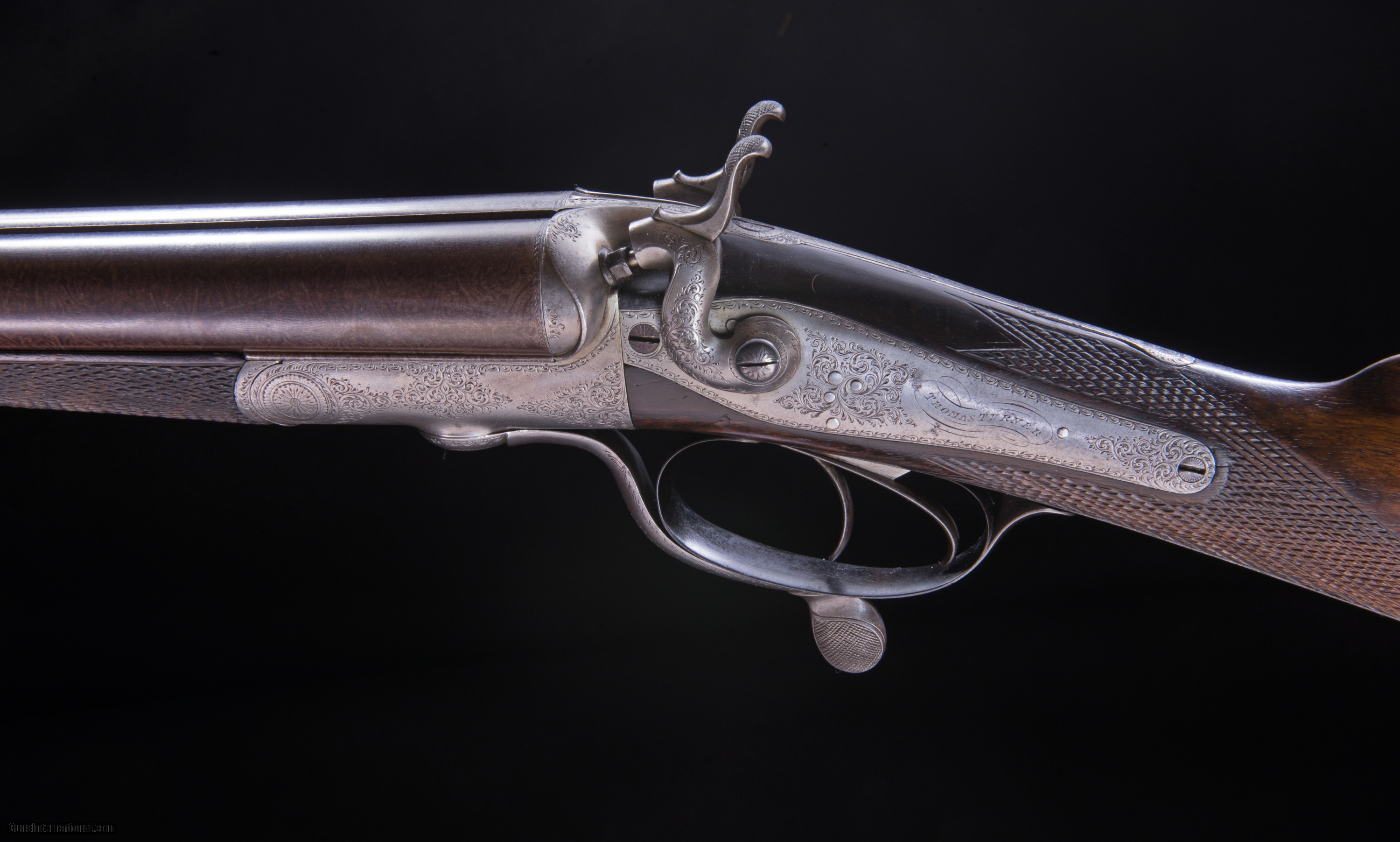 Description: Hammerguns - This fine double has an extremely rare feature of chopperlump Damascus barrels. As far as we know only one man in the English gun trade ever managed to produce these. His name was Henry Parsons and he would leave his mark on all his barrels besides the other proof marks. The mark is a forging hammer. When I saw this mark I immediately took a closer look at the barrels and sure enough there was the very thin line separating the lumps. In my world it is the little things that can make my day and this made mine. It is just the coolest thing ever! In thirty years with vintage English guns I have only seen this once before. This Turner has good wall thickness and very modern stock dimensions.