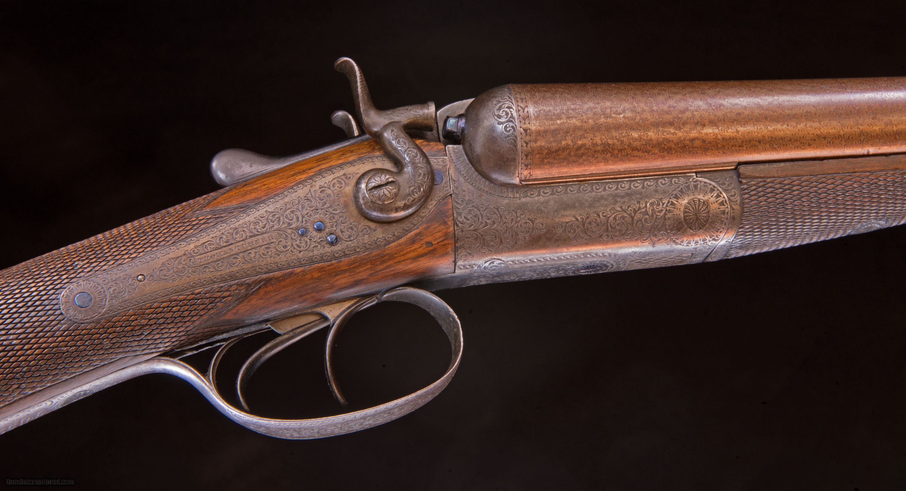 Description: Hammerguns - *** Note: To see this gun with high resolution photos and a zoom-in feature, go to the vintagedoubles main site and search for the gun ID: 4121 or browse the main site to see our full gun collection. SOLD Antique: Yes Manufacturer: Thomas Turner Model: None Serial Number: 4859 Ejectors: No Barrels: 28 Barrel Type: Damascus Action: top lever back action with rebounding hammers Gauge Info: 12 gauge Stock Comb: 1 1/2 Stock Heel: 2 9/16 Stock Cast: 1/4 LOP: 14" to horn butt pla Weight: 6 lbs. 3oz. Choke Left: .030 full Choke Right: Cyl. Proof:Nitro: 2 1/2 Minimum Wall Thickness Left: .029 Minimum Wall Thickness Right: .028 |