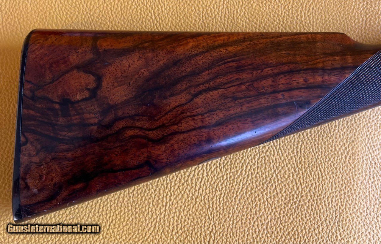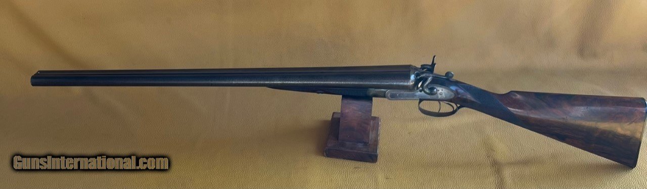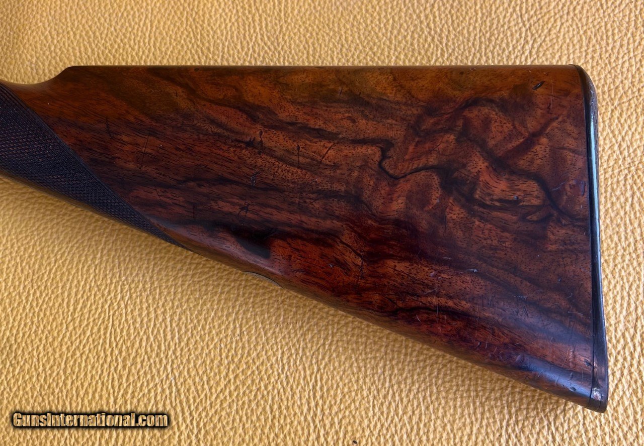 Description: #385 WC Scott top lever rebounding hammer 10 ga 2 7/8" 29 7/8" Damascus barrels, bores with light pitting, measuring .802" and .809", walls at .038" and .035". Chokes are cylinder and cylinder. Original browning in 85% condition with a few dings and scratches. Action with bar action locks, tight and retaining 30% of the original colors. Border engraved with small game scene. The stock and forend are in 85% of original condition with hunting marks. LOP is 14 1/4" over the original checkered horn butt plate. Drop is 1 3/4" and 2 1/2" cast off 1/8". Comes with 60 rounds of RST Bismuth #2 and #4. SOLD Antique: Yes Shotgun Gauge: 10 Gauge Manufacturer: WC Scott Model: Top lever rebounding hammer 10Ga 2 7/8 Serial Number: 385 Barrel Length: 29 7/8 Bore: .802" & .809 Bore Condition: Light pitting Barrels: Damascus barrels LOP: 14 1/4 Extras: 60 rounds of RST Bismuth #2 and #4 |