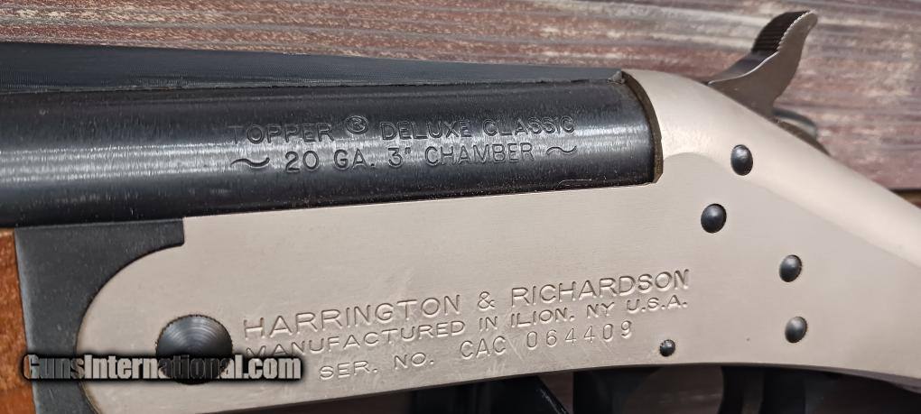 Description: Guns Listing ID: 1370215 H&R TOPPER DELUX CLASSIC 20G, EXCELLENT CONDITION, STRAP INCLUDED SOLD Manufacturer: H&R Model: TOPPER DELUXE CLASSIC Condition: Used - Non-Certified Barrels: 27.5 BARREL Gauge Info: 20 GA Finish: WOOD GRIPS/BLUED STEEL |