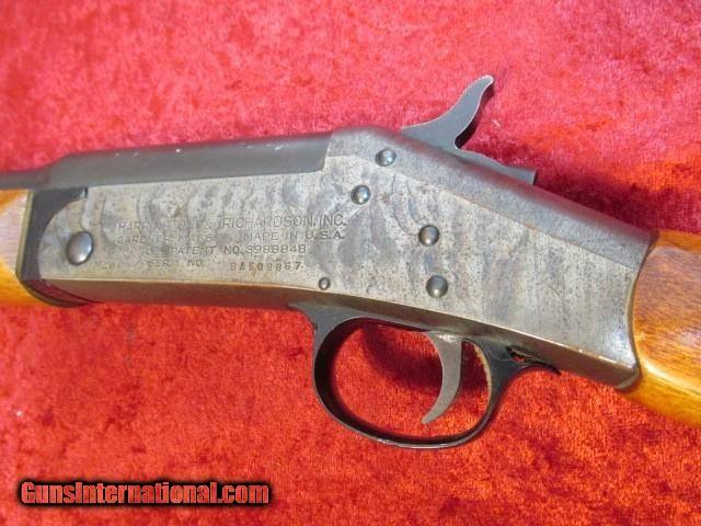 Description: H&R Topper Small Frame 20 ga Single Shot Shotgun 24 1/2" barrel Fixed Mod Choke Made in the USA This used H&R Topper Model, Small Frame, shows bluing wear with very light surface rust on the outside with a bright shiny bore. Receiver shows 70% of the case coloring on the left side & 50% case coloring on the right side. Wood has light dings, scratches, & nicks from use. Red rubber pad is not original and rought fit. Please see pictures of actual gun for best description.