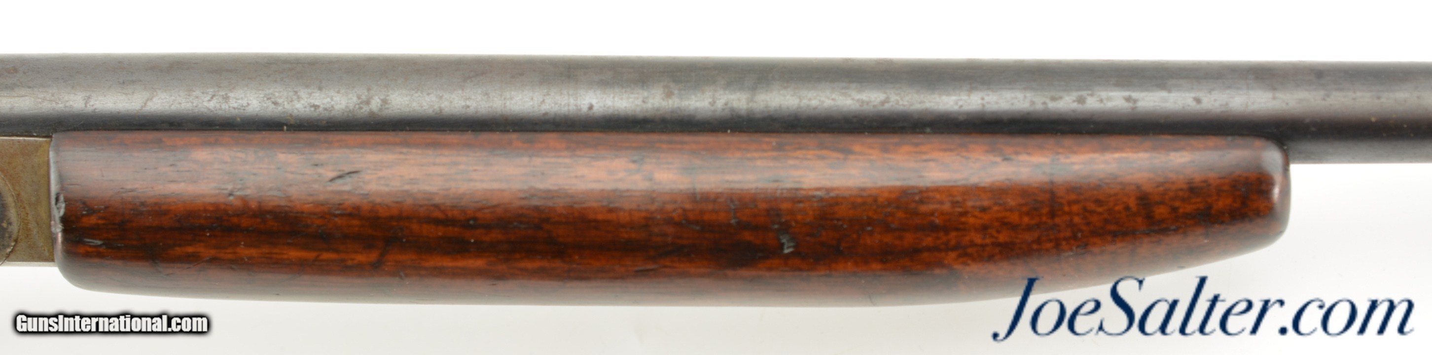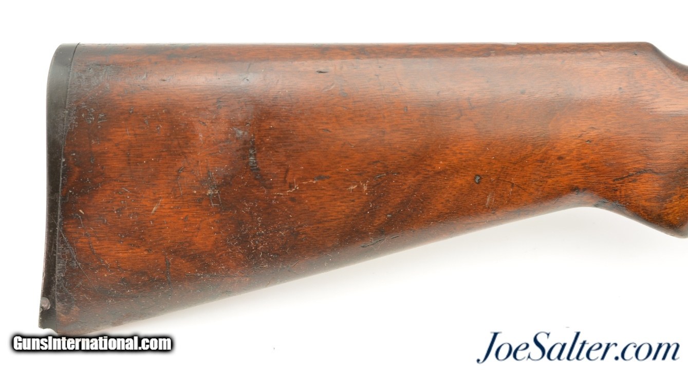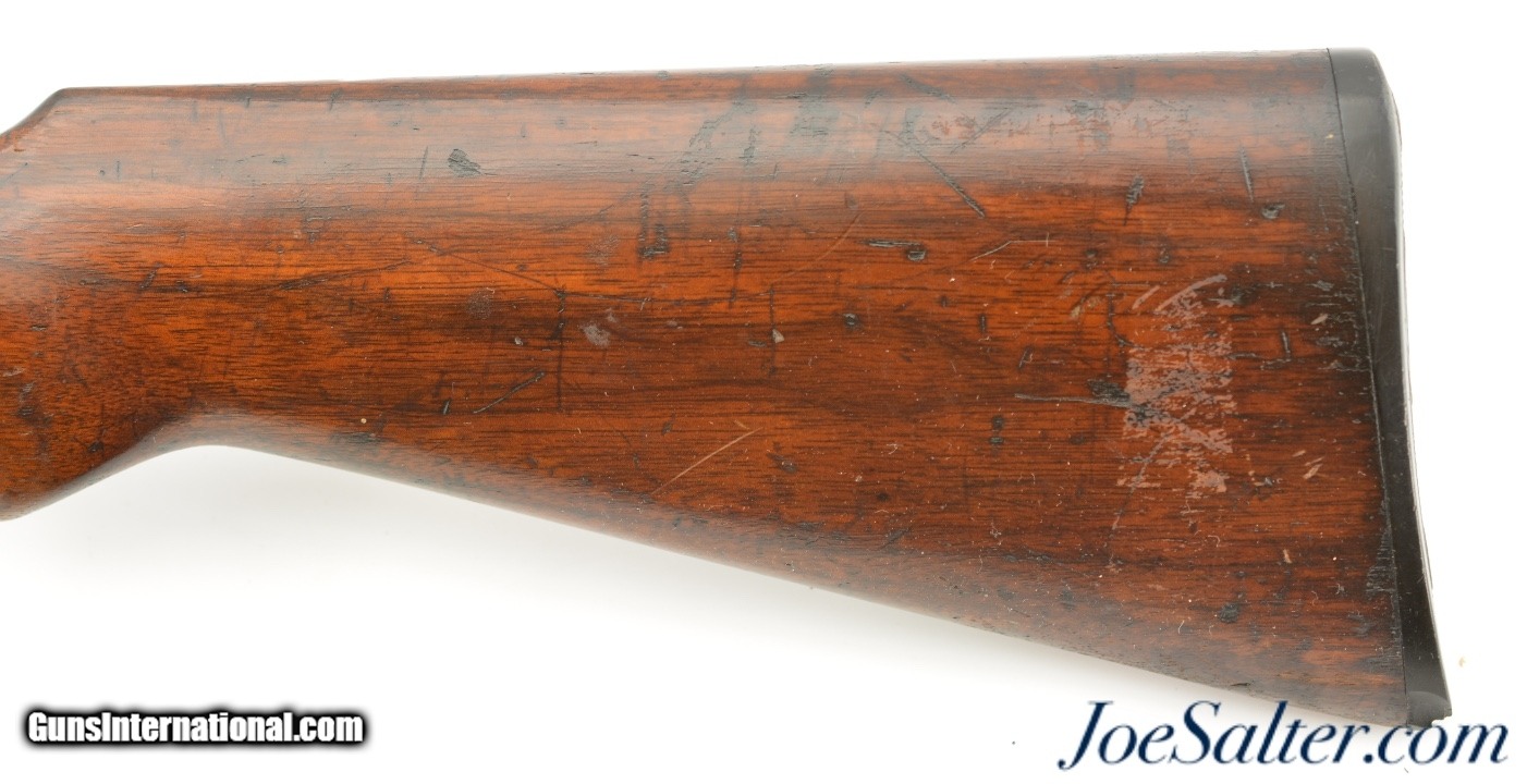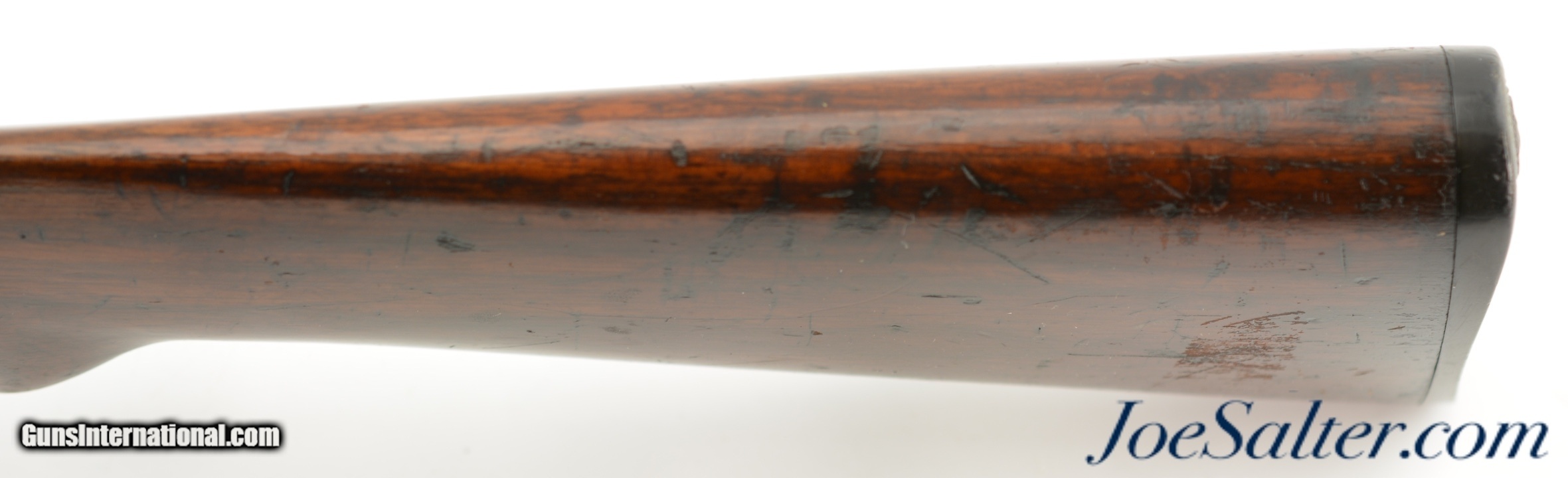 Description: Serial #A126153, .410-12mm, 2 1/2" chamber, 26 inch barrel with a bright, excellent bore choked cylinder. This is the H&R Model 1915 shotgun marked "410-12mm" placing this in production from 1922-1936. The lightweight little break-open retains about 55-60% of the original blue finish on the barrel with the frame showing 80-85% of the original case-hardened color. The stock and forearm are solid with a slight stable crack just behind the tang showing numerous old marks and contusions with a chip in the toe of the original H&R hard rubber butt plate. The action locks up tight with barrel on face having just a slight movement in the stock to action fit. A great little truck or camp shotgun that still looks very nice. SOLD Curio/Relic: Yes |