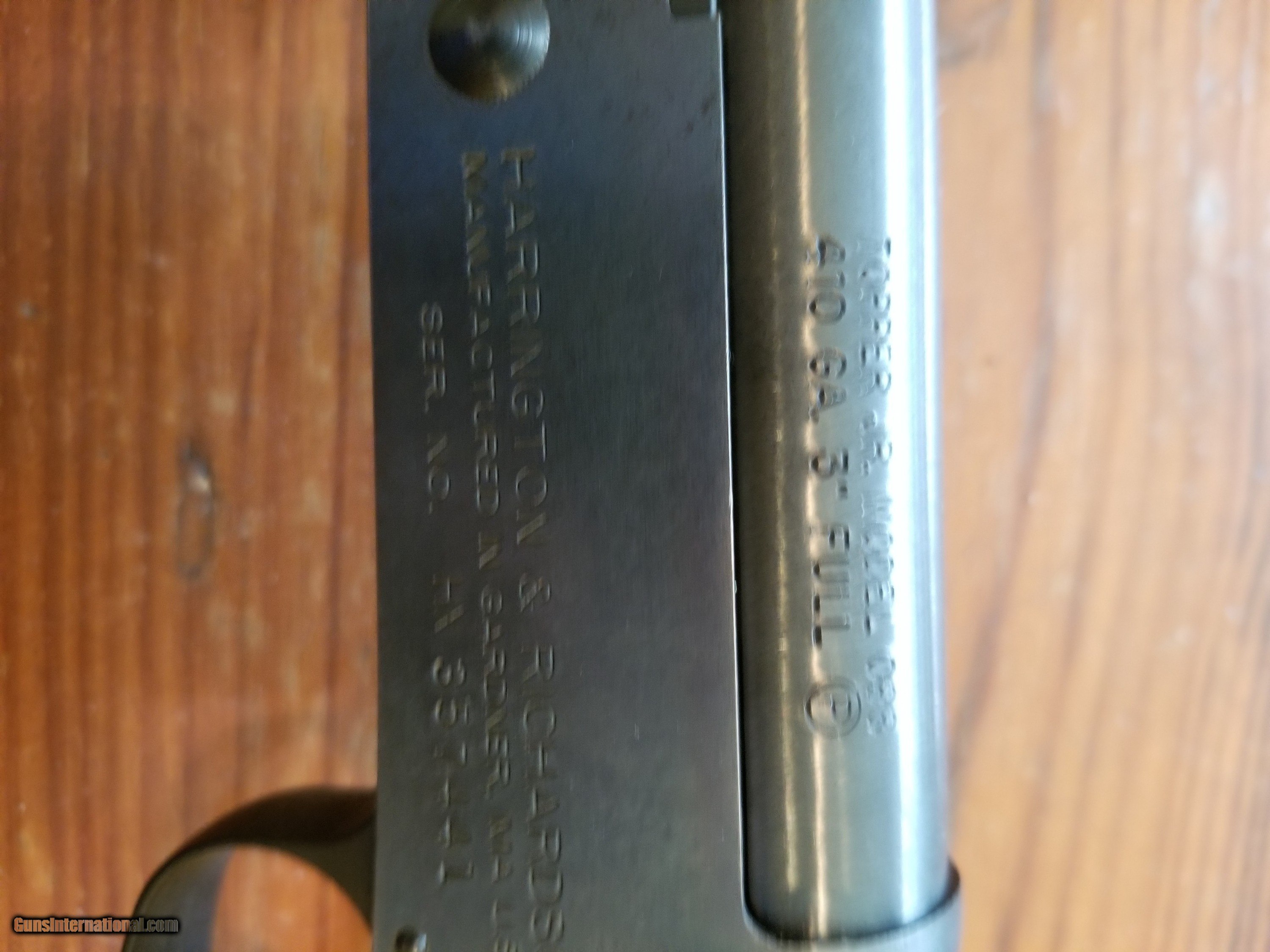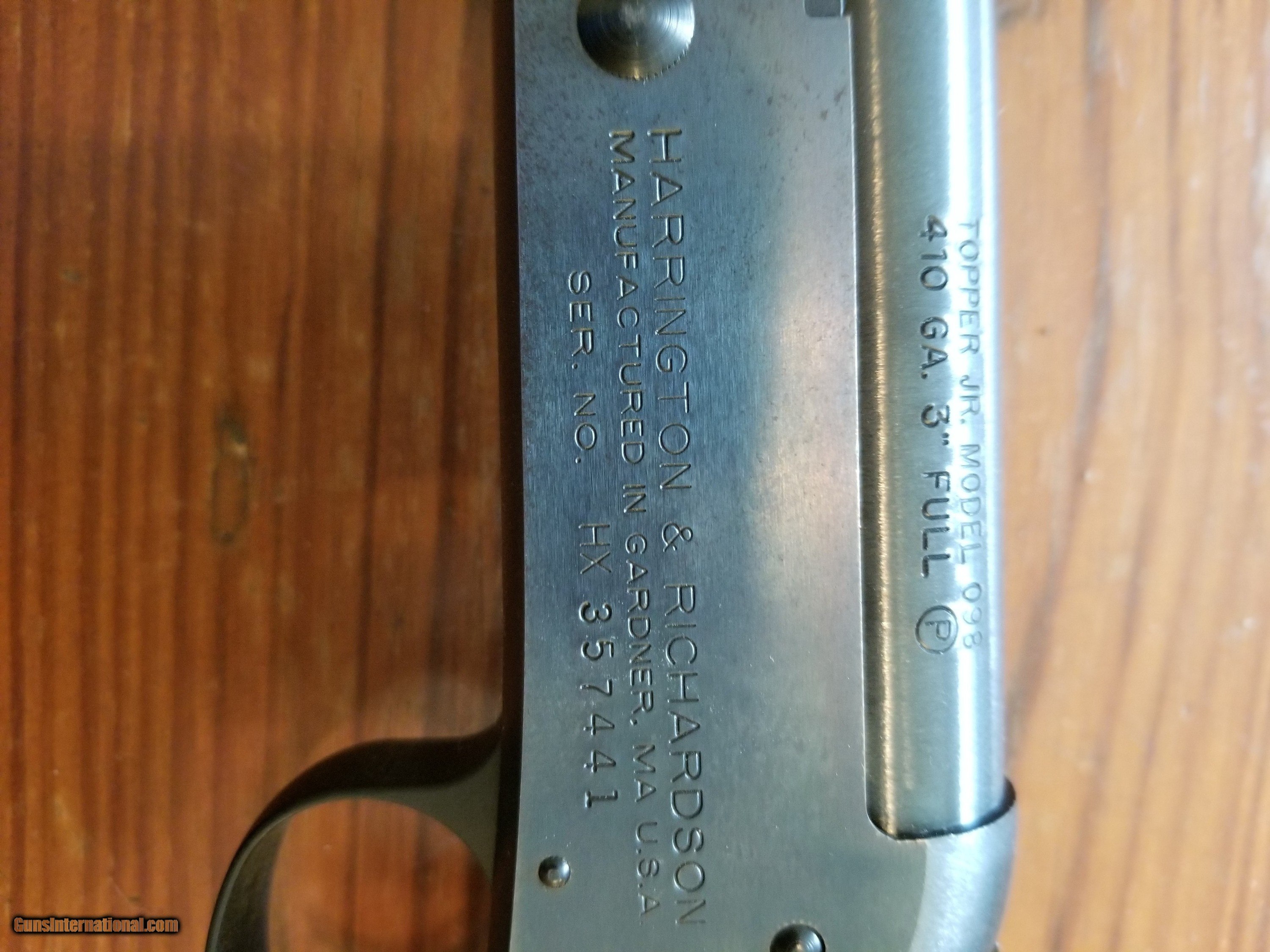 Description: Harrington and Richardson Topper Jr model 98. 22" full choke 410 bore. 13.5" length of pull. Excellent condition shot very little. clean bore , no pitting no scratches or marks anywhere. USPS money order for payment $40 shipping to the lower 48. SOLD Shotgun Gauge: .410 Gauge Manufacturer: Harrington and Richardson Model: 98 Barrel Length: 22 Chambers: 3" Condition: Excellent Metal Condition: Excellent Wood Condition: Excellent Bore Condition: Excellent Action: Single shot hammer LOP: 13.5 Chokes: Full Item Location: 22840 |