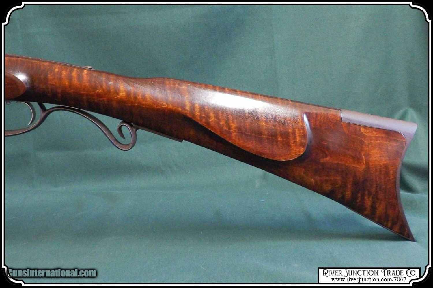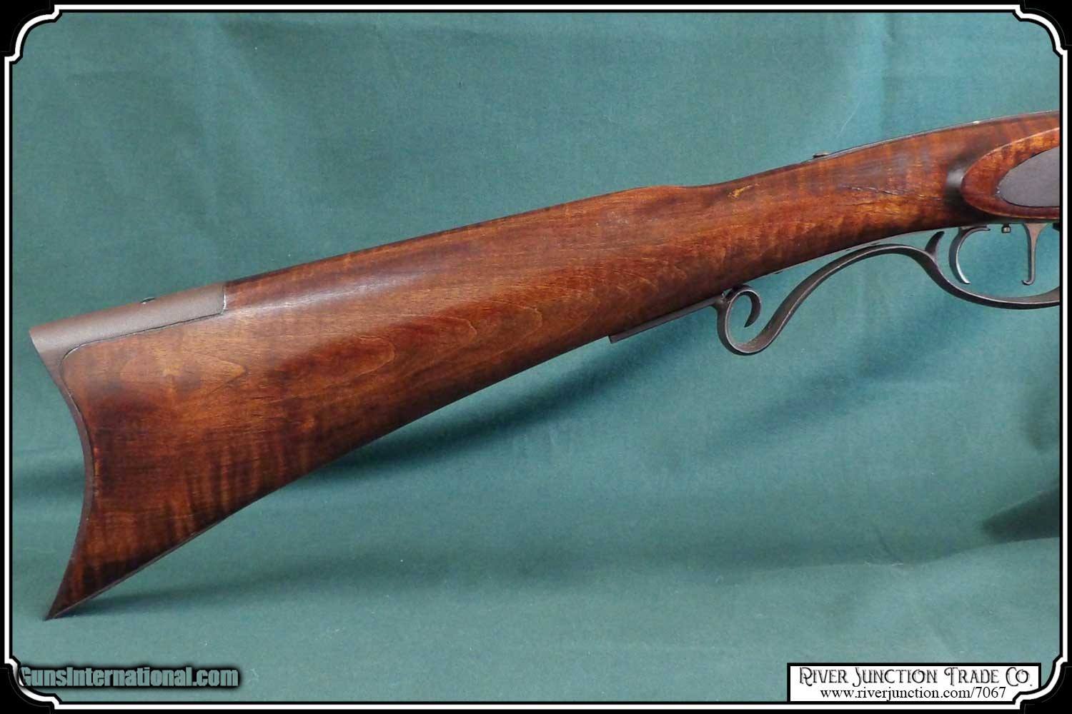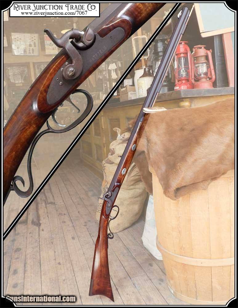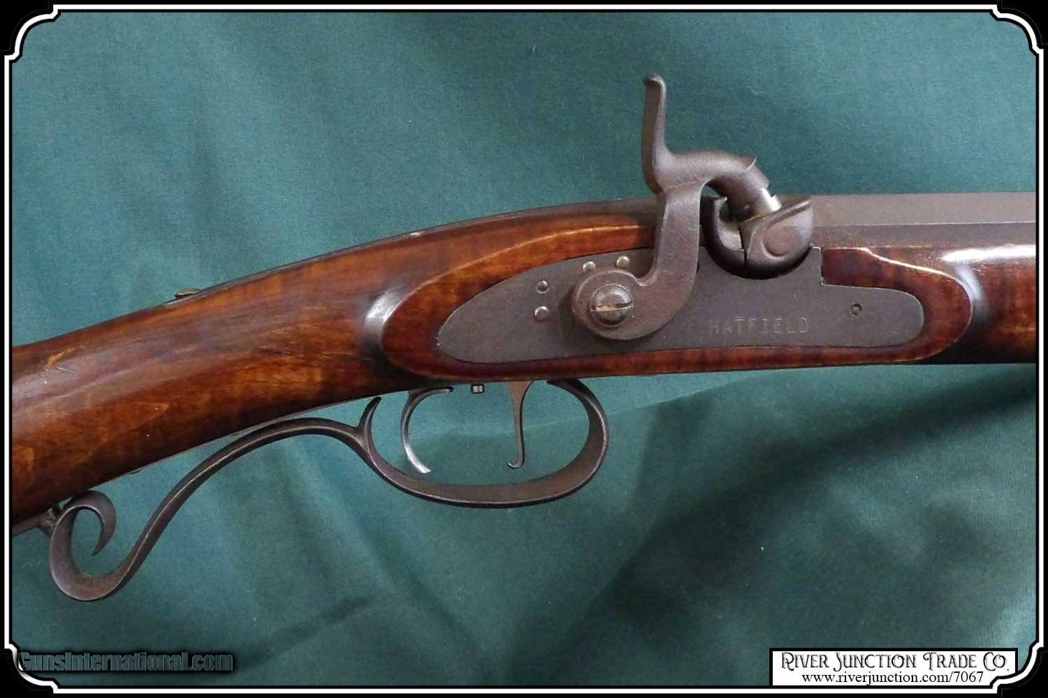 Description: This is an American made Hatfields from the late 1970's and far supieor than the Pedersoli import made under the Hatfield name. The Pedersoli Hatfields have "the black powder warning on the barrel" this one does not. It is the original American made gun. You don't see these come up for sale. This .54 caliber rifle has a perfectly browned octagon 1" x 32" barrel with 1:66 twist and fitted with fixed sights. The P+ grade Maple stock is mounted with browned steel and German silver furniture. The L&R percussion lock with Hatfield stamped on the plate is activated by L&R double set triggers. Length of pull is 14-1/2", overall length is 49”, and weight is 8.8 lbs. Good wood to metal fit - made by Tom Hatfield. This Rifle is a shootable recreation of the golden era of American made historic percussion and flint rifles and likely will be the last of the breed. SOLD |