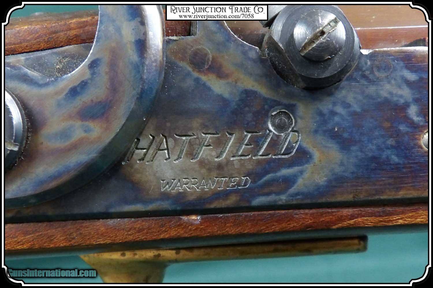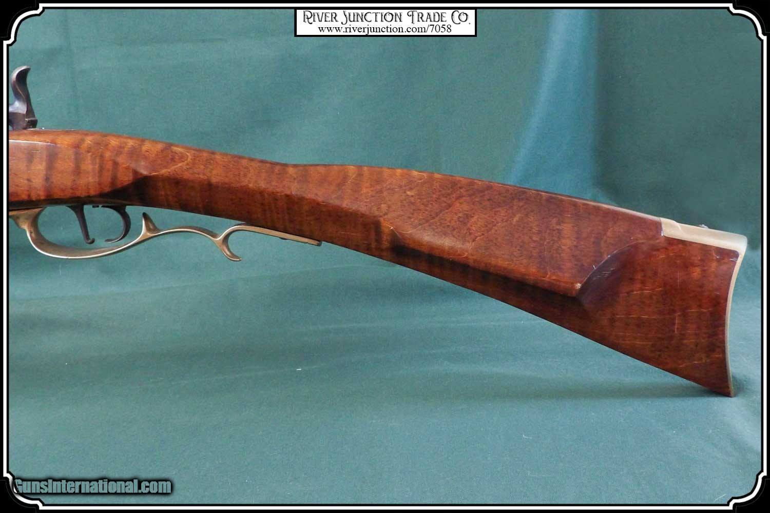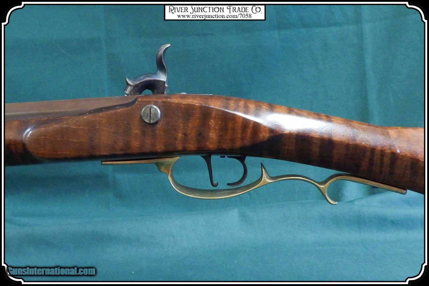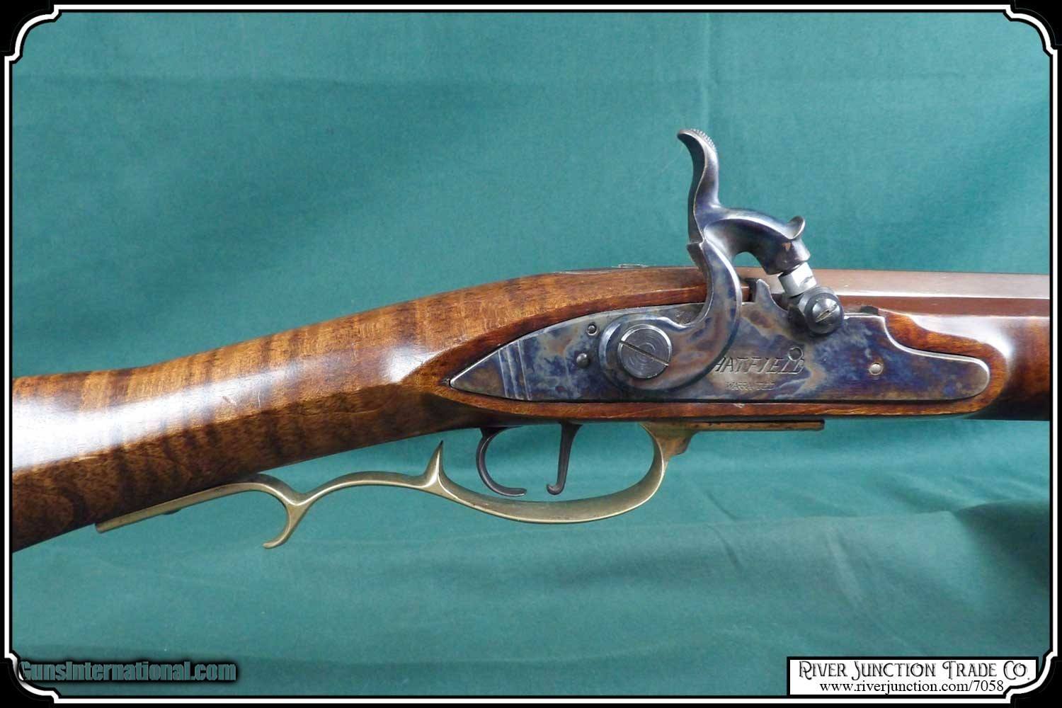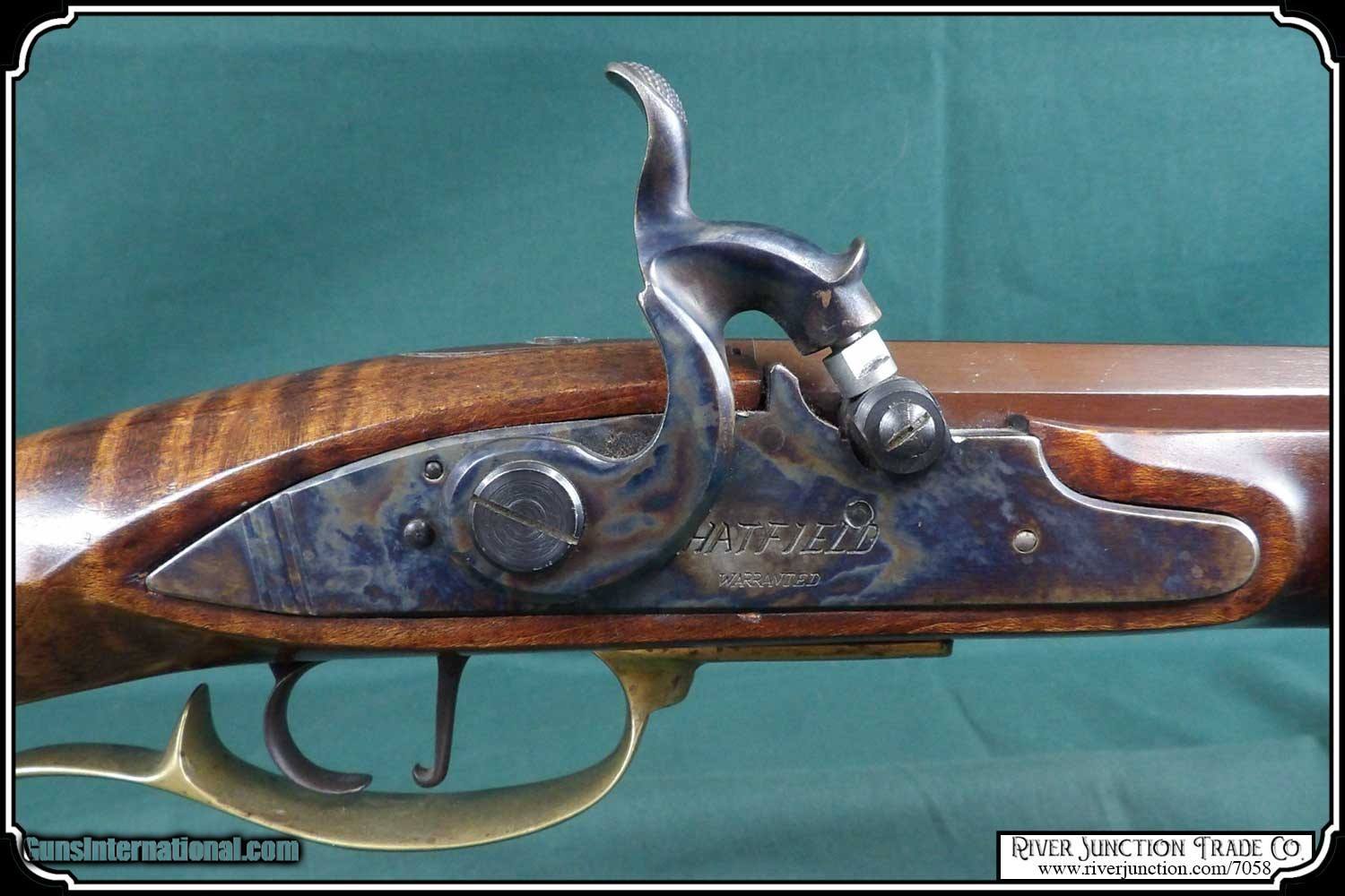 Description: Ted Hatfield Full-Stock Percussion Kentucky Style Long Rifle Back in the late 1970s, Ted Hatfield began building a pretty good reproduction Kentucky-style rifle in St. Joseph, Missouri and this is one of those. This Hatfield .50 caliber percussion full-stock rifle with strongly tiger striped stock, buckhorn sights, and double set triggers. The locks and triggers are made by L & R Lock Company. The barrel and the lock have Hatfield stamped on them. The overall length is 55 inches with a 14 inch pull and 3+-inch drop at the heel. This is a rifled octagonal.50 calibers with a 1:70 twist. The 39 inch barrel is browned. Very good plus. The bore is very good, and the action is crisp SOLD |