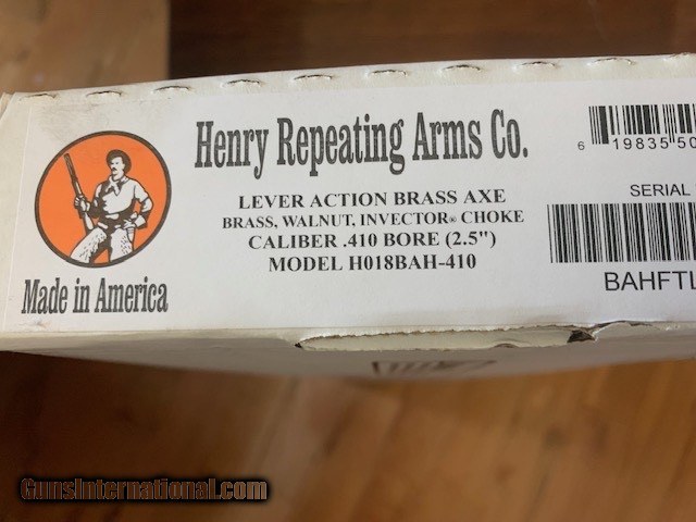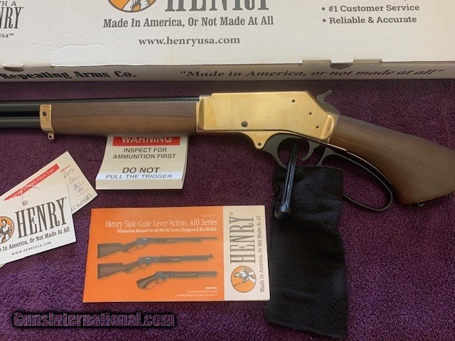 HENRY BRASS AXE 410 GA. LEVER ACTION, WALNUT STOCK, INVECTOR CHOKE, NEW IN THE BOX