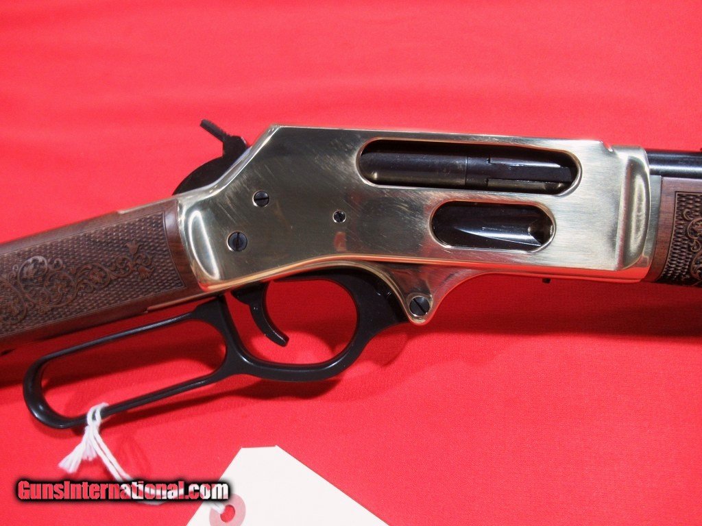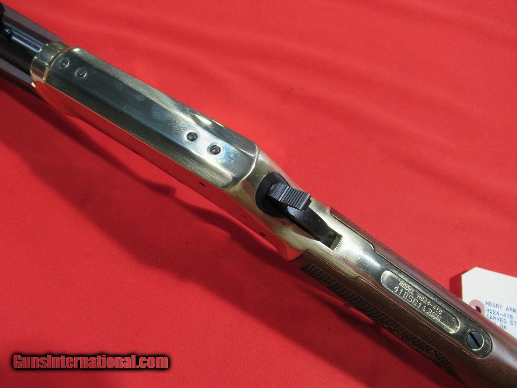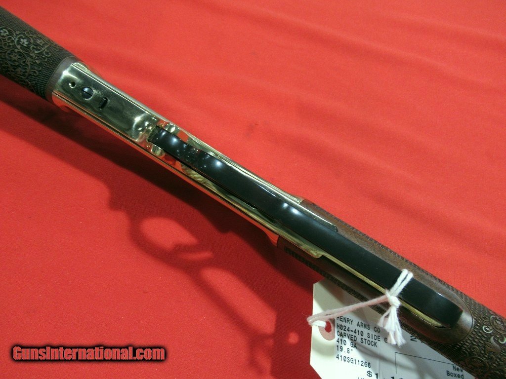 Description: NEW Henry H024-410 Side Gate lever action shotgun, brass frame, round barrel, 2 1/2" chamber, 6 round capacity. SOLD |