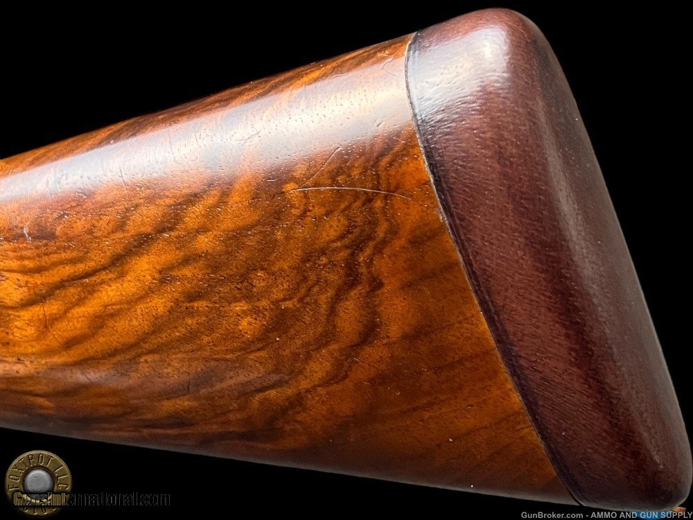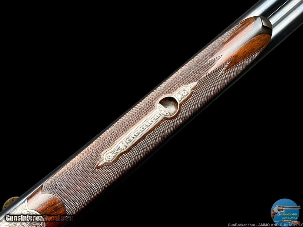 Description: SOLD!! - TO ANOTHER SATISFIED CLIENT -- PLEASE SEE OUR OTHER FINE FIREARM LISTINGS -- STUNNING PRE-WAR HEYM DELUXE GRADE 4A 20 GA - GAME SCENE ENGRAVED - SXS MANUFACTURER - HEYM - SUHL GERMANY MODEL - DELUXE GRADE 4A GAME GUN ACTION - SIDEPLATED BOXLOCK WITH COCKING INDICATORS, DOUBLE TRIGGERS, EJECTORS AND AUTOMATIC SAFETY SN - 26194 GAUGE - 20 GAUGE 2¾" BARREL LENGTH - 28" CHOKED - IMPROVED CYLINDER .008" OF RESTRICTION(RIGHT BARREL) - MODIFIED .018" OF RESTRICTION(LEFT BARREL) CAPACITY – 2 DAC -1½" DAH -2½" LOP - 14 1/8" WEIGHT - 5 LB 11.6 OZ SIGHTS - SOLID MATTED RIB WITH SILVER FRONT BEAD PRODUCED - MAY 1932 The pre-war Heym Deluxe Grade 4A 20-gauge side-by-side game gun, serial number 26194, is a true masterpiece of German craftsmanship, produced in Suhl, Germany, in May 1932. This exceptional firearm is a rare find, blending functional elegance with artistic excellence, making it a highly desirable collector’s item and an heirloom-quality sporting gun. This Grade 4A model features a sideplated boxlock action with cocking indicators, double triggers, ejectors, and an automatic safety. The solid build incorporates double underbites, a doll's head third fastener, and sideclips, ensuring a secure lock-up and reliable operation. The 28-inch barrels are constructed from Krupp fluid steel, marked "FR. WILH HEYM" on the right, "GRADE 4 - KRUPP FLUID STEEL BARRELS" on the rib, and "SUHL GERMANY" on the left. The gun is choked Improved Cylinder (.008” restriction) in the right barrel and Modified (.018” restriction) in the left barrel, making it versatile for upland bird hunting or clay shooting. Weighing a mere 5 pounds, 11.6 ounces, the gun is perfectly balanced for all-day carry in the field. The engraving on this Heym is nothing short of stunning, featuring meticulously hand-engraved game scenes on the sideplates. The left plate depicts a German Shorthaired Pointer intently pointing at three partridge, while the right plate shows a Labrador Retriever flushing five ducks. Deep relief carved bolsters, along with foliate scrollwork and vine patterns, adorn the remainder of the action and barrels, showcasing the artistry of Suhl’s master engravers. The beautifully figured European walnut stock and forend are equally breathtaking, boasting a rich grain pattern and an impeccable hand-oil finish. The sharp multipoint checkering on the pistol grip and splinter forend enhances grip while adding to the gun's elegance. Further accents include an engraved, steel pistol grip cap and a dainty ebony Schnabel tip on the forend. The stock features a leather-covered recoil pad and measures 14 1/8 inches in length of pull, with a drop at comb (DAC) and drop at heel (DAH) of 2½ inches each, ensuring comfortable handling and a natural point of aim. This firearm is in excellent overall condition, with bores that are mirror-bright and sharp rifling. The triggers are crisp, the action locks up tightly, and the ejectors operate flawlessly. The original color case hardening on the action is well preserved, highlighting the care this gun has received over its lifetime. Finding a Heym Deluxe Grade 4A in this remarkable condition is exceptionally rare, especially one of pre-war provenance. This gun is not only an exquisite tool for the field but also an investment-grade collectible. It stands as a testament to the golden age of German gunmaking and the enduring appeal of finely crafted sporting arms. Truly a gentleman’s gun, it is ready for both display and field use—a beauty to behold and a legacy to cherish. PLEASE CALL NOW - 315-689-0000 FLAT $50 S/H/I. 4%CREDIT CARD FEE APPLIES. FOXTROT IS A LICENSED FFL DEALER WITH MANY POSITIVE FEEDBACKS SO BUY WITH CONFIDENCE! MORE PHOTOS AVAILABLE UPON REQUEST. SOLD Curio/Relic: Yes Shotgun Gauge: 20 Gauge Manufacturer: F. W. HEYM Model: GRADE 4A DELUXE Serial Number: 26194 Barrel Length: 28 Bore: 20 Chambers: 2.75 Ejectors: YES Condition: EXC Metal Condition: EXC Wood Condition: EXC Bore Condition: EXC Manufacture Date: MAY 1932 Proof:Nitro: YES Minimum Wall Thickness Left: .027 Minimum Wall Thickness Right: .027 |