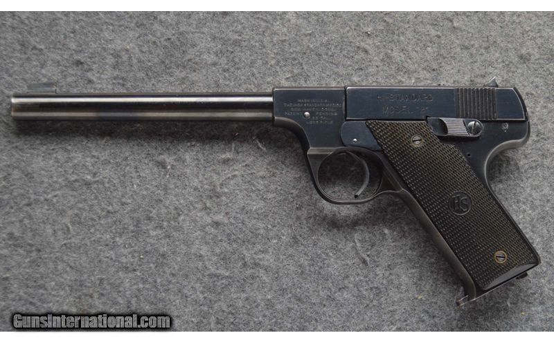 Description: This firearm is a High standard Model B chambered in .22 LR. it is a hammer less recoil operated semi auto target pistol in good condition with some blue fading on barrel and action. .22 Long Rifle SOLD Chambers: Semi-auto with a 10 round magazine. Metal Condition: Few minor handling marks and some minor wear. Barrels: 6" blue with sights. Triggers: Single. Weight: 33 oz. Sights: Notched and blade sights. Item Location: Sidney, NE |