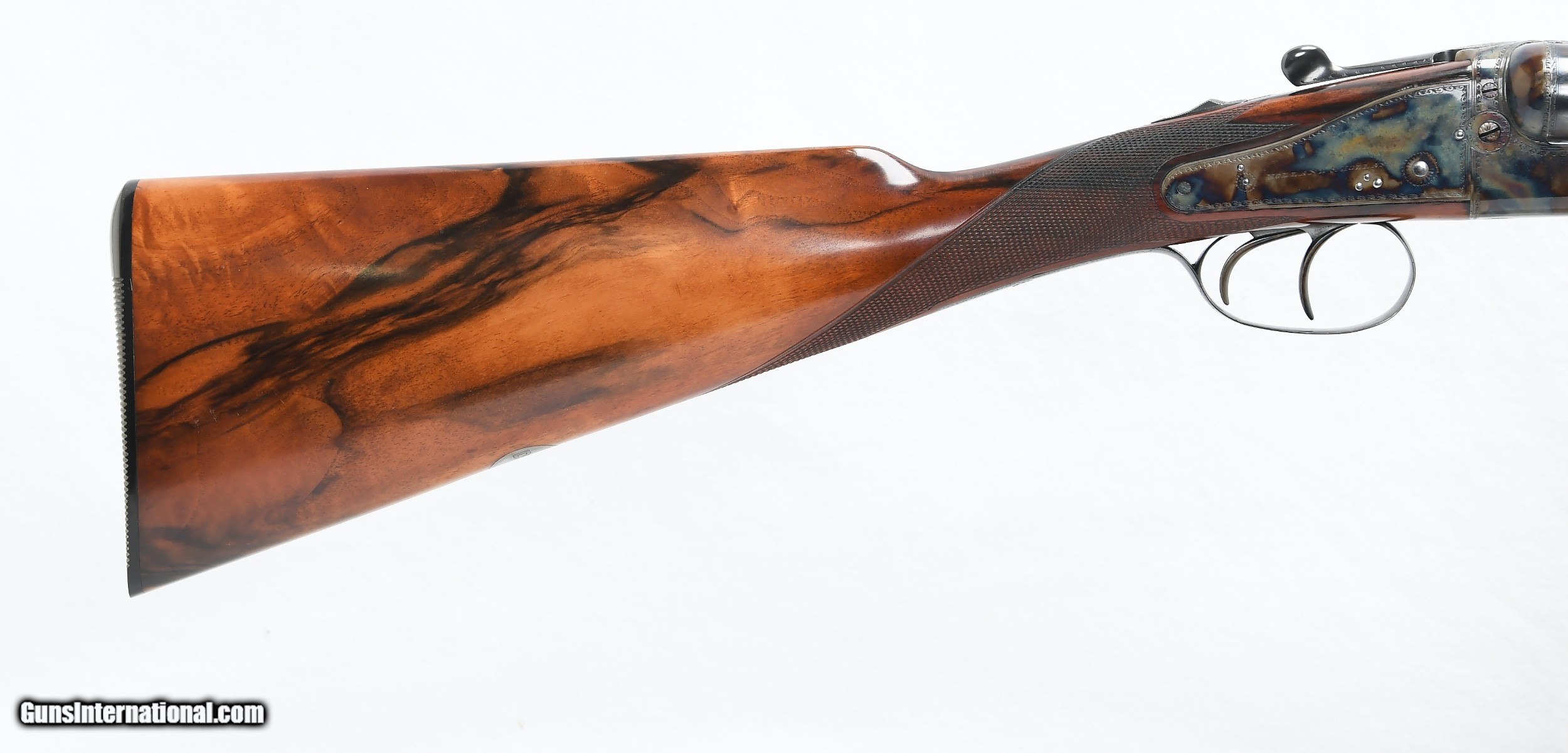 Description: Holland and Holland Dominion 12 gauge SxS back lock shotgun. Made in 1978 this Dominion is ideally configured with 28” barrels, choked .012” & .020” (IC/M) both with bright.729” bores and minimum walls of .035”; double triggers and ejectors. The gorgeous stock and splinter forearm are beautifully finished and finely checkered. The straight grip stock has a 14 3/8” LOP over the factory butt plate; with 1 7/16” DAC, 2 3/16” DAH and cast favoring a right-hand shooter of ¼” at the heel and 3/8” at the toe. All finishes appear to be original and in excellent, 98%+ condition. Mechanically perfect. Cased in what is most likely the maker’s leather luggage case with accessories. Weighs 6 lbs. 11 oz. and balances between the hands. $11,750.00 SN: 31308 SOLD |